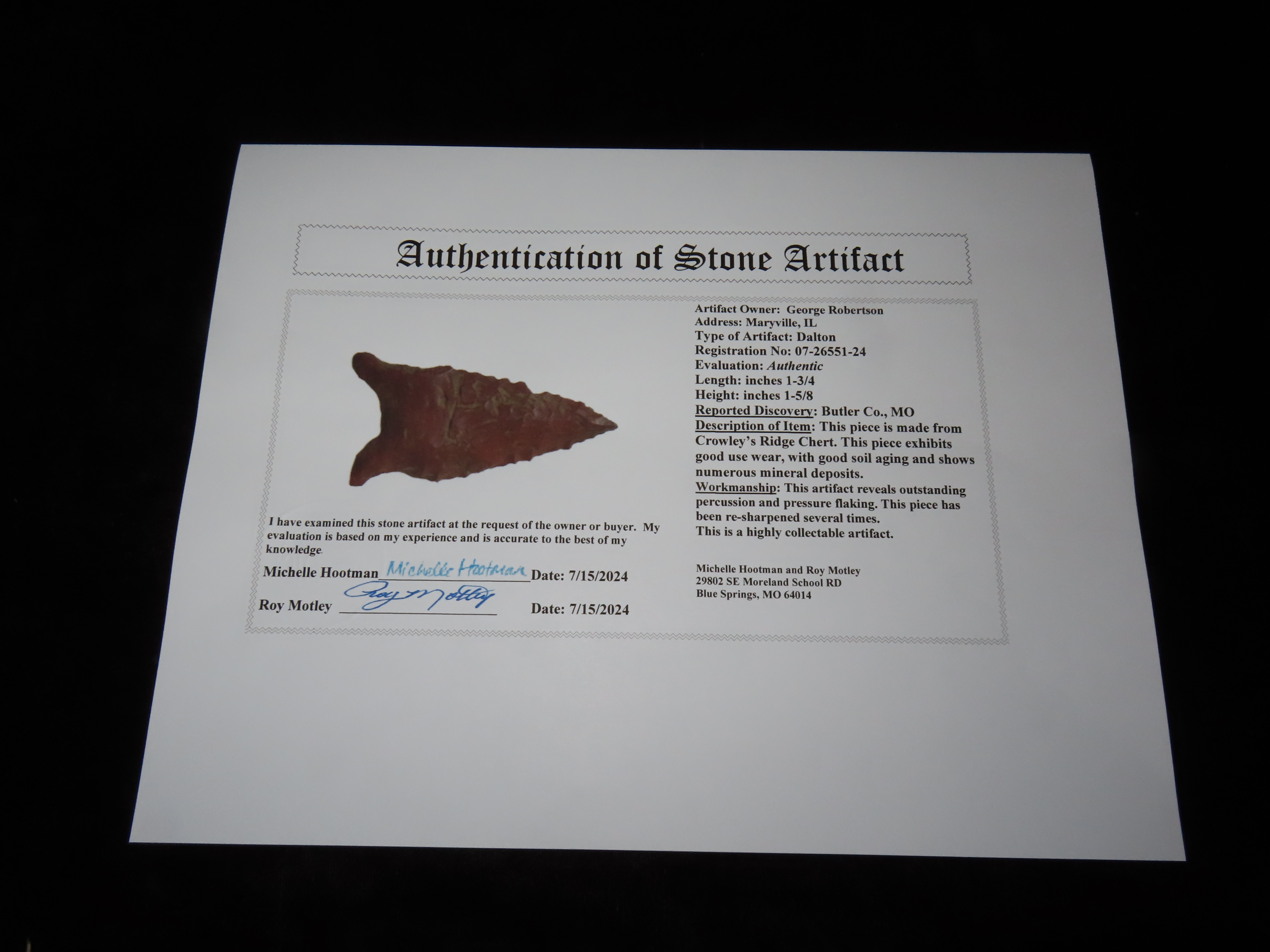 1 3/4″Crowley’s Ridge Chert Dalton, Motley COA, found in Butler Co., Missouri, Ex George Robertson Collection