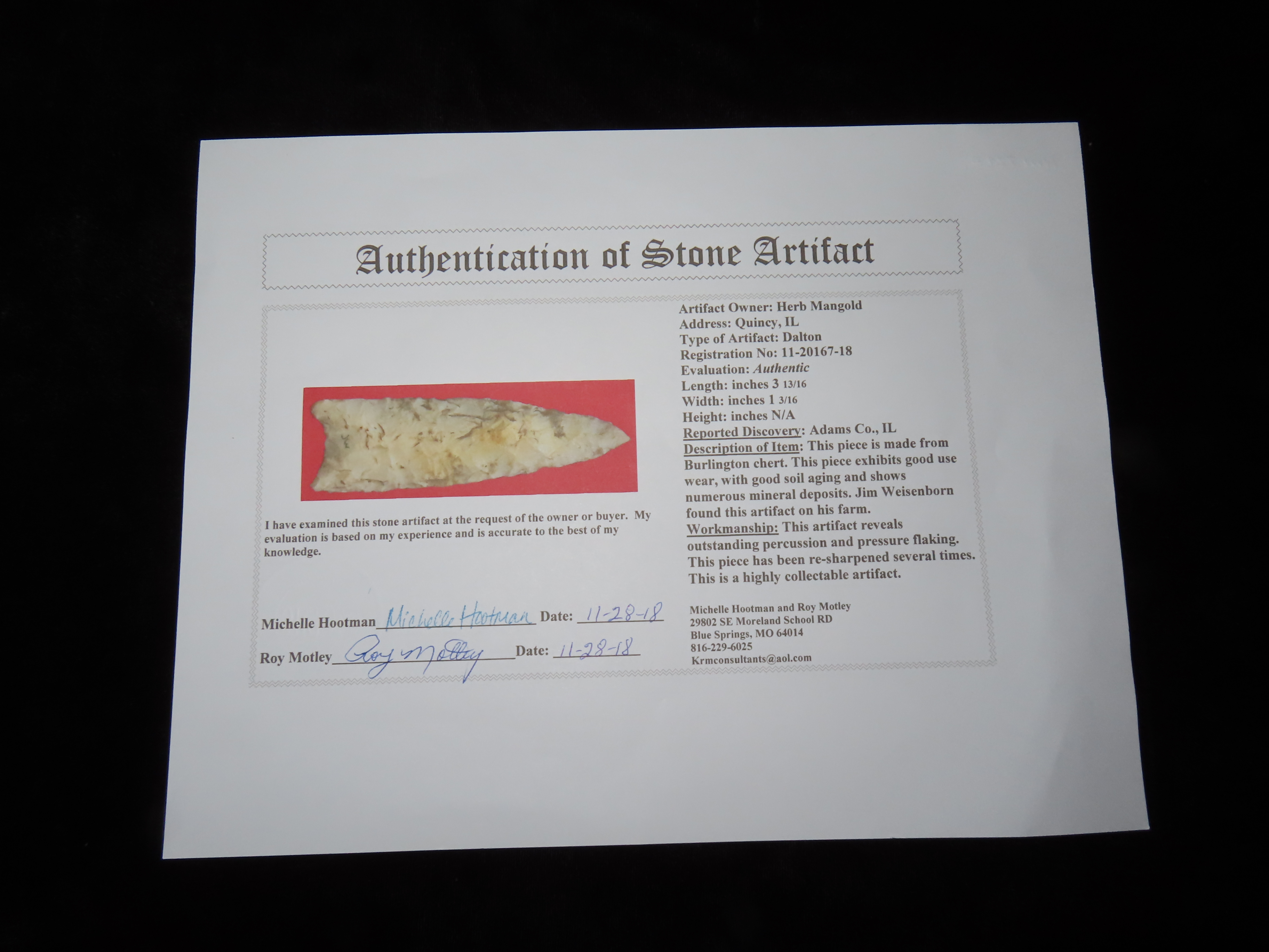 3 13/16″ Dalton, Motley COA, found in Adams Co., Illinois, Ex Herb Mangold Collection