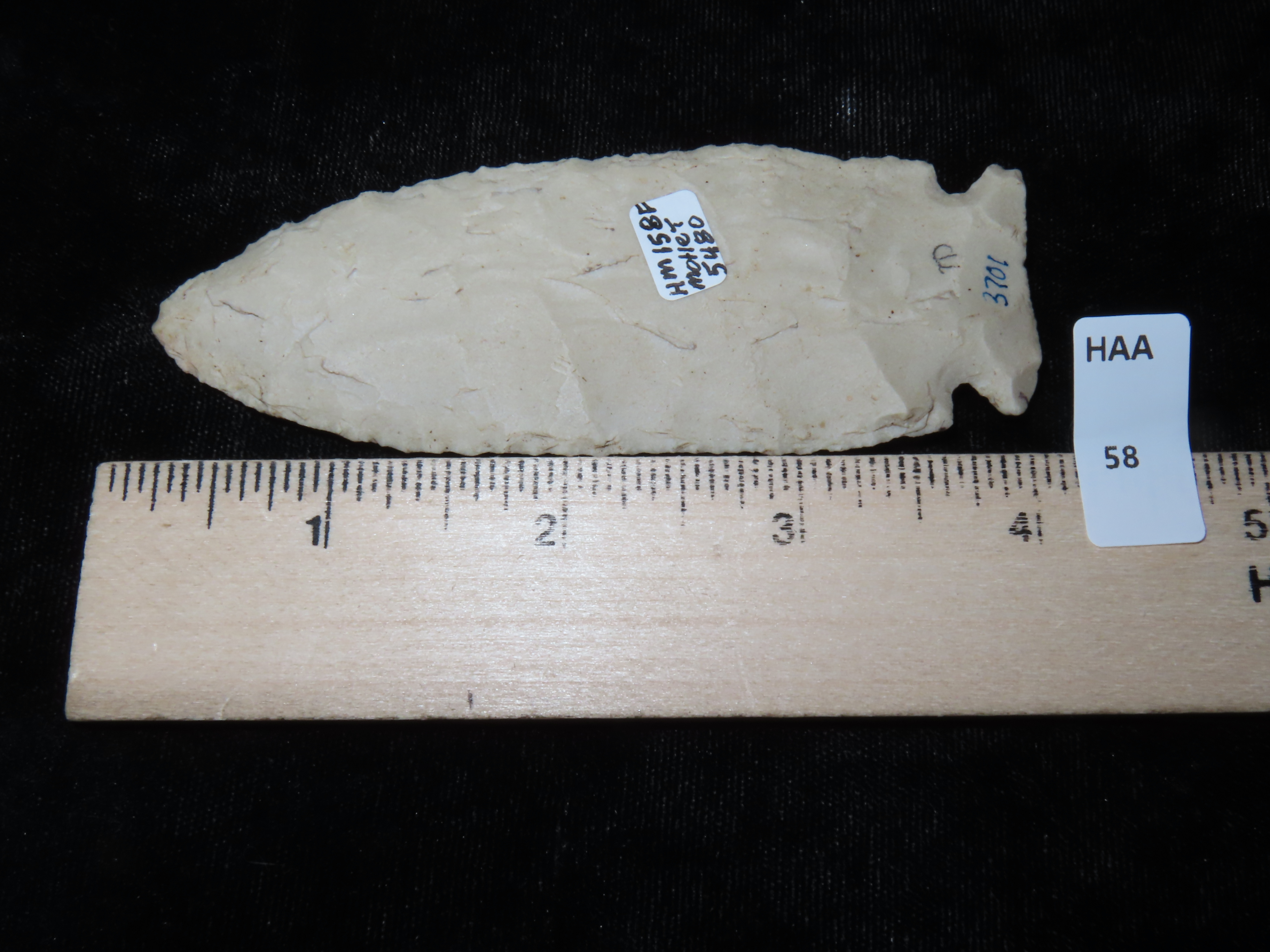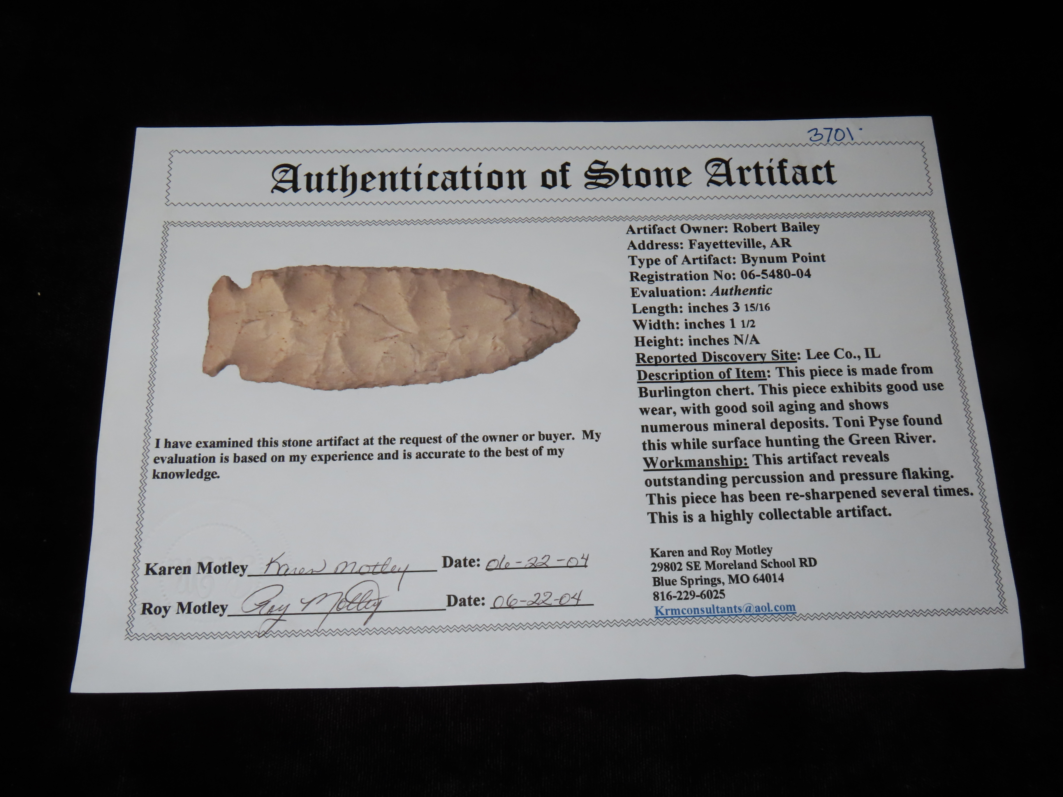 3 15/16″ Bynum Point, Motley COA, found in Lee Co., Illinois, Ex Herb Mangold Collection