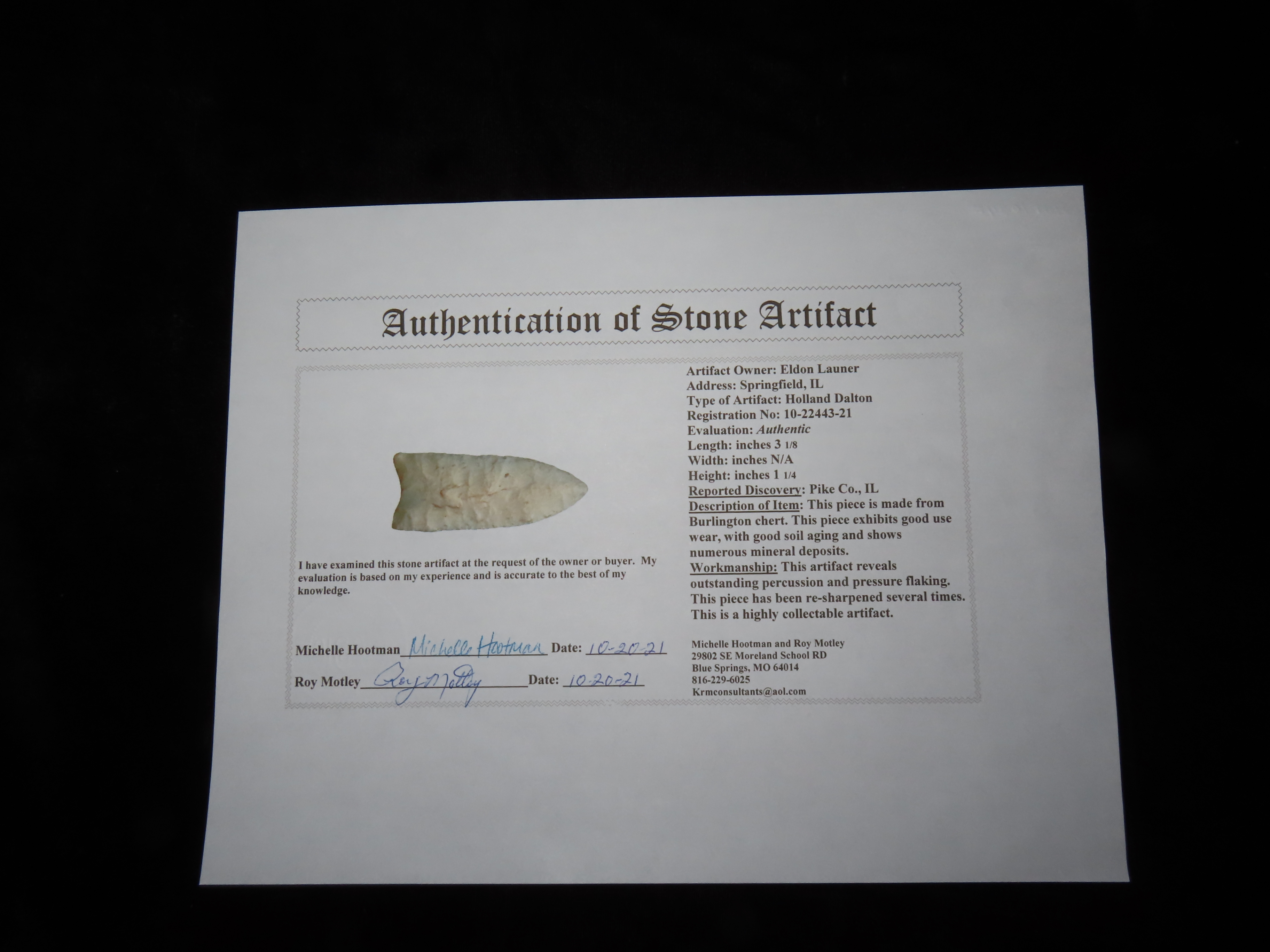 3 1/8″ Holland Dalton, Motley COA, found in Pike Co., Illinois, Ex Herb Mangold Collection