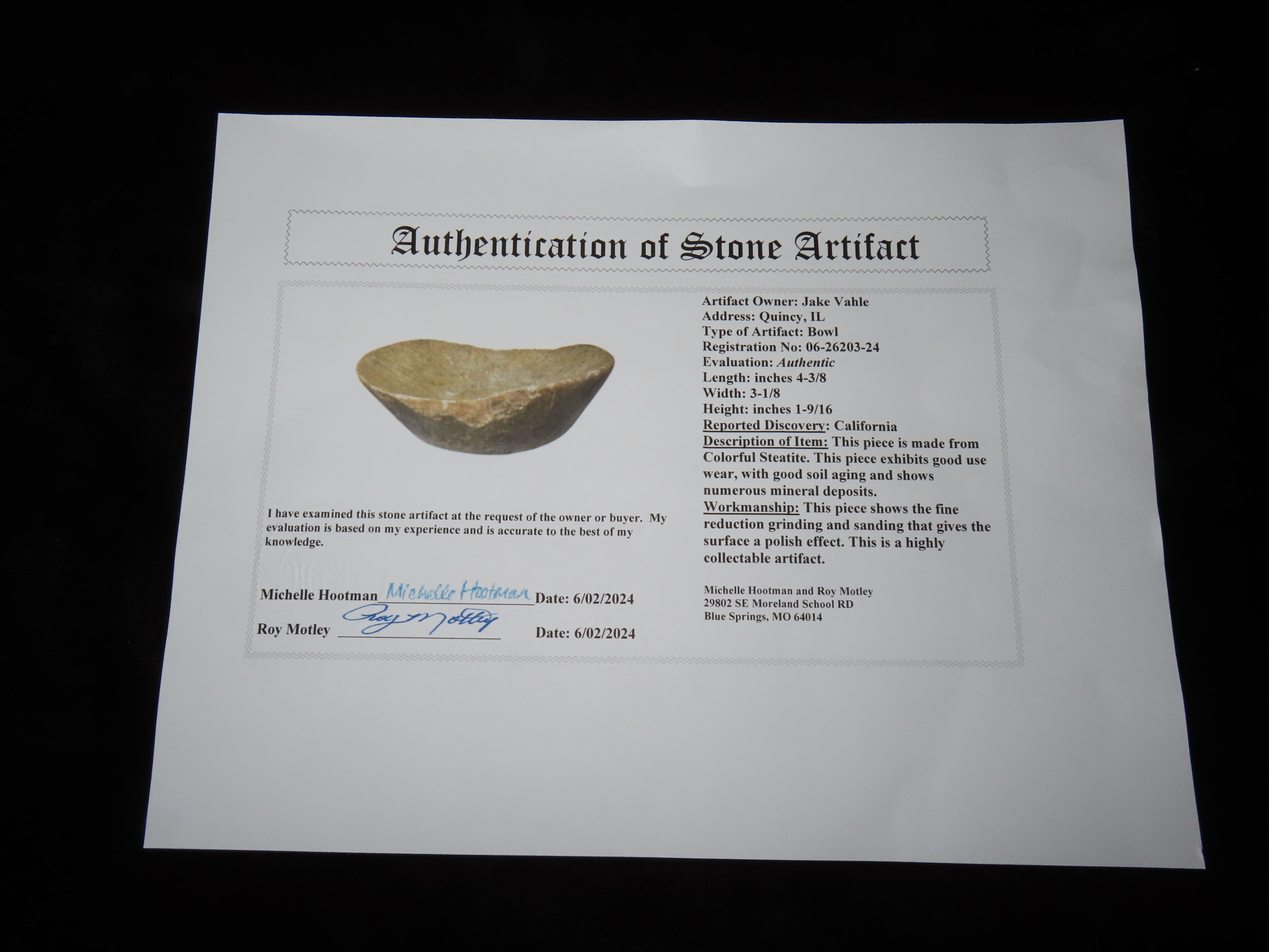 4 3/8″ Steatite Bowl, Motley COA, found in California