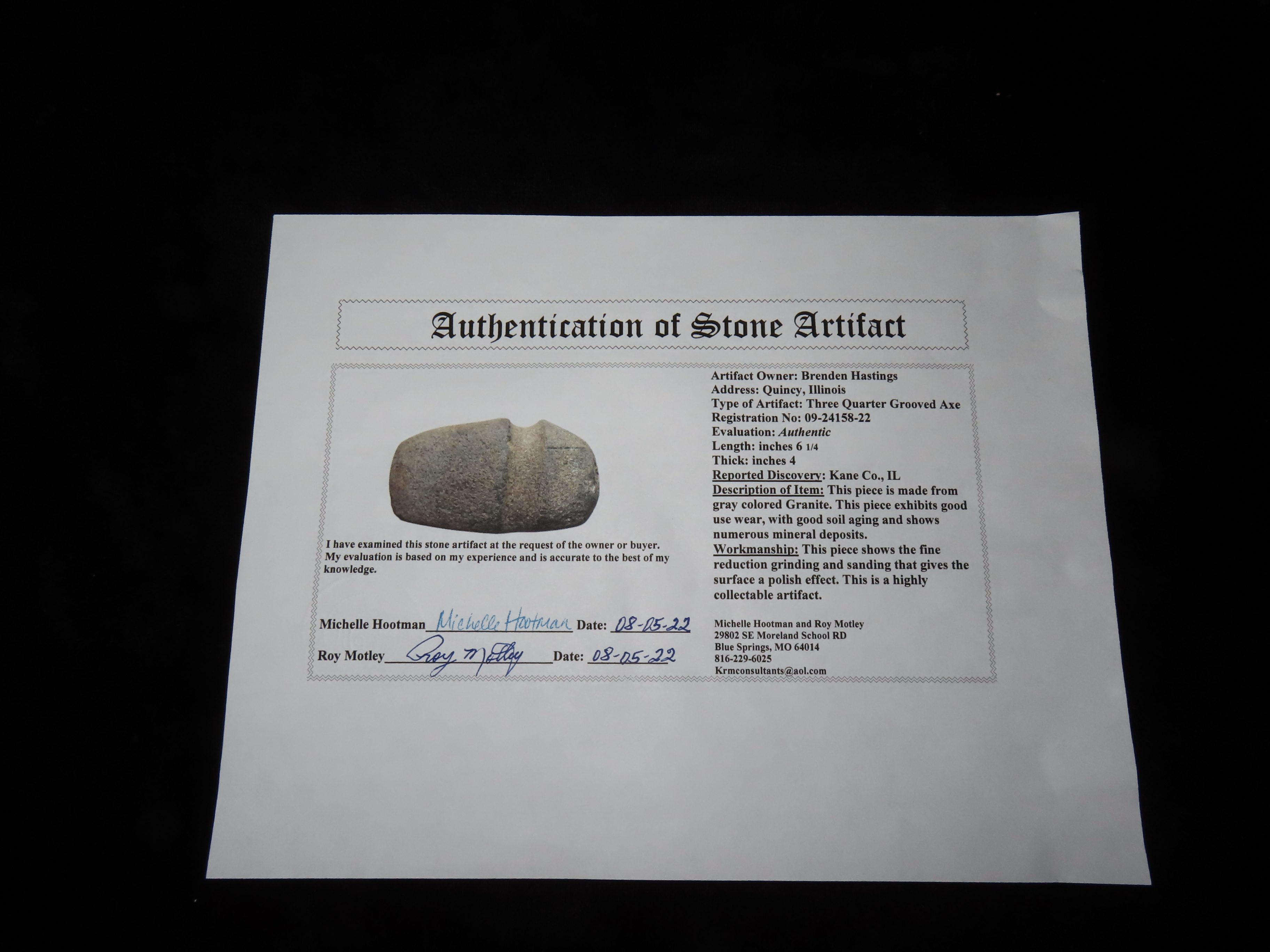 6 1/4″ 3/4-Groove Axe, Motley COA, found in Kane Co., Illinois