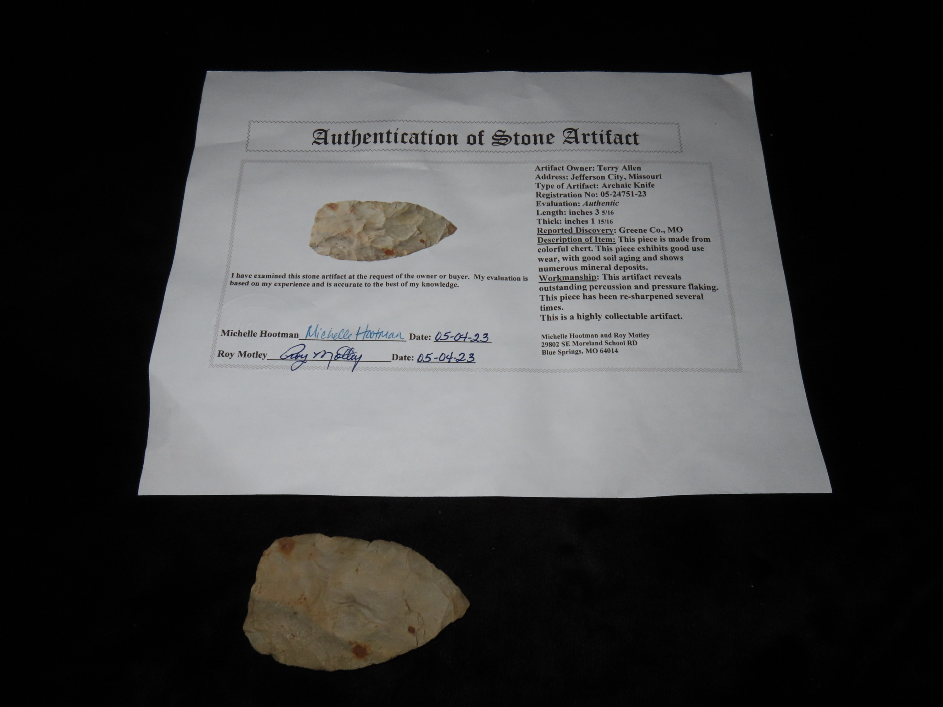 3 5/16″ Archaic Knife, Motley COA, found in Greene Co., Missouri, Ex Terry Allen