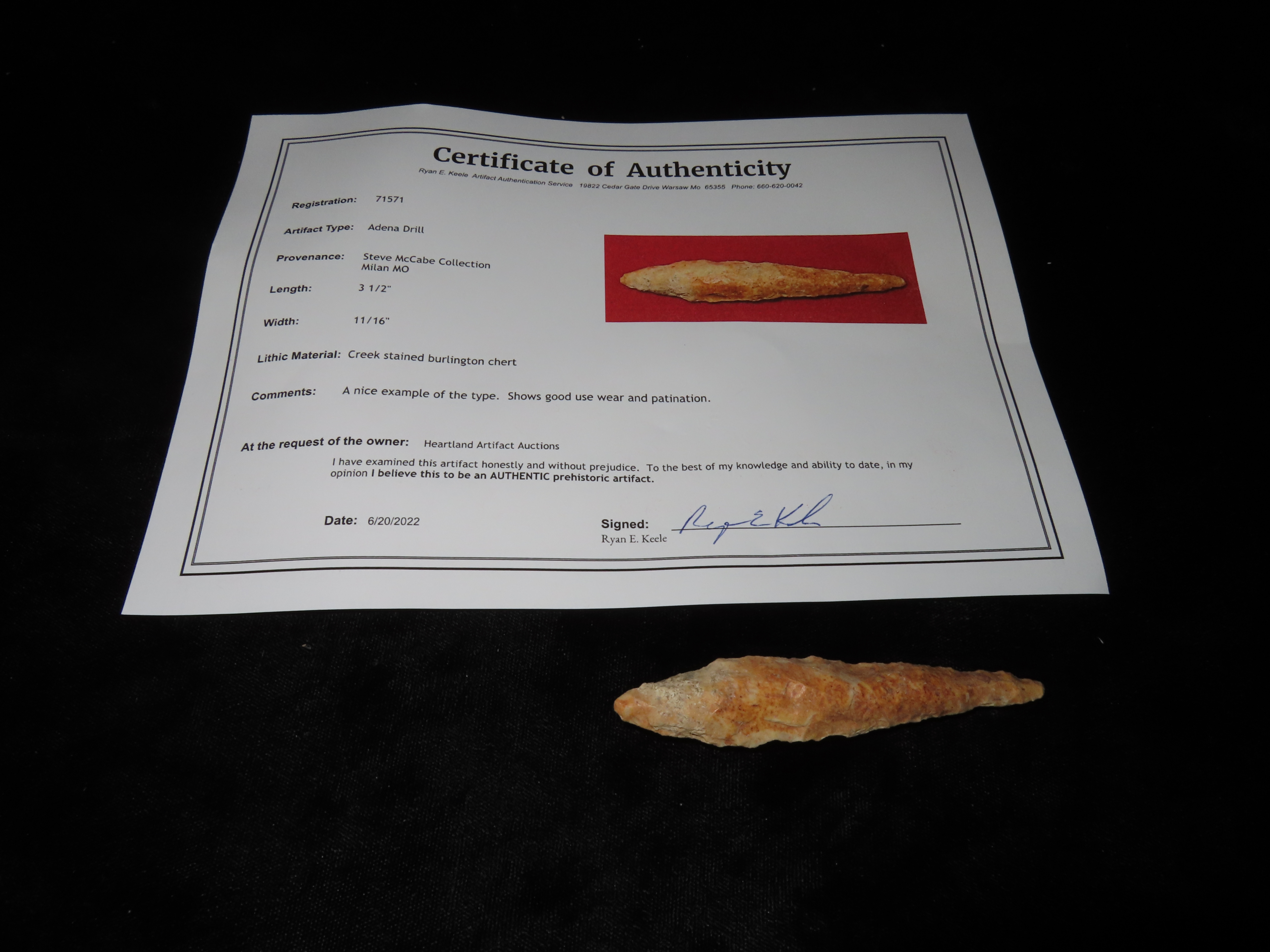 3 1/2″ Adena Drill, Keele COA, Ex Steve McCabe, Sullivan Co., Missouri