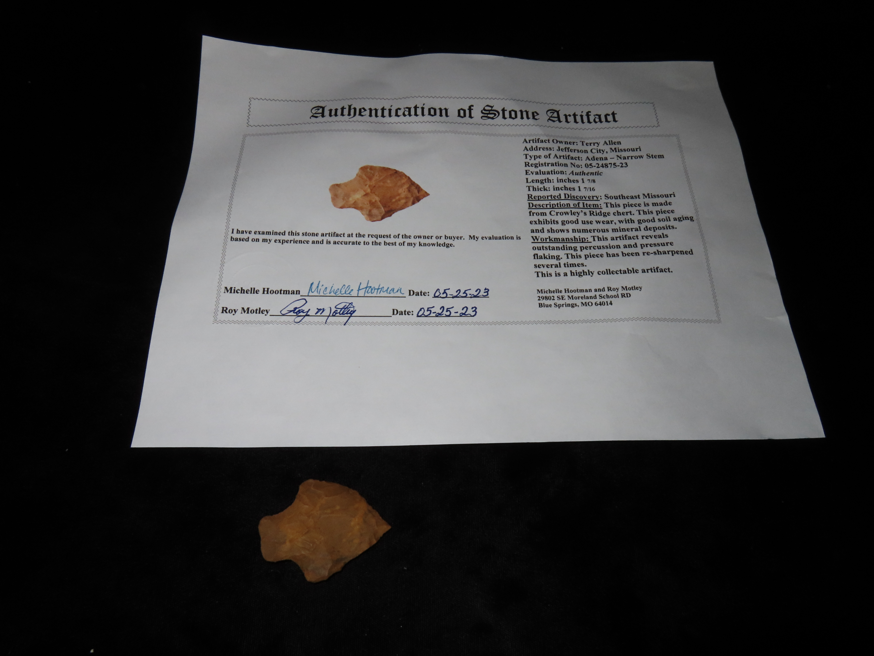 1 7/8″ Adena- Narrow Stem, Motley COA, found in Southeast Missouri, Ex Terry Allen
