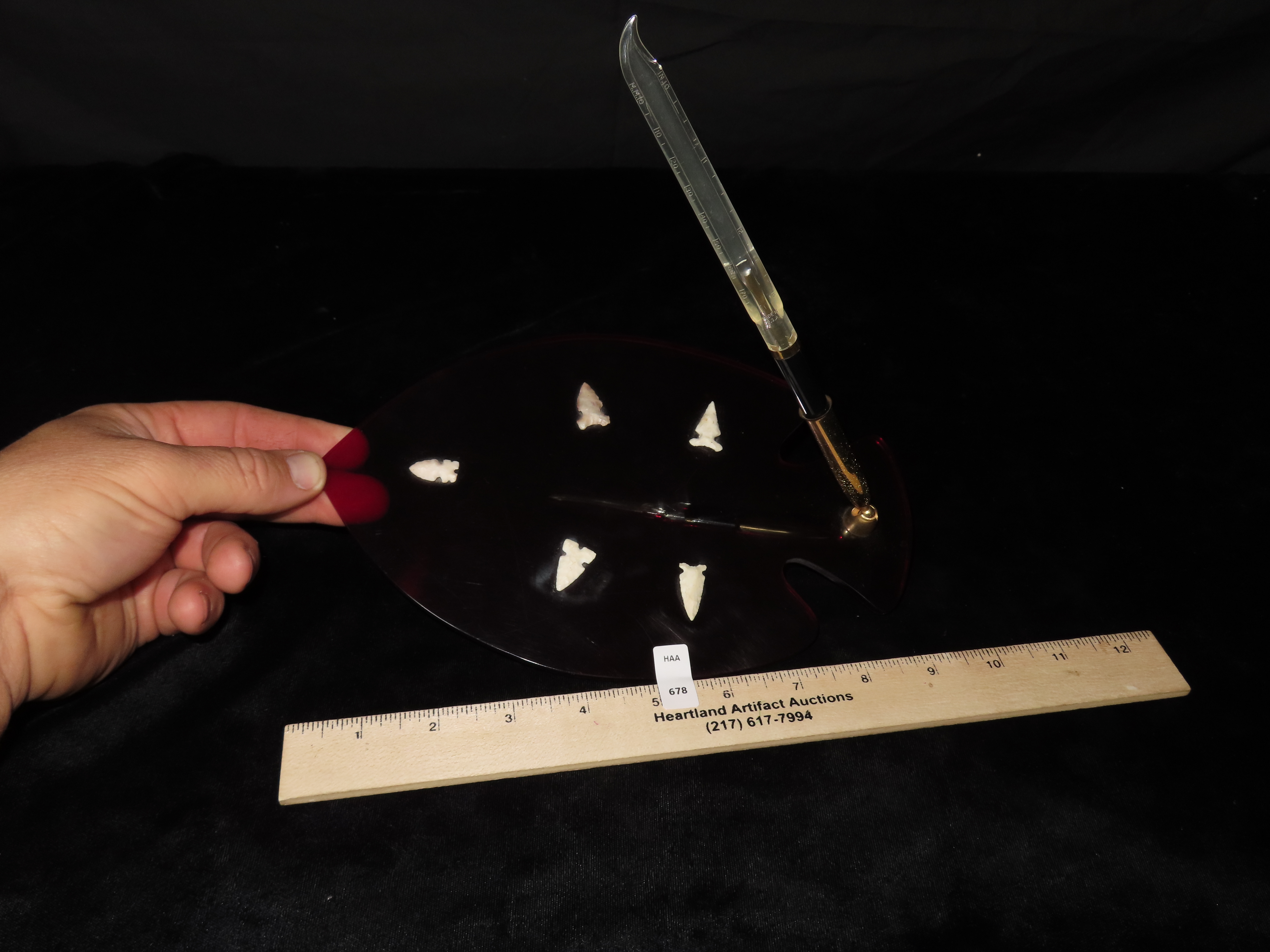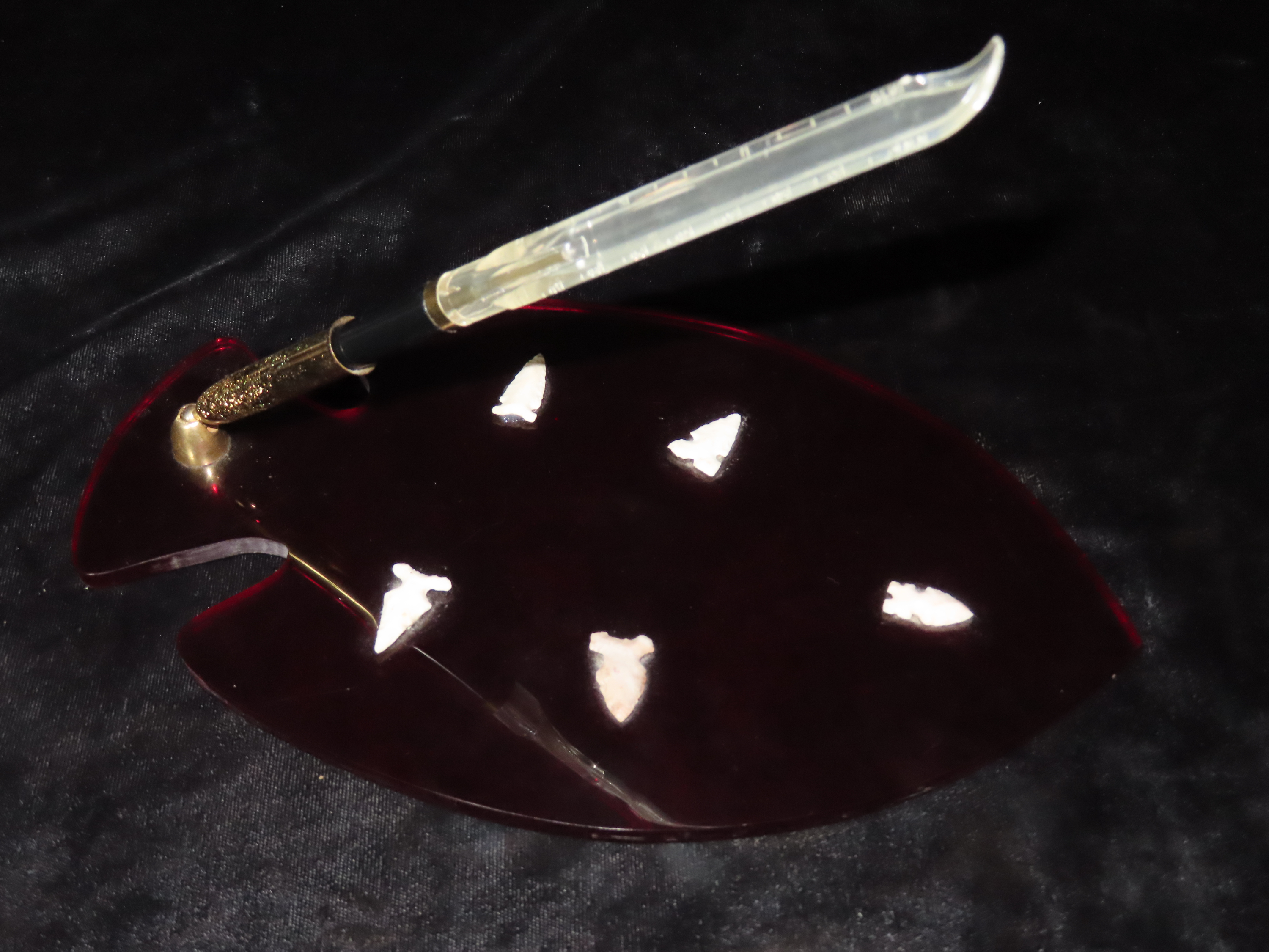 Vintage Desk Set- Clear Lucite Pen/Letter Opener on Red Arrowhead Shaped Lucite Base, decorated with Birdpoints