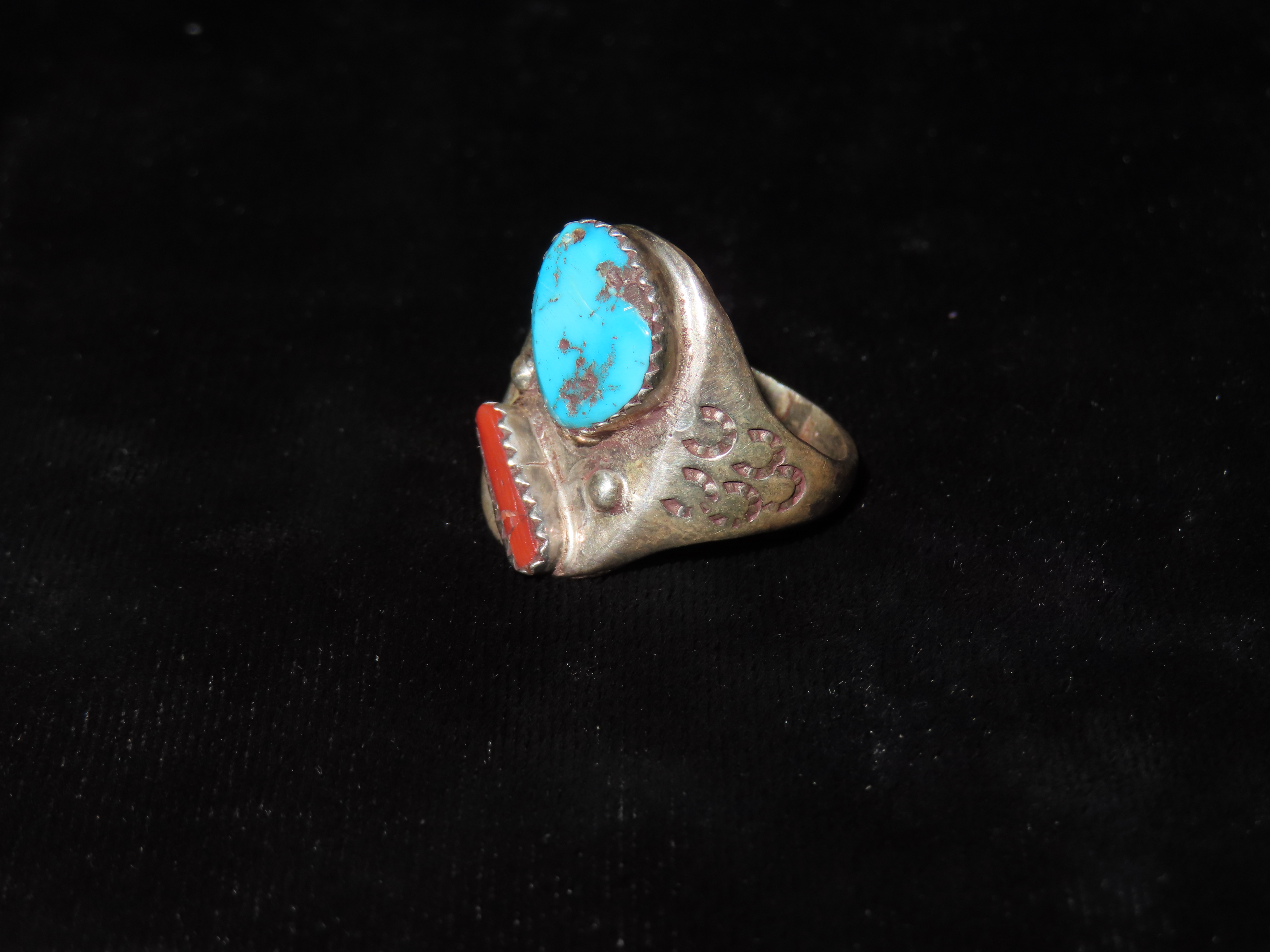 Native American inspired Silver metal ring, featuring turquoise and coral color stones