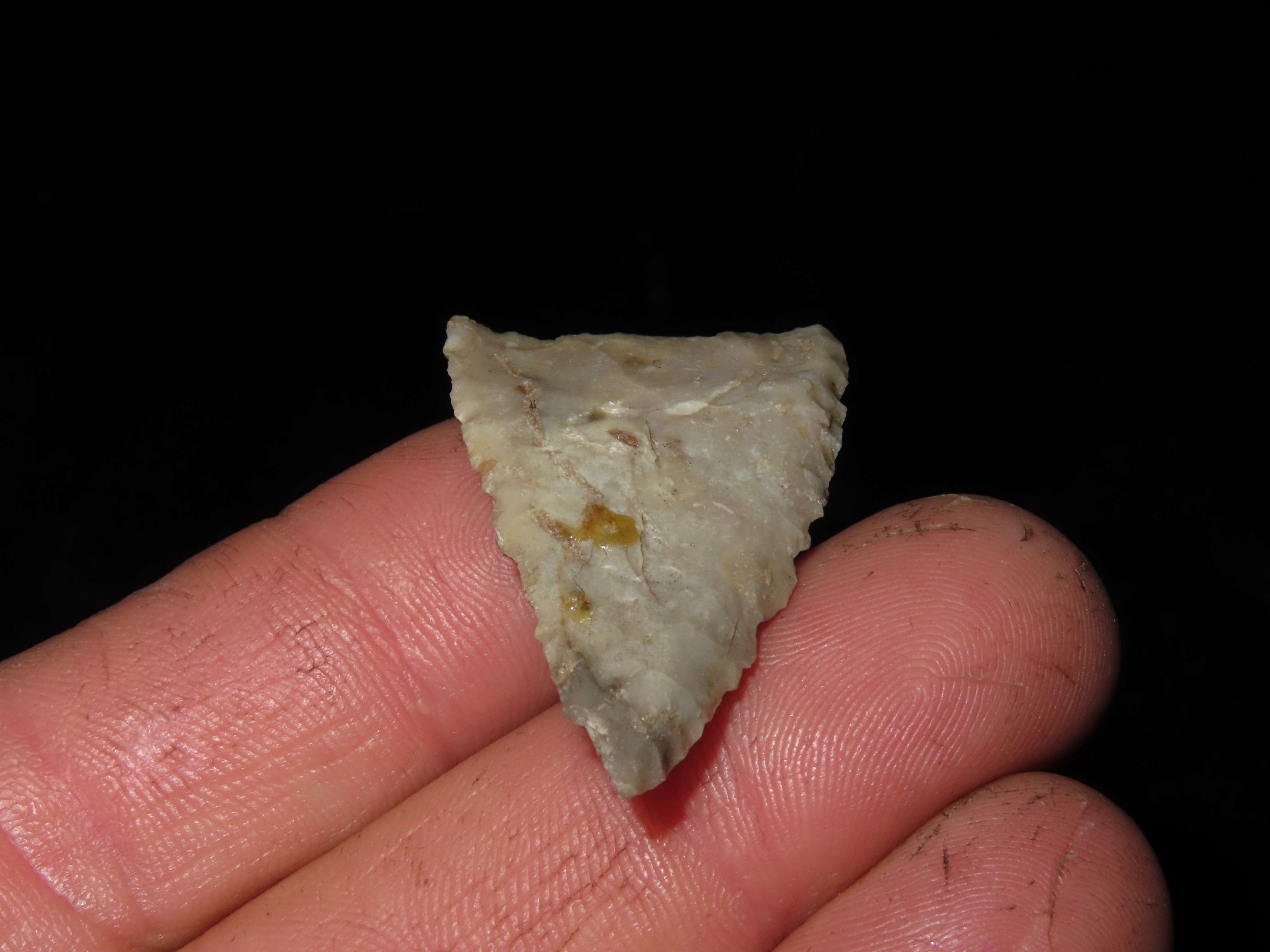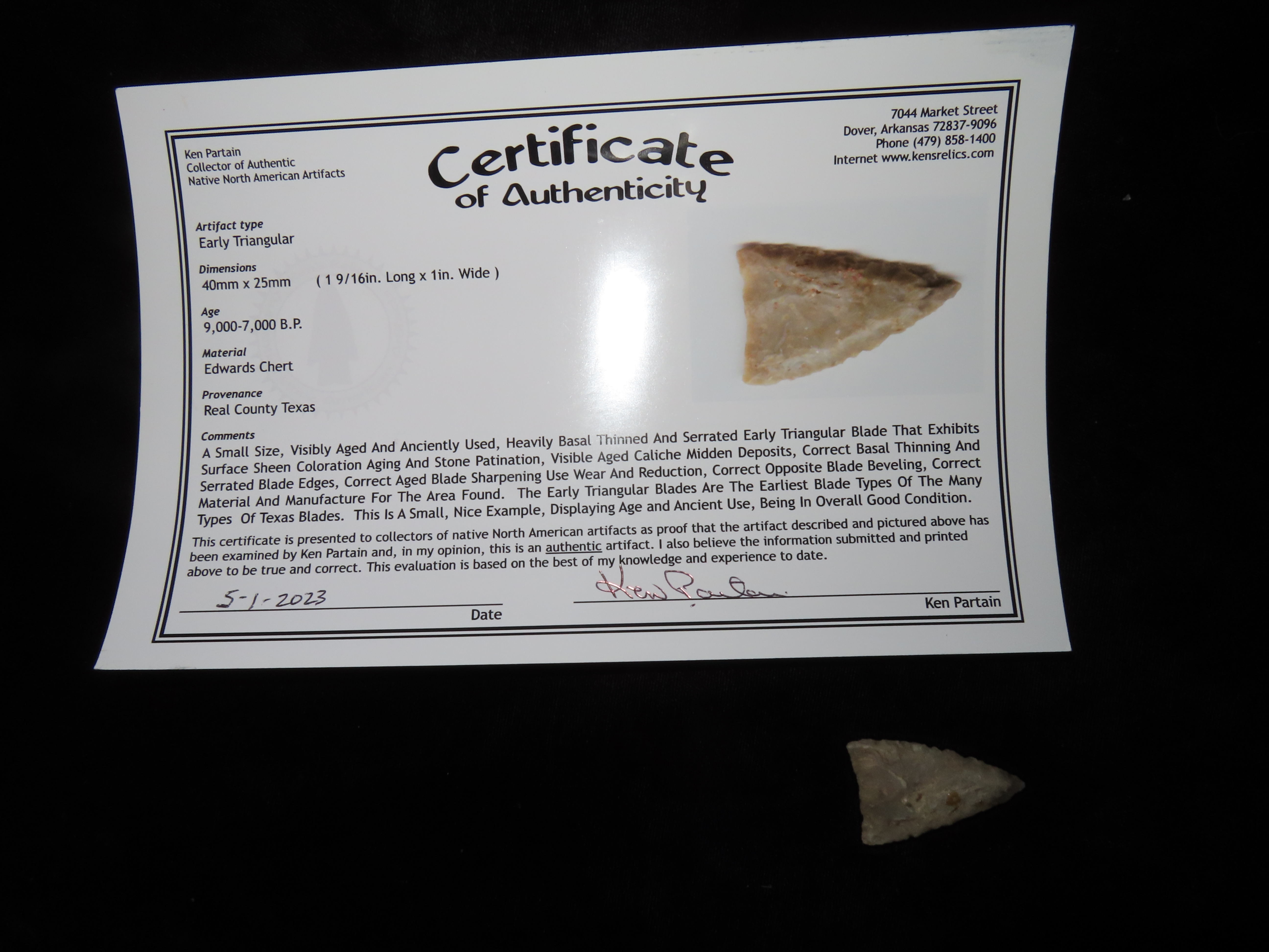 1 9/16" Early Triangular Point, Partain COA, found in Real Co., Texas