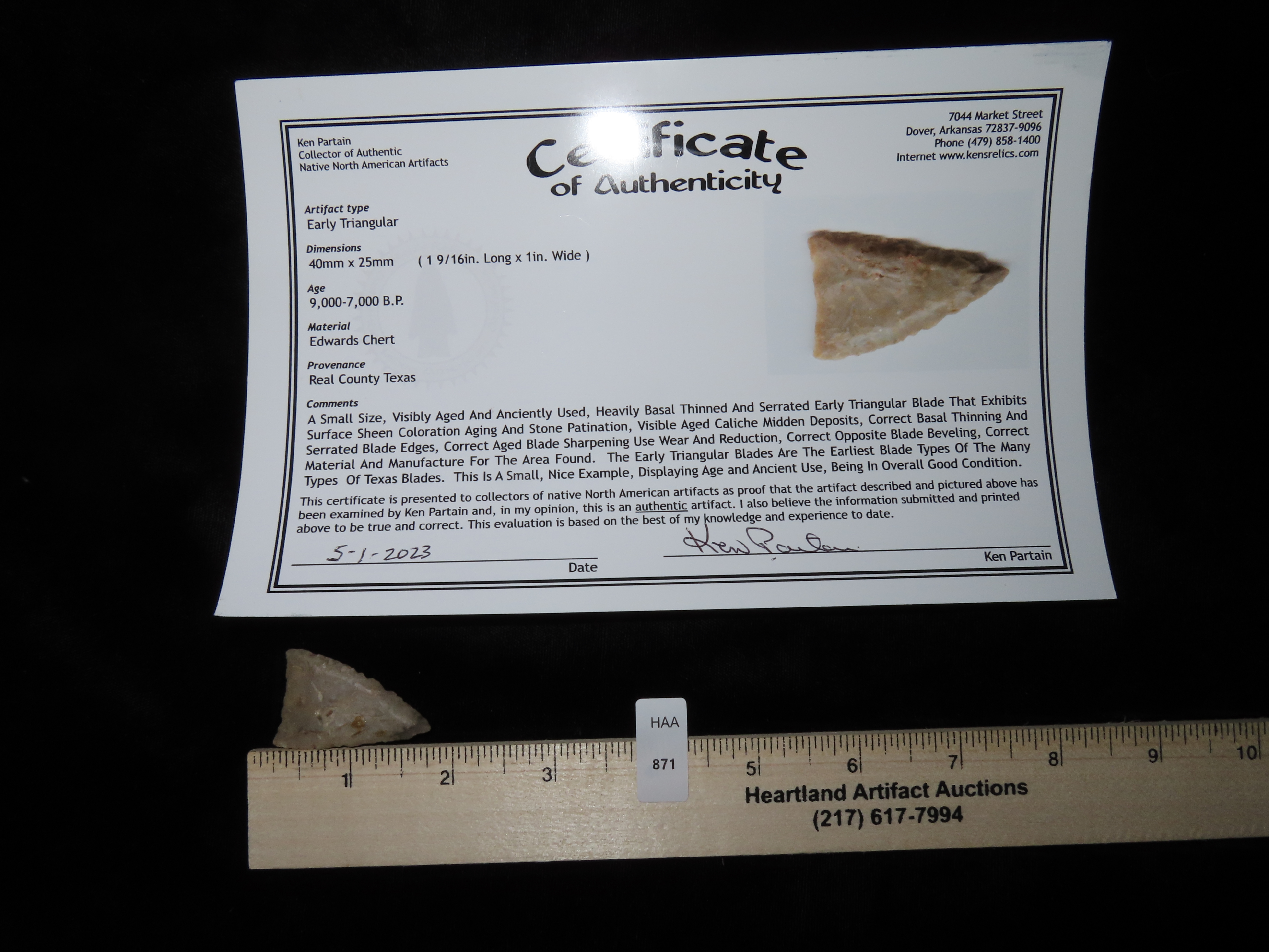 1 9/16″ Early Triangular Point, Partain COA, found in Real Co., Texas
