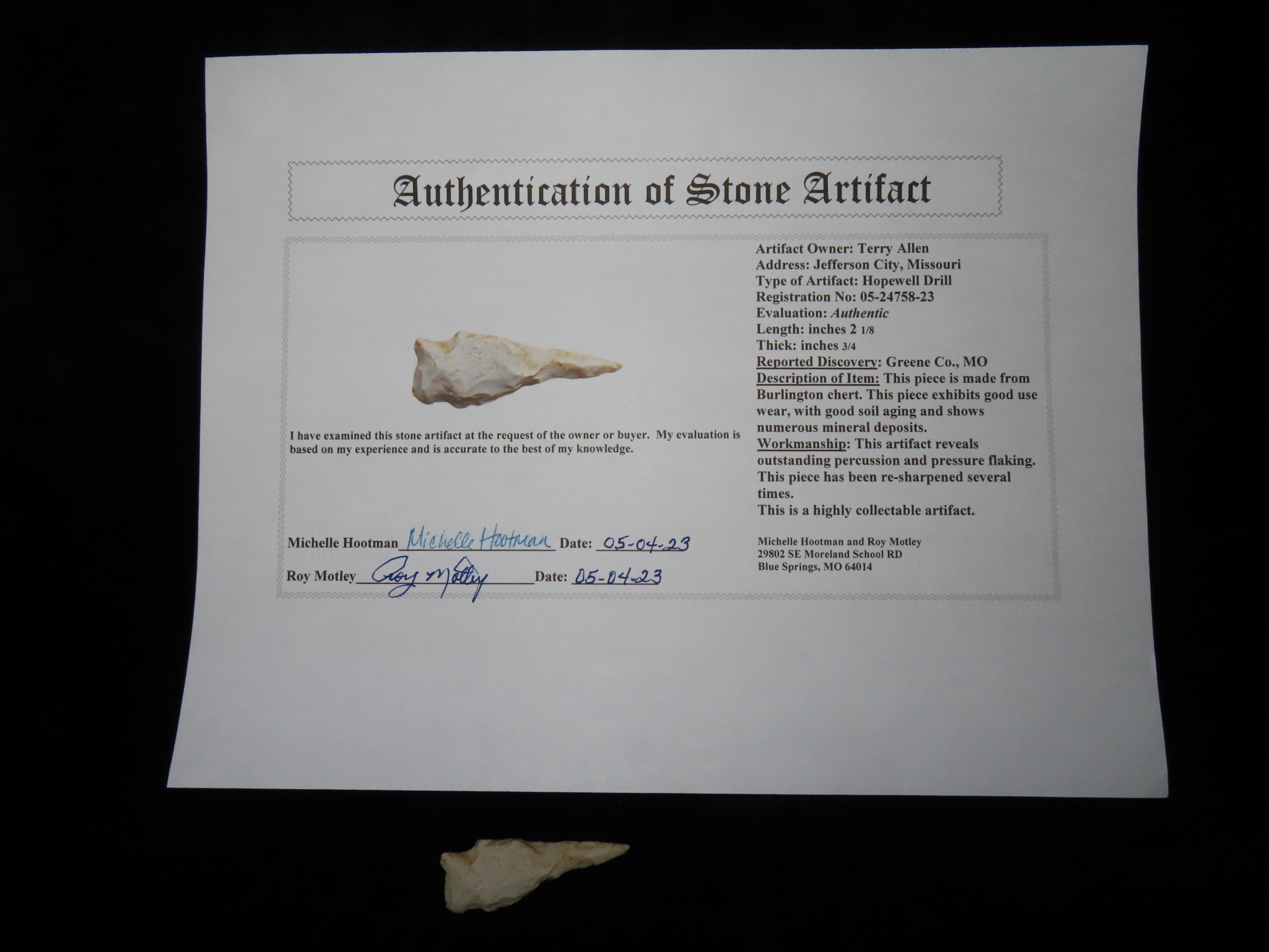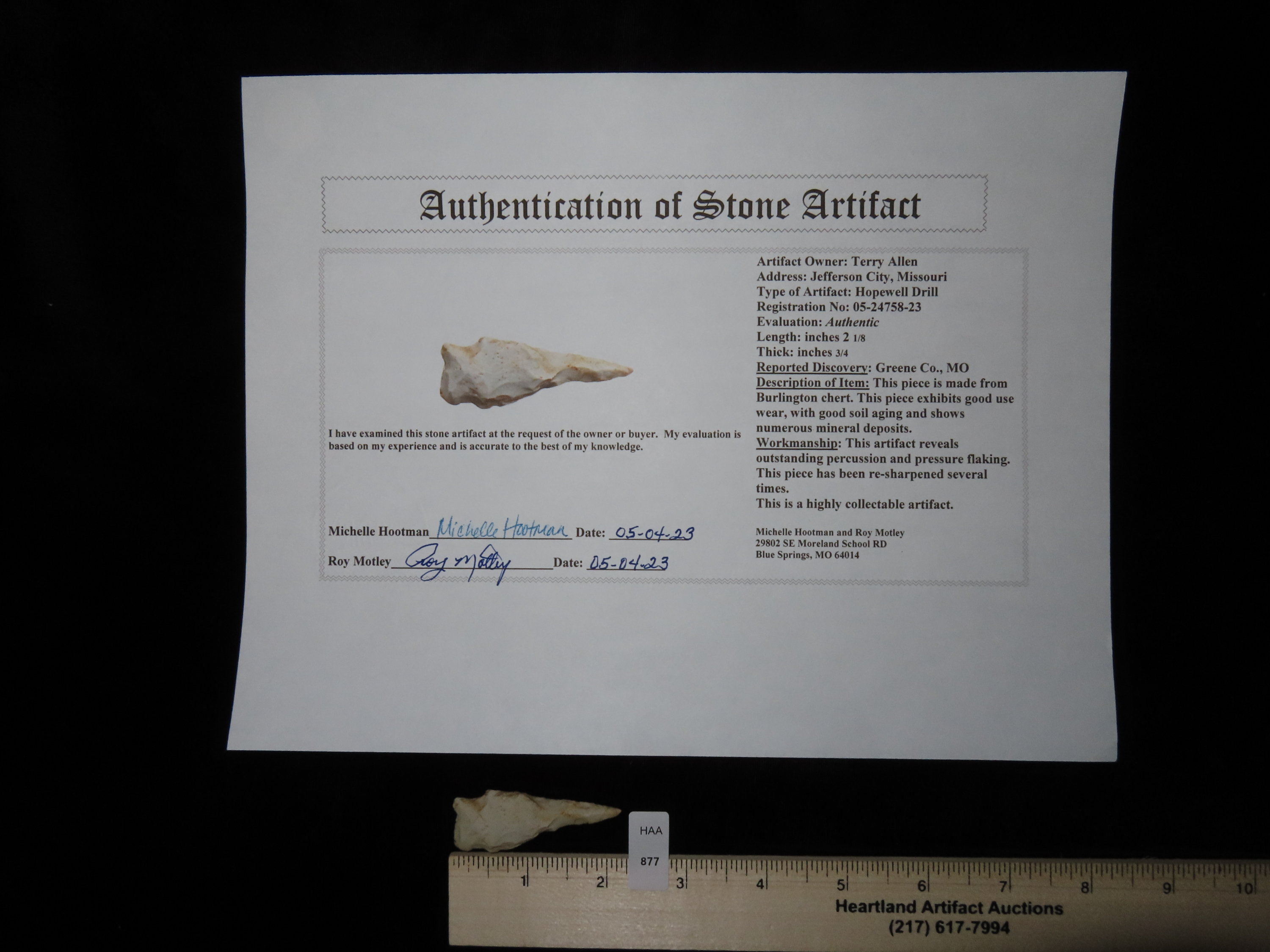 2 1/8″ Hopewell Drill, Motley COA, found in Jefferson Co., Missouri, Ex Terry Allen Collection