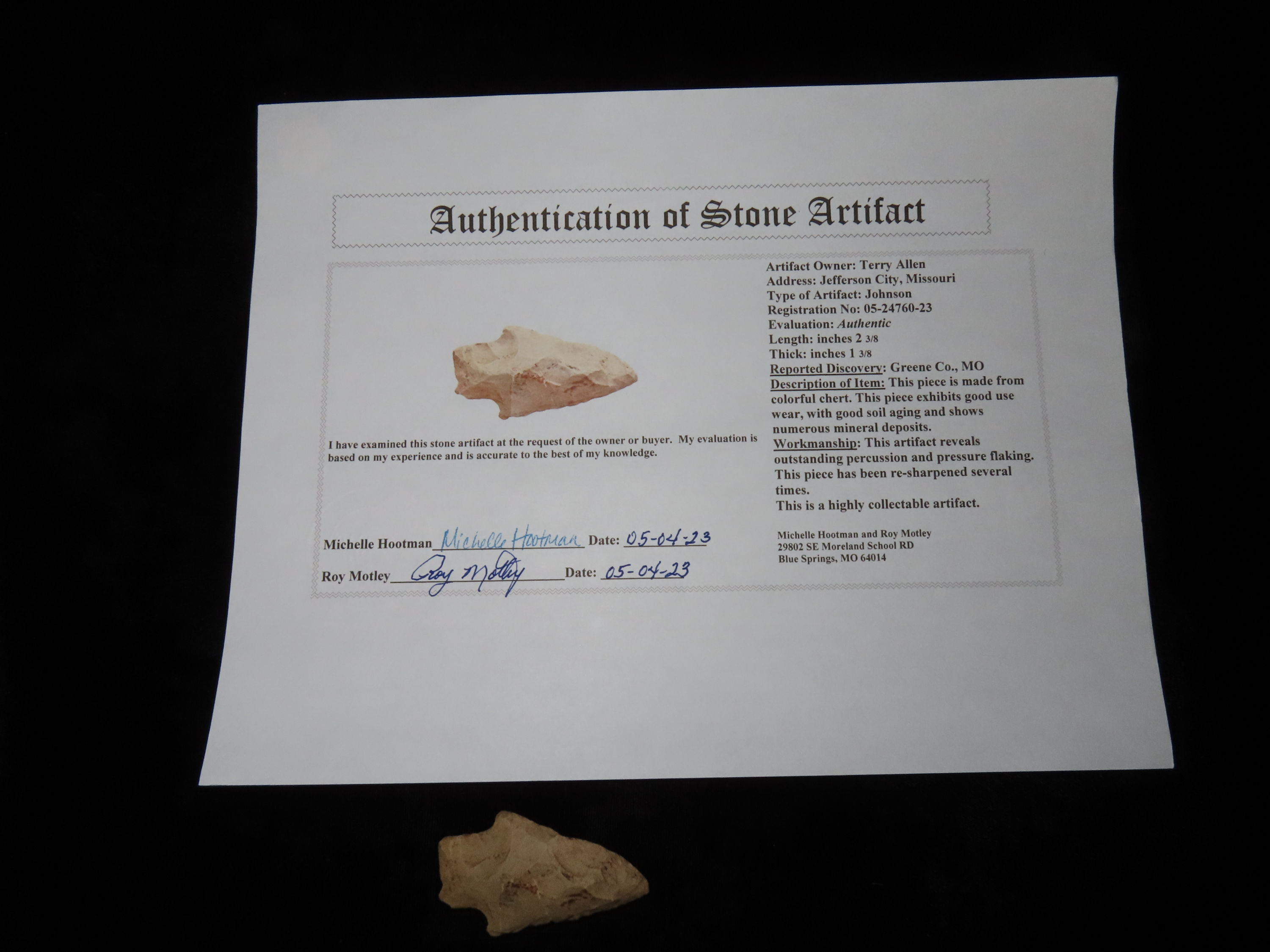 2 3/8″ Johnson Point, Motley COA, found in Greene Co., Missouri, Ex Terry Allen Collection