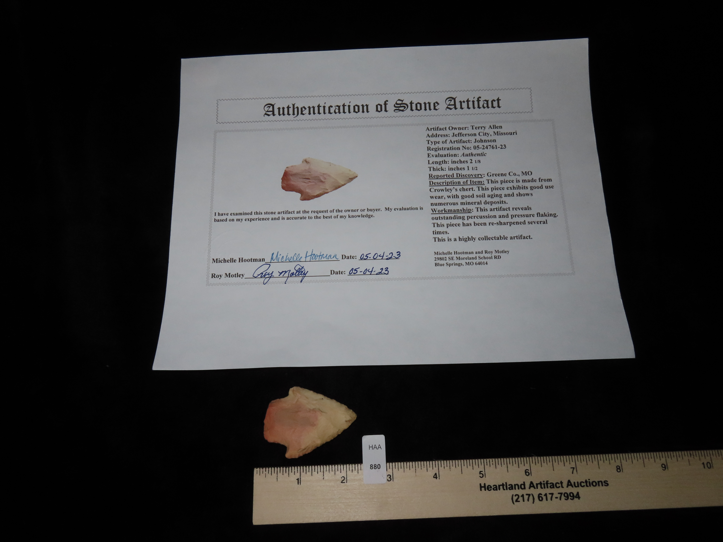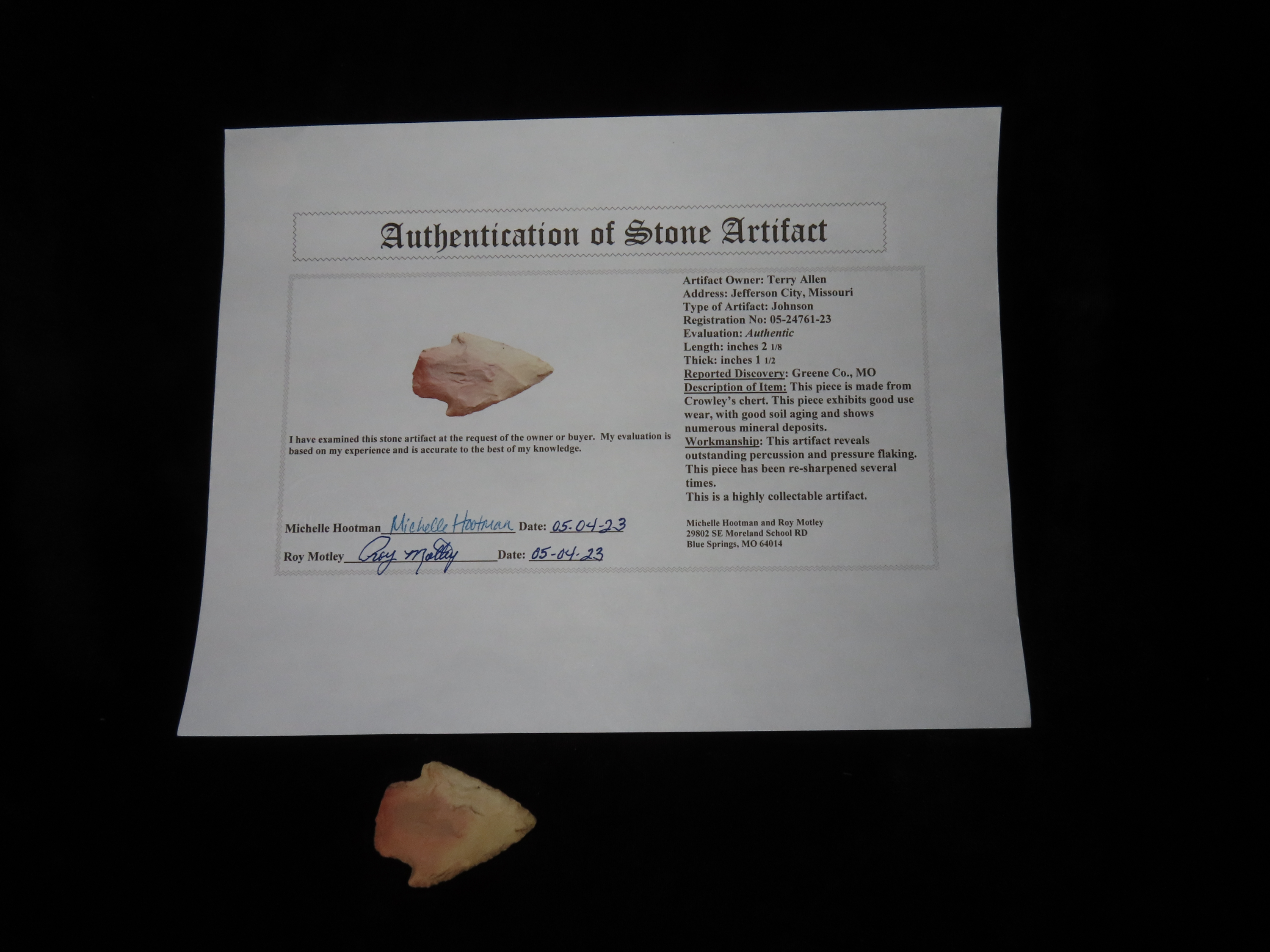2 1/8″ Johnson Point, Motley COA, made of Crowley’s Chert, found in Greene Co., Missouri, Ex Terry Allen Collection