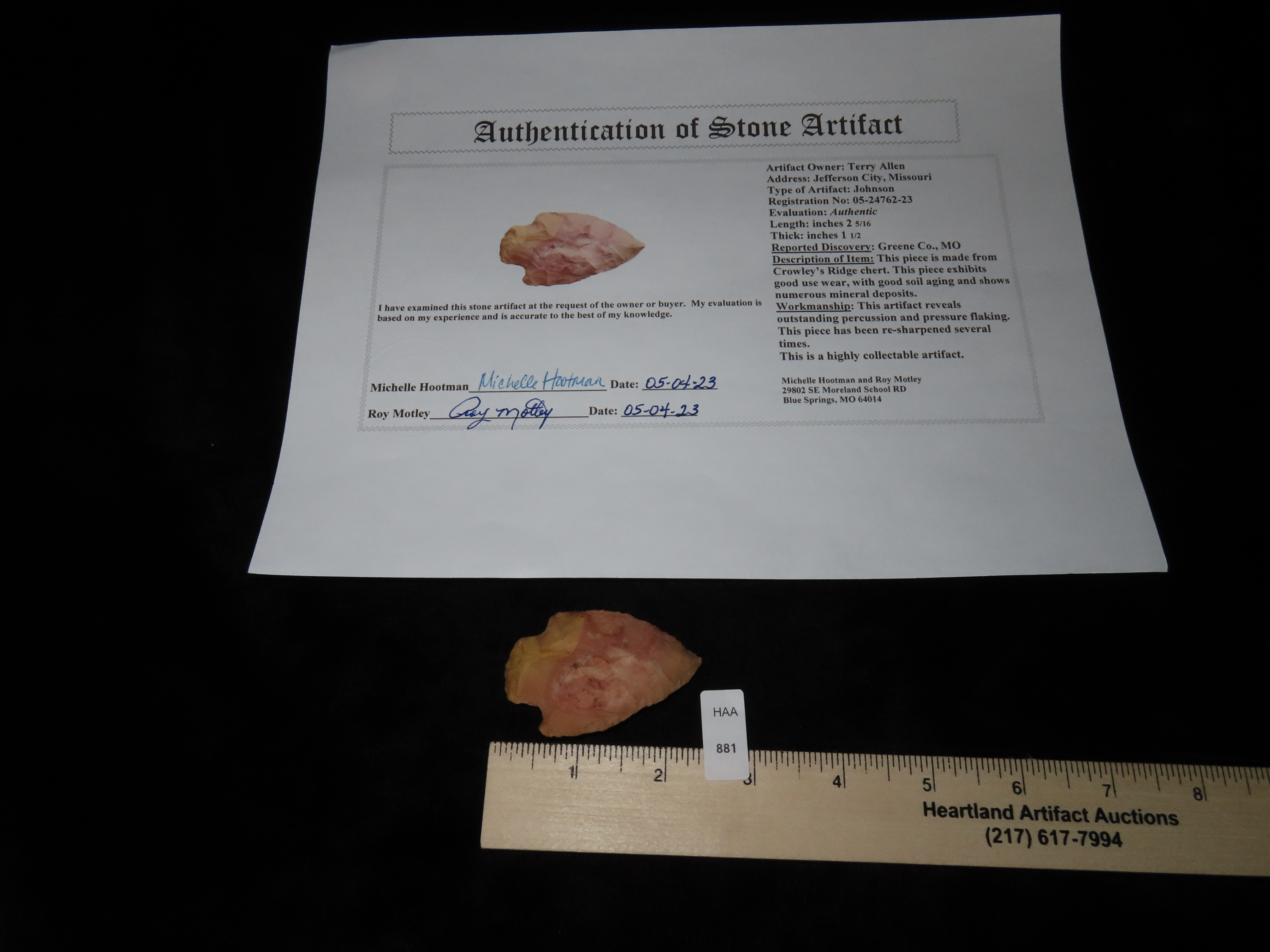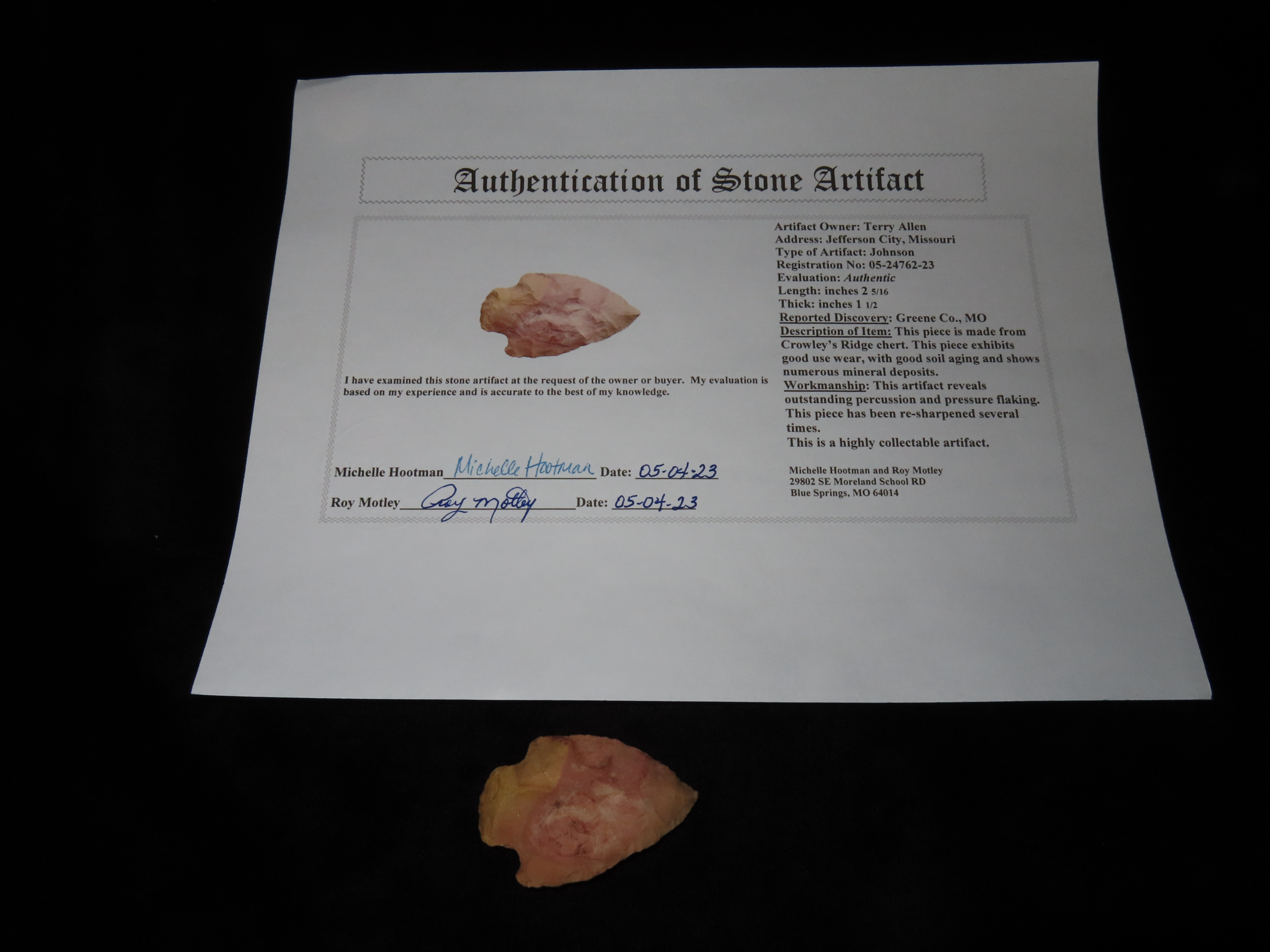 2 5/16″ Johnson Point, Motley COA, made of Crowley’s Chert, found in Greene Co., Missouri, Ex Terry Allen Collection