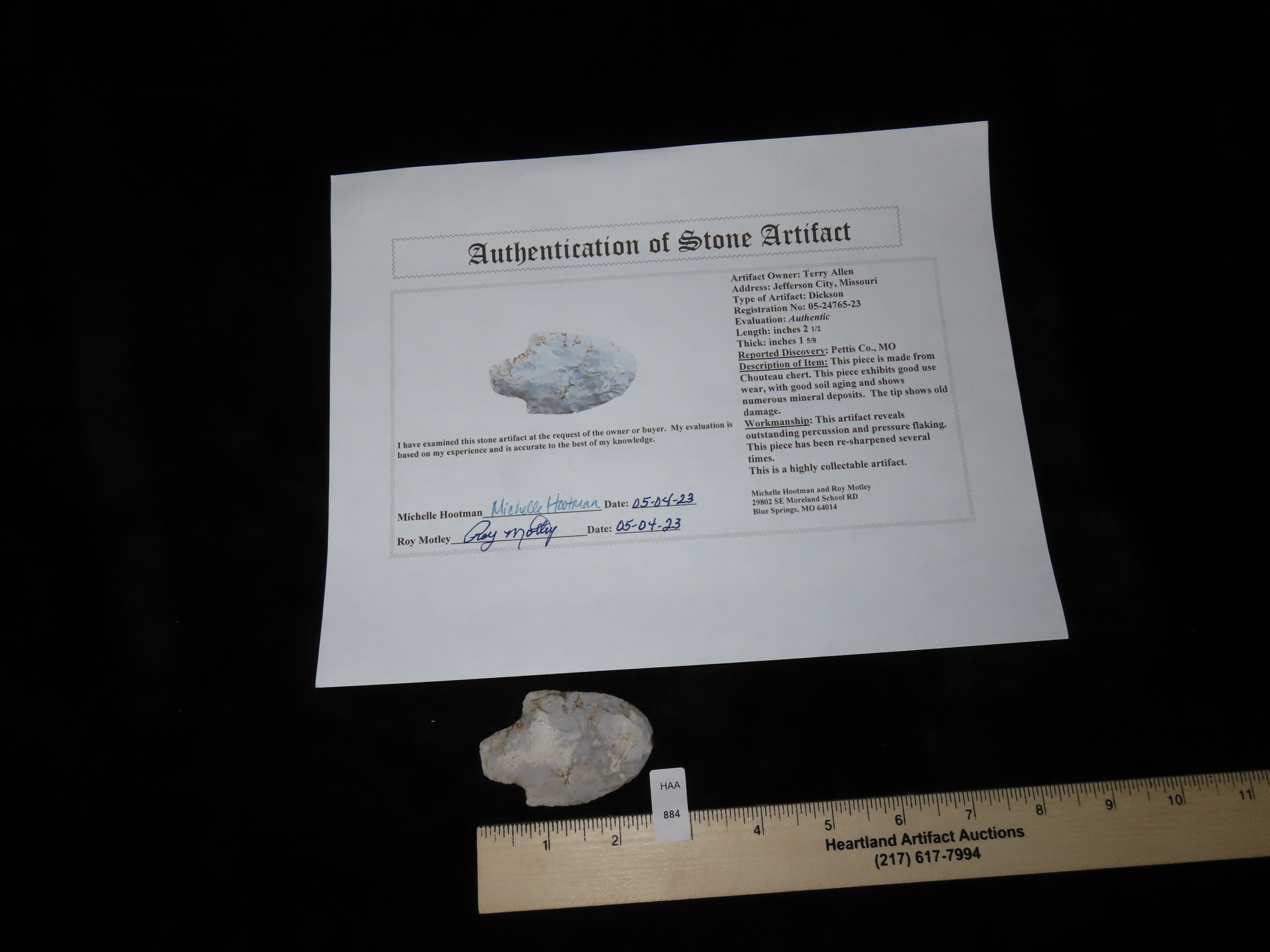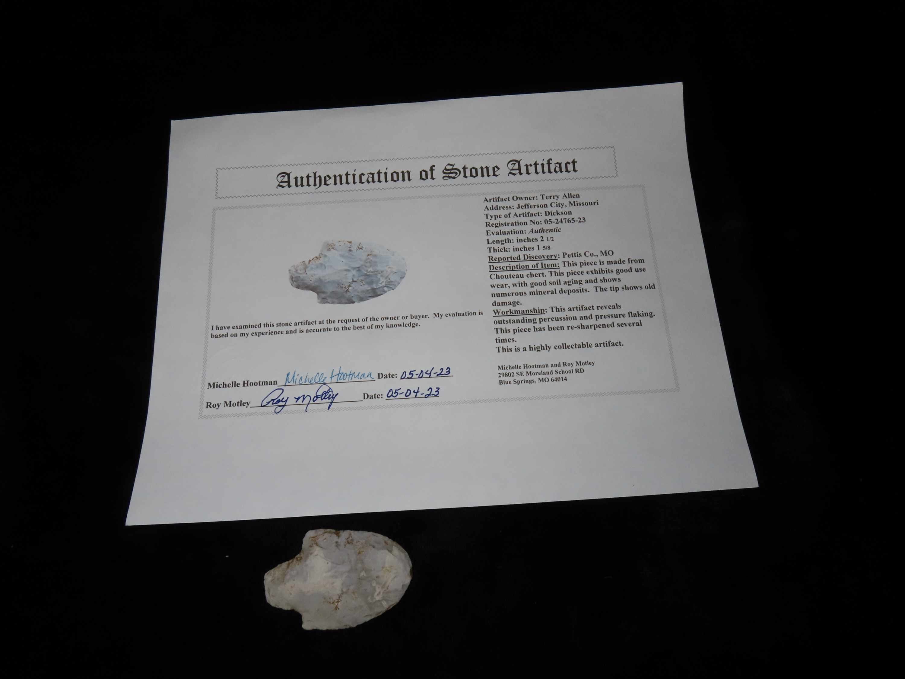 2 1/2″ Dickson, Motley COA, made of Chouteau Chert, found in Pettis Co., Missouri, Ex Terry Allen Collection