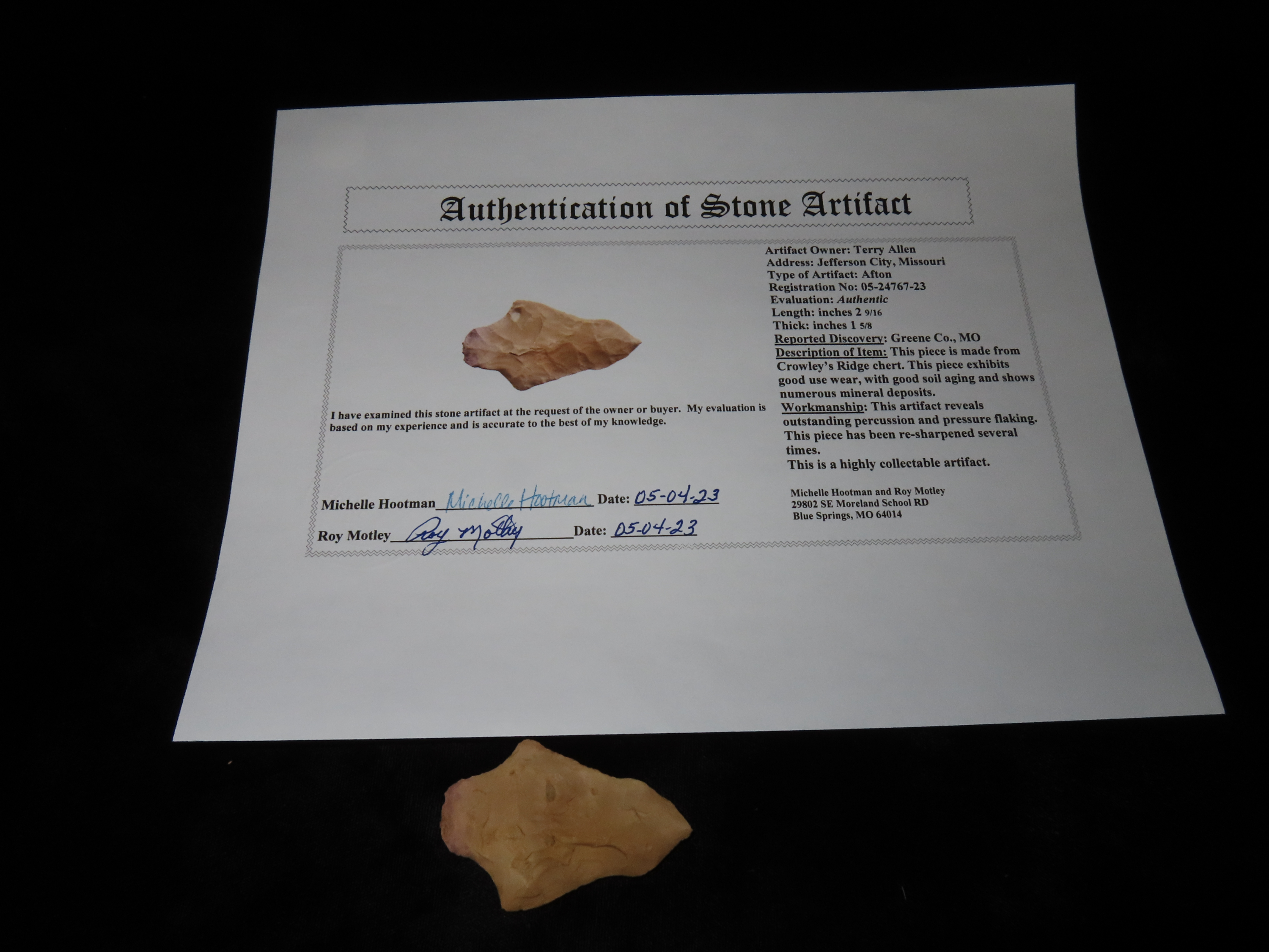 2 9/16″ Afton Point, Motley COA, found in Greene Co., Missouri, Ex Terry Allen Collection