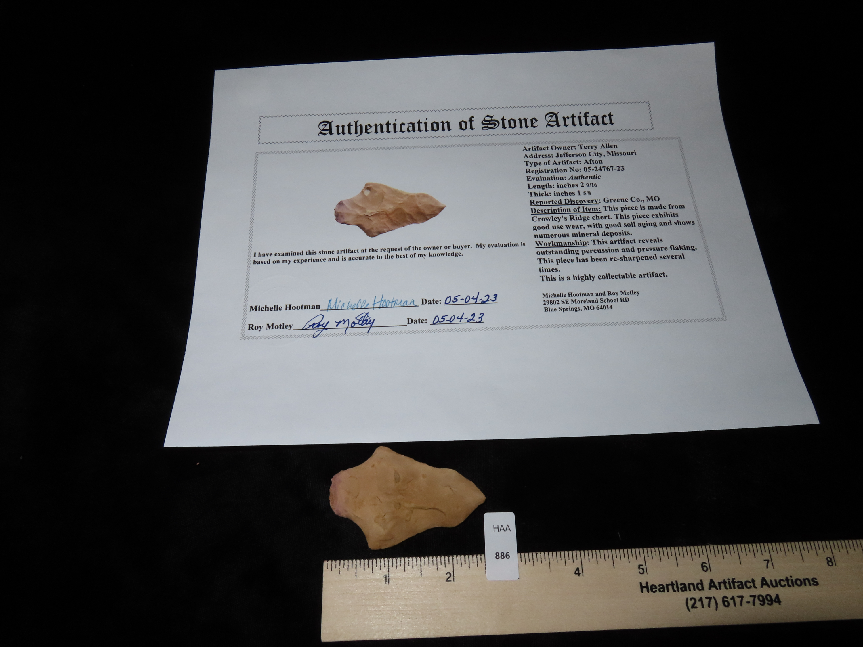 2 9/16" Afton Point, Motley COA, found in Greene Co., Missouri, Ex Terry Allen Collection