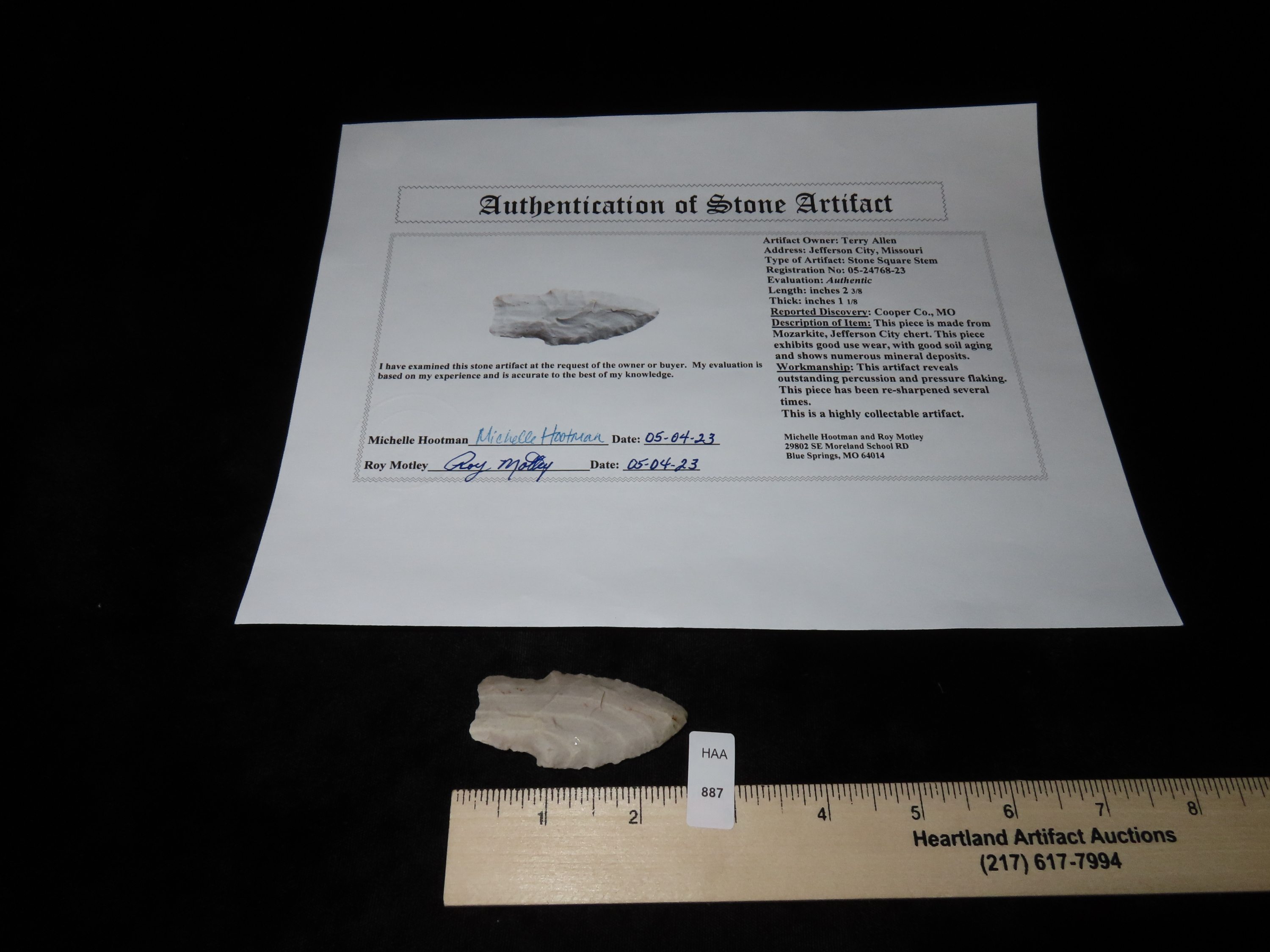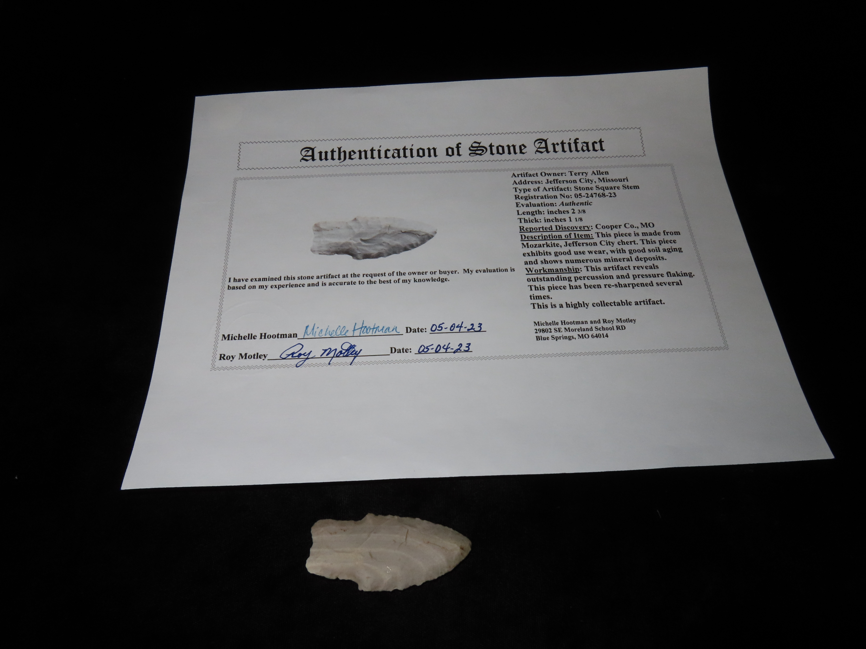 2 3/8″ Stone Square Stem, Motley COA, found in Cooper Co., Missouri, Ex Terry Allen Collection