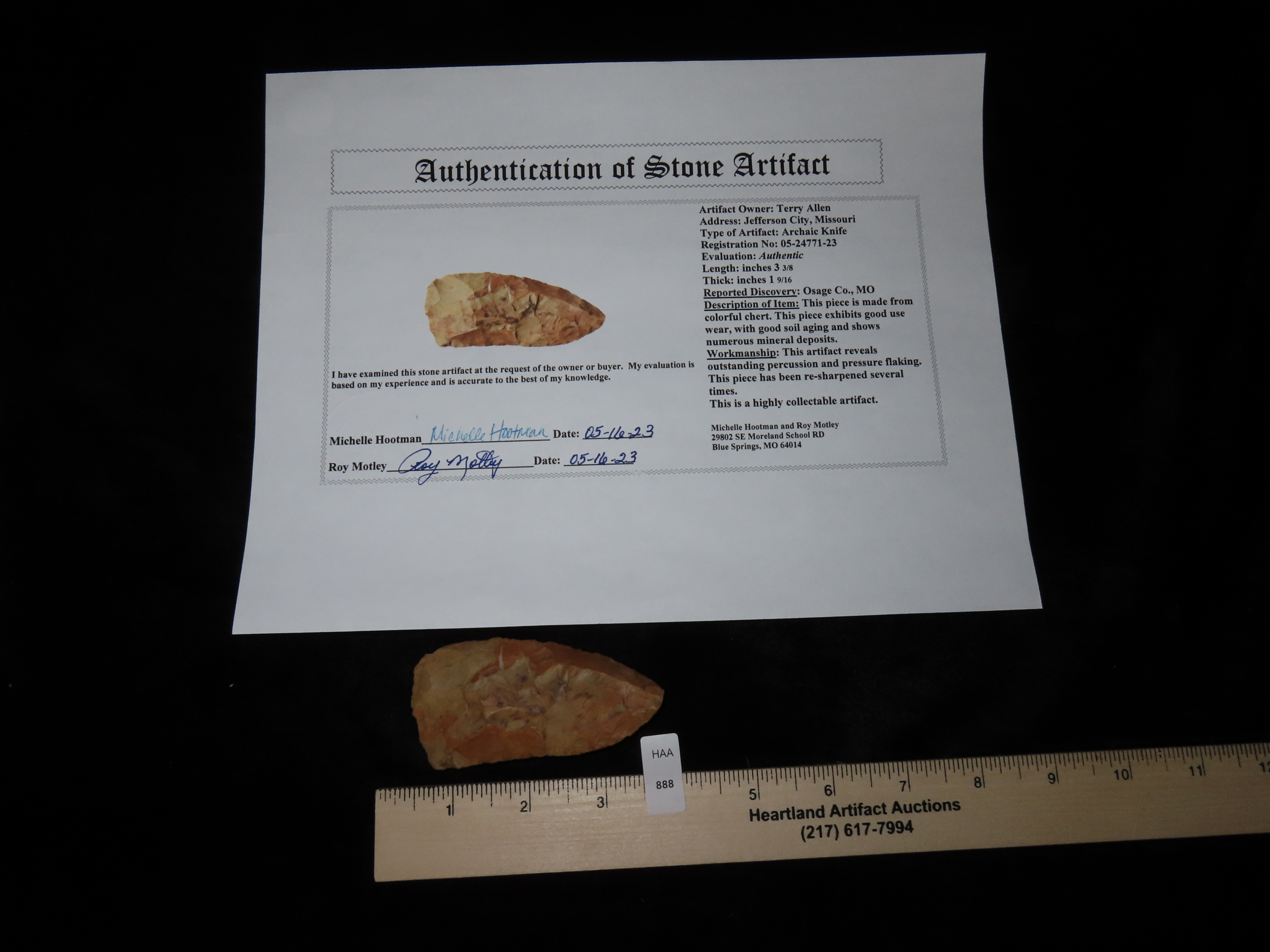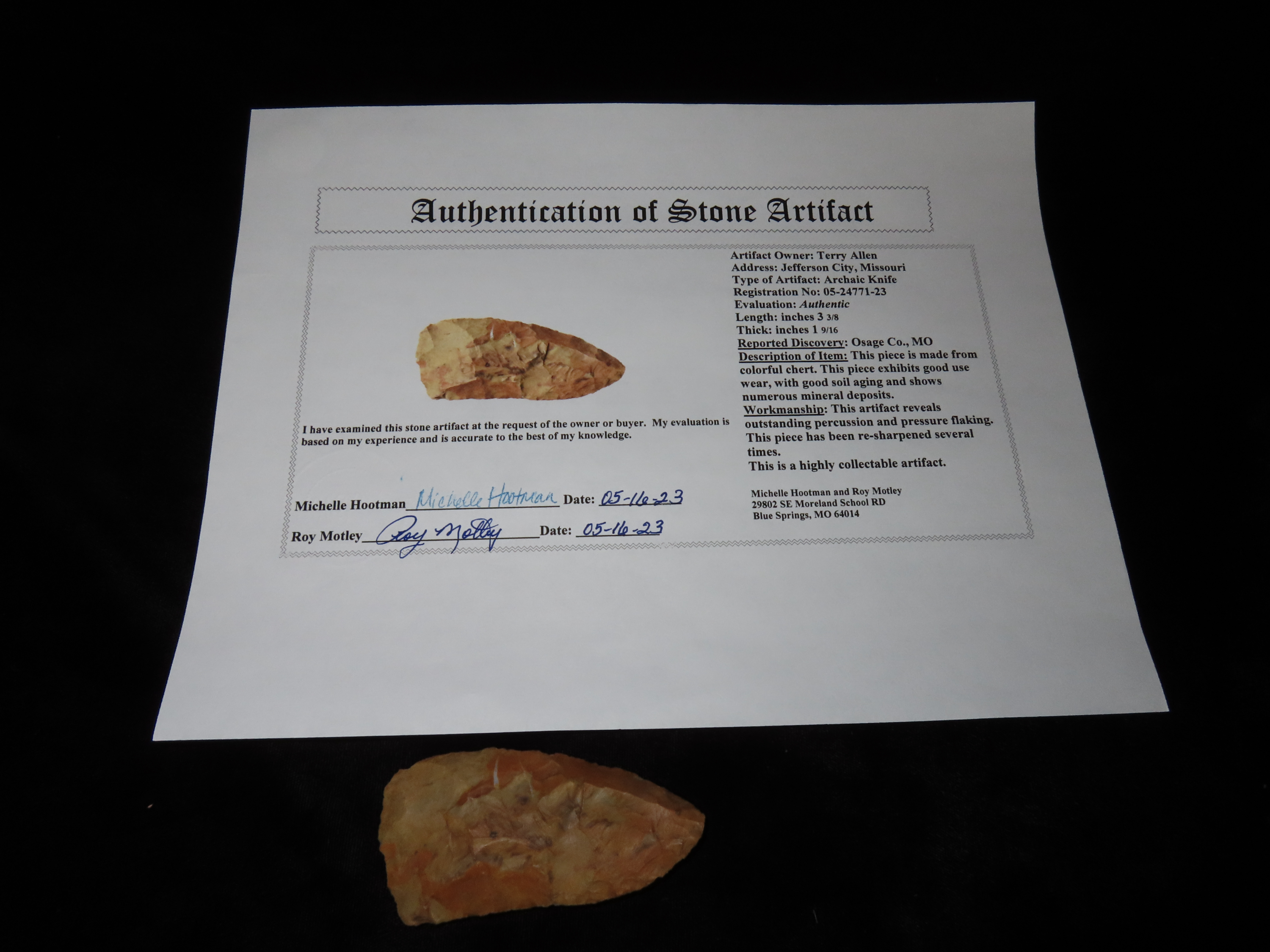 3 3/8″ Archaic Knife, Motley COA, Great Color!, found in Osage Co., Missouri, Ex Terry Allen Collection