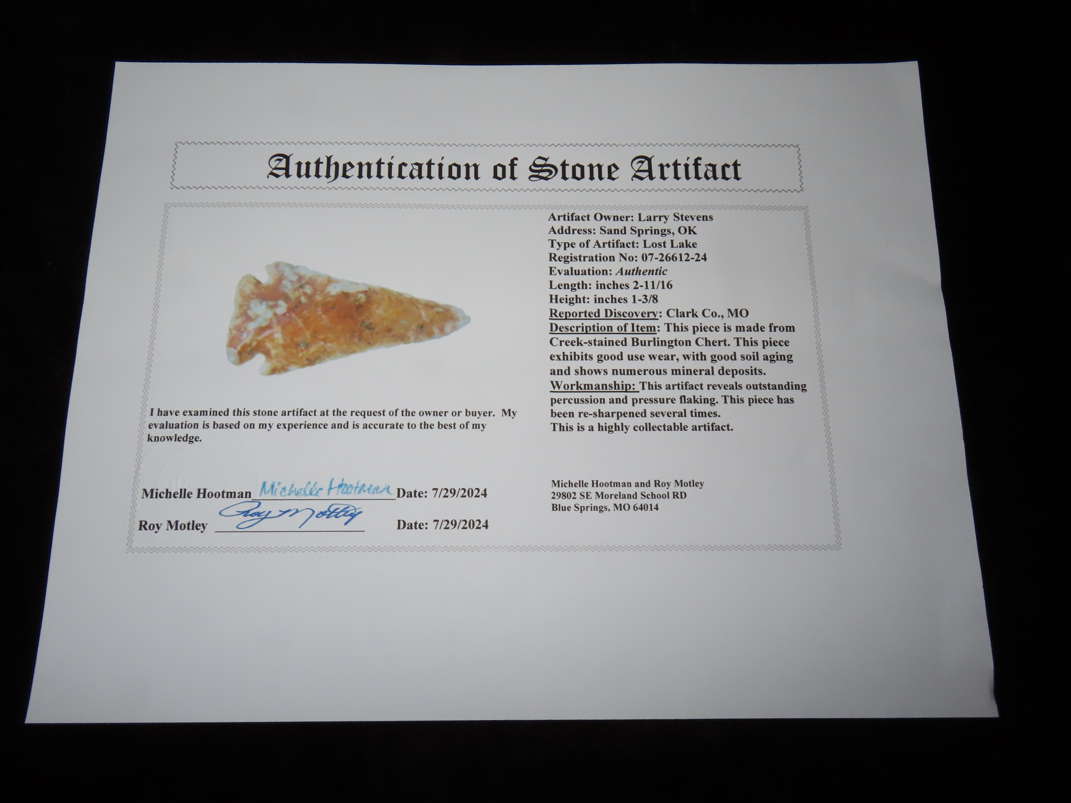 2 5/8″ Riverstained Lost Lake, Motley COA, found in Clark Co., Missouri, Ex Larry Stevens Collection