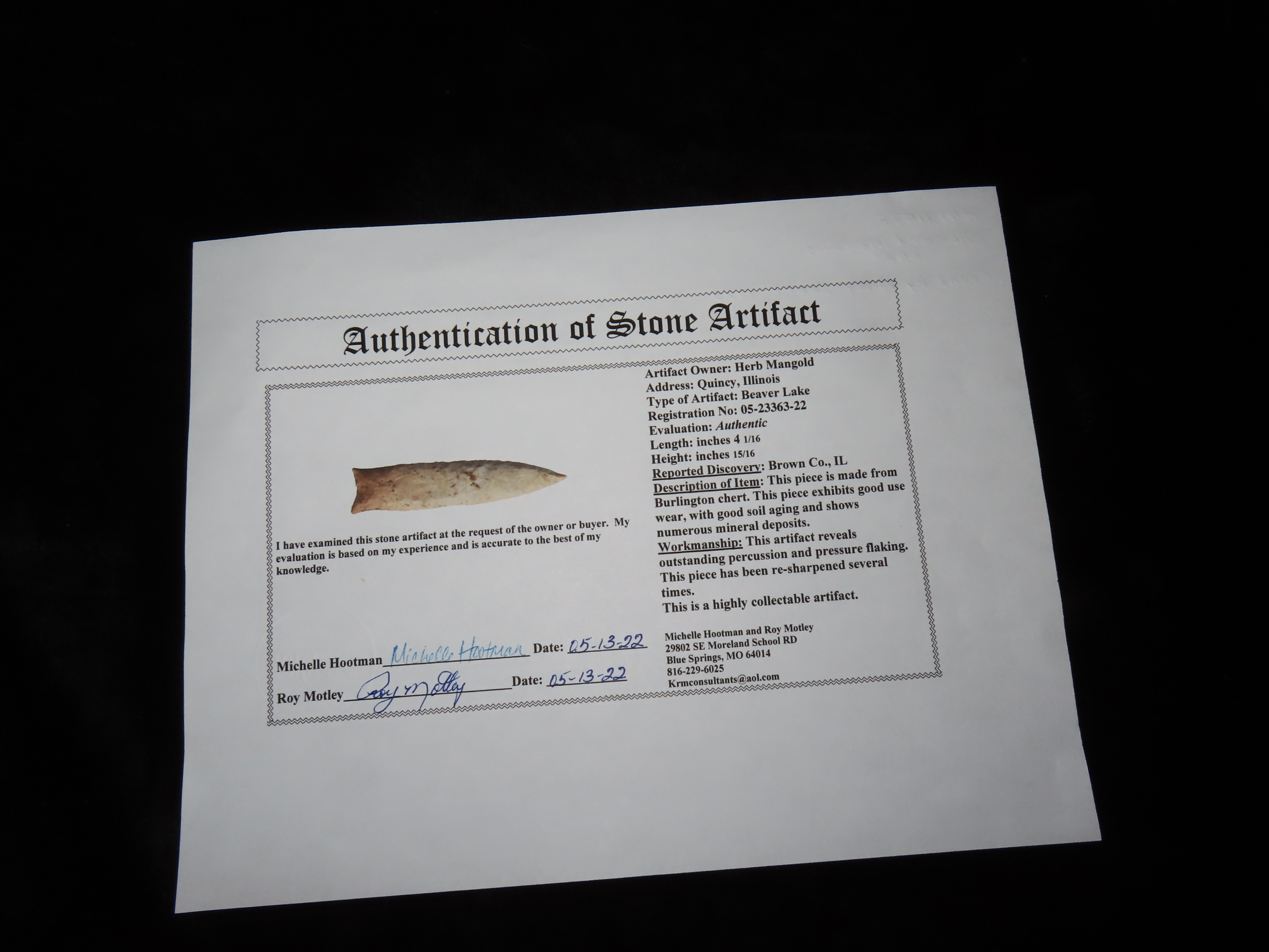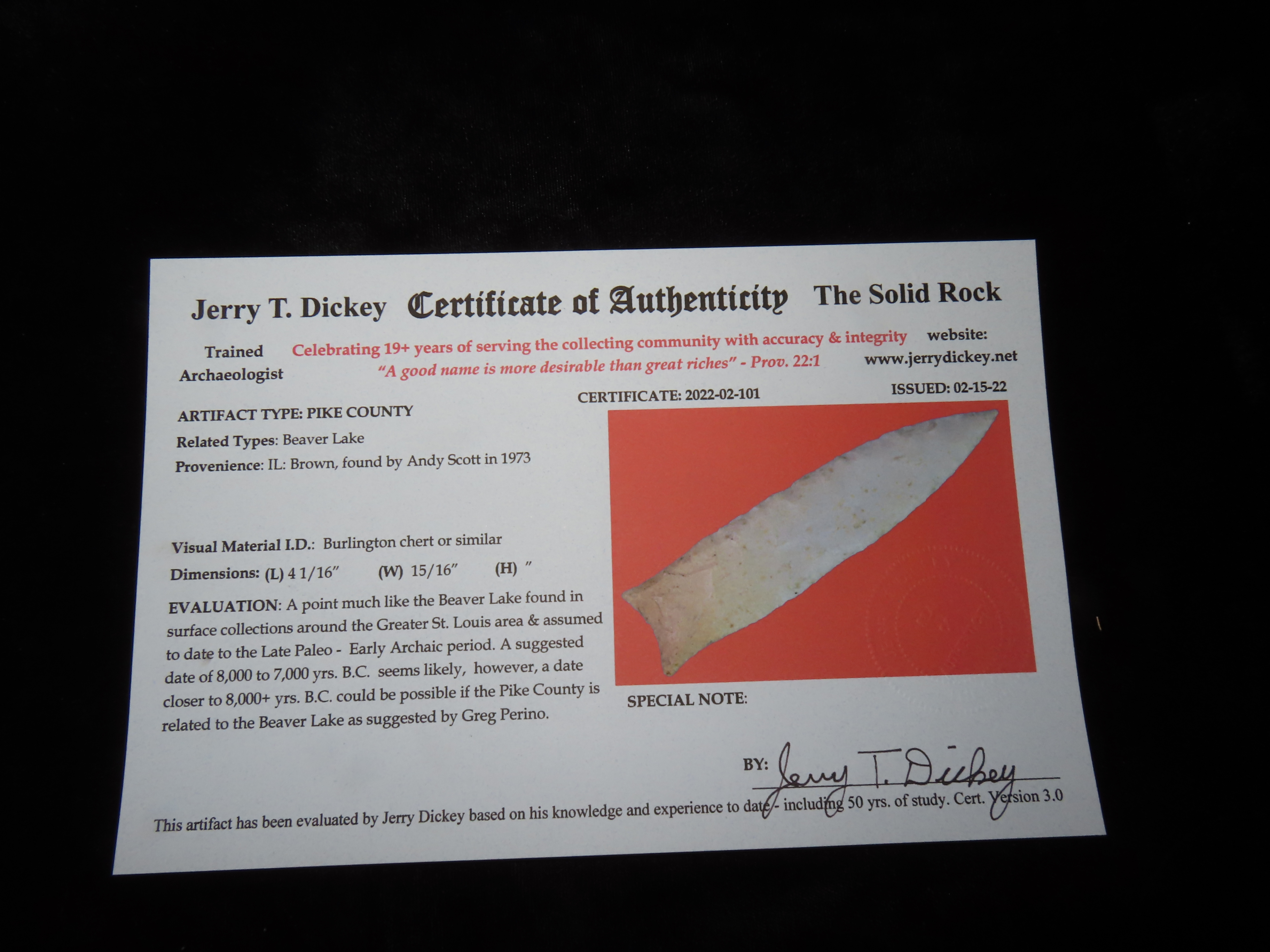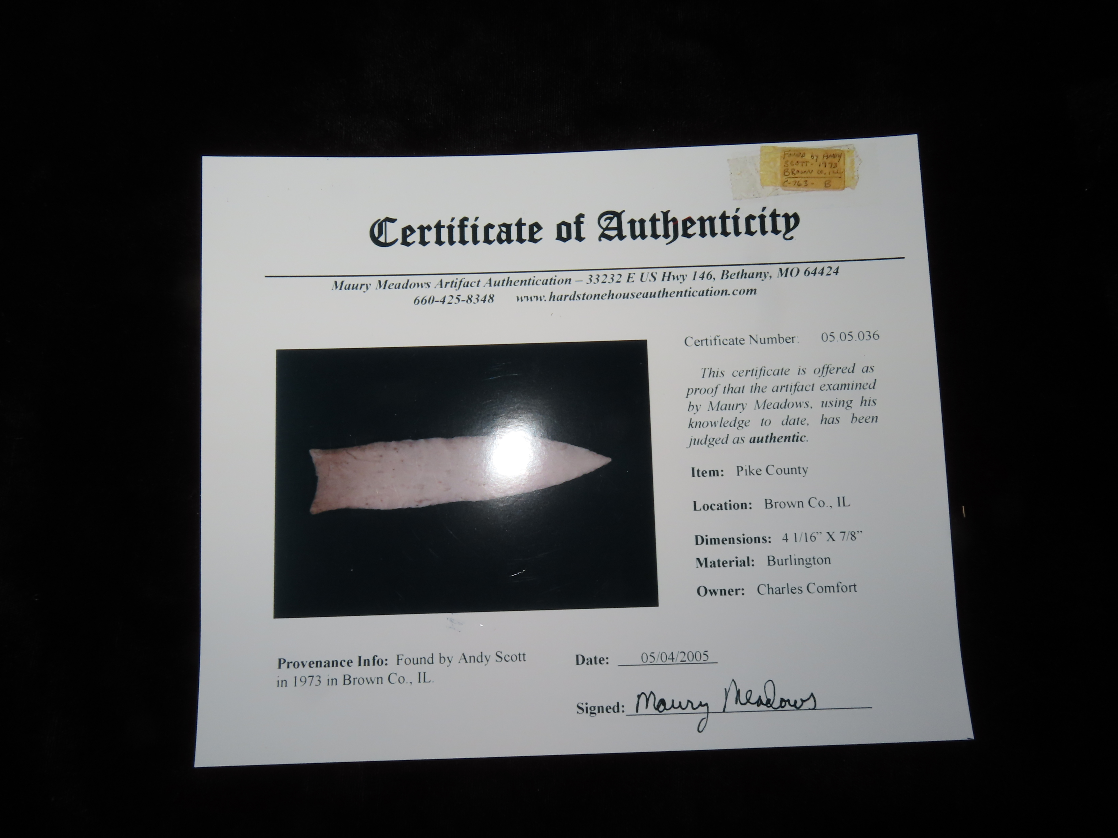 4 1/16″ Pike County,3x COA-Dickey/Meadows/Motley, found in Brown Co., Illinois by Andy Scott, Ex Herb Mangold Collection