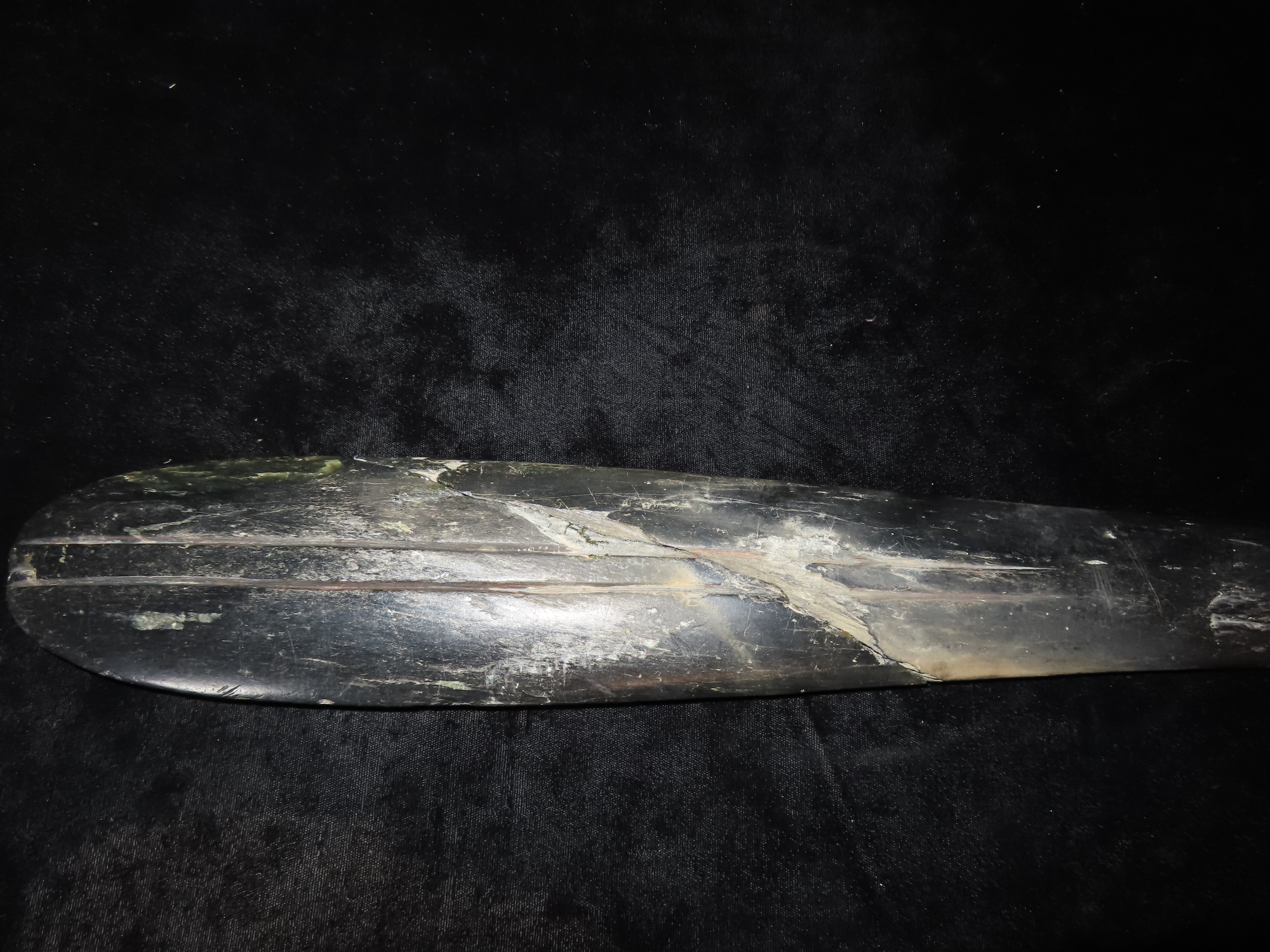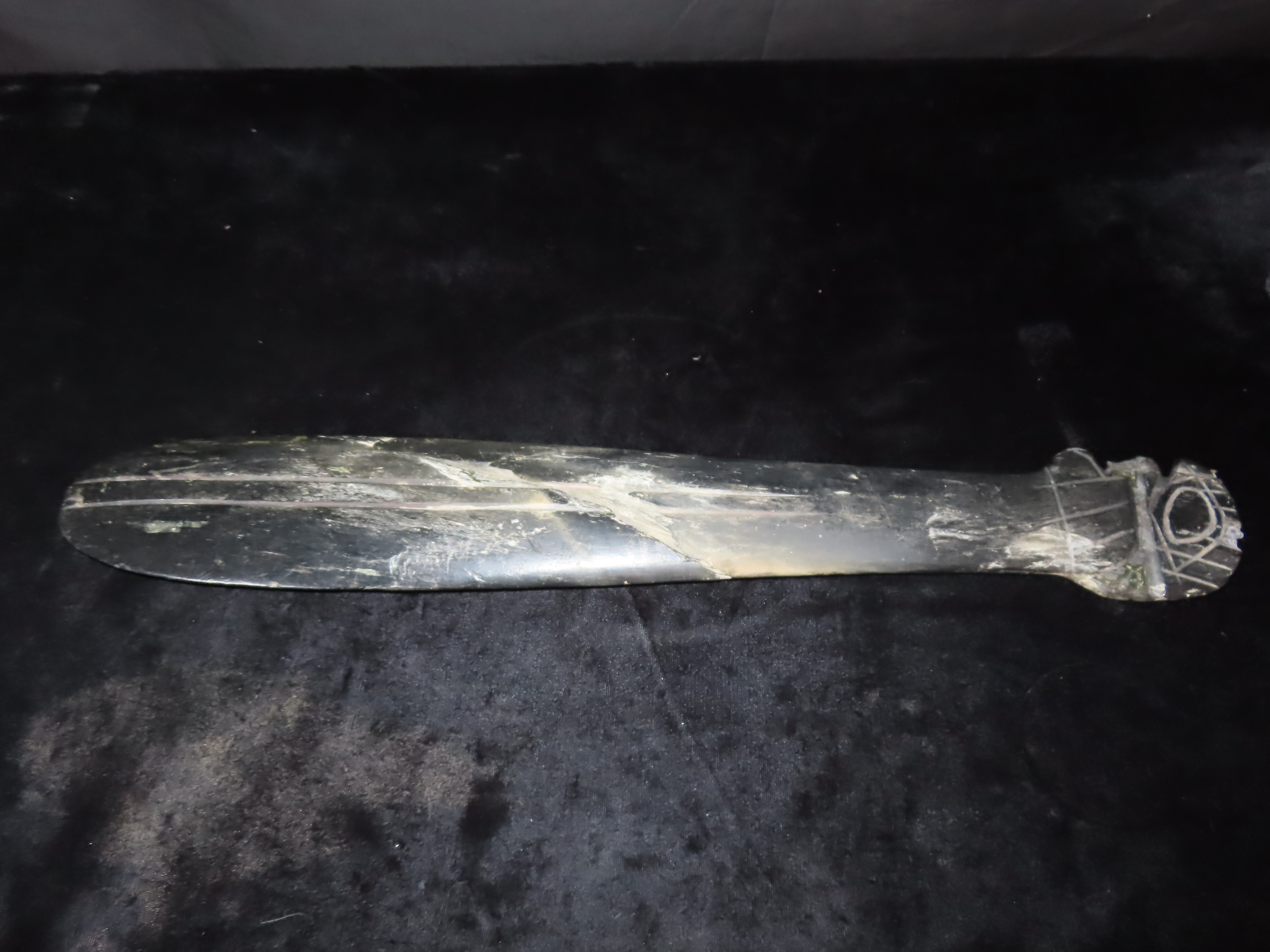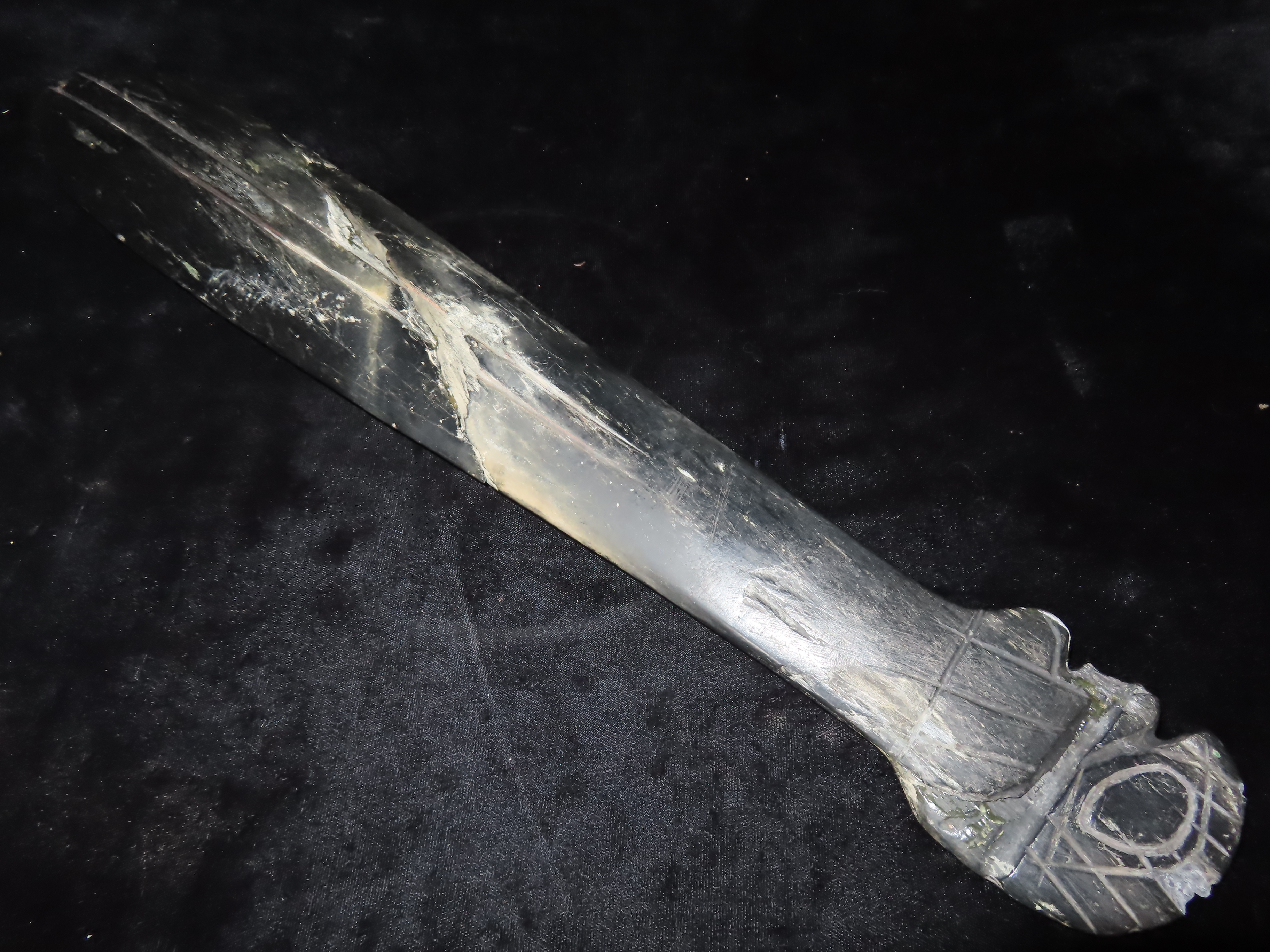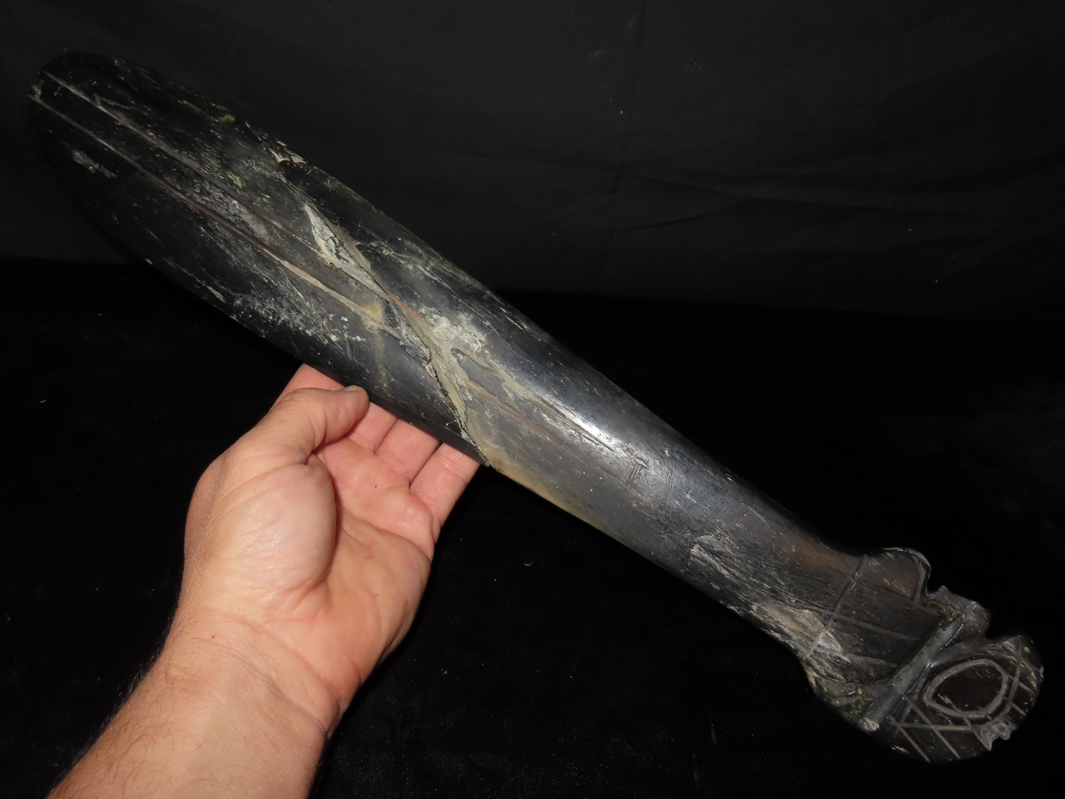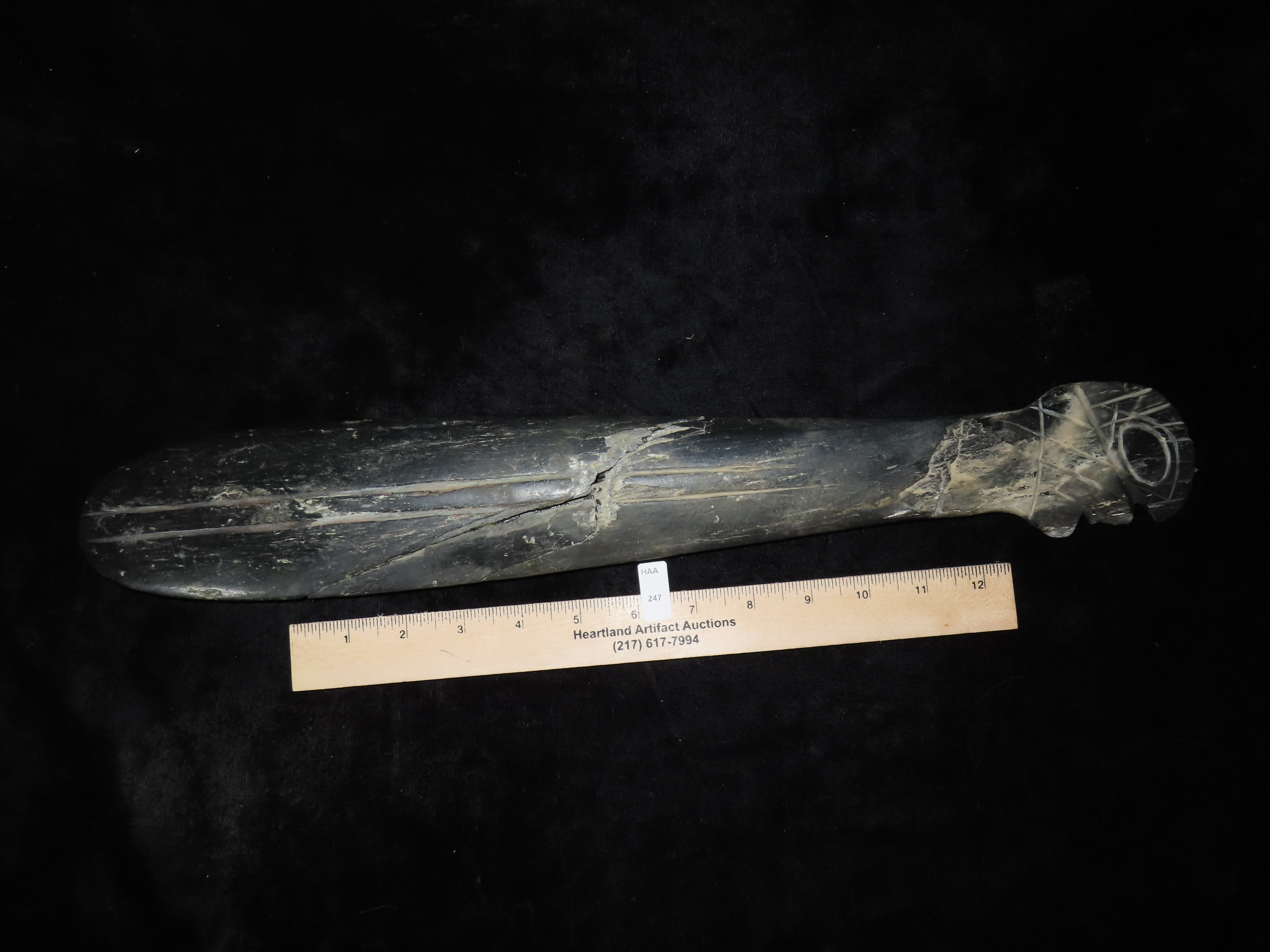 19 1/4″ Nephrite Human Effigy War Club, found in Washington State in the 1930’s, Ex Payne Collection, Ex Mitch Lewis Collection- NOTE:This piece has been ceremoniously “killed” and reassembled.