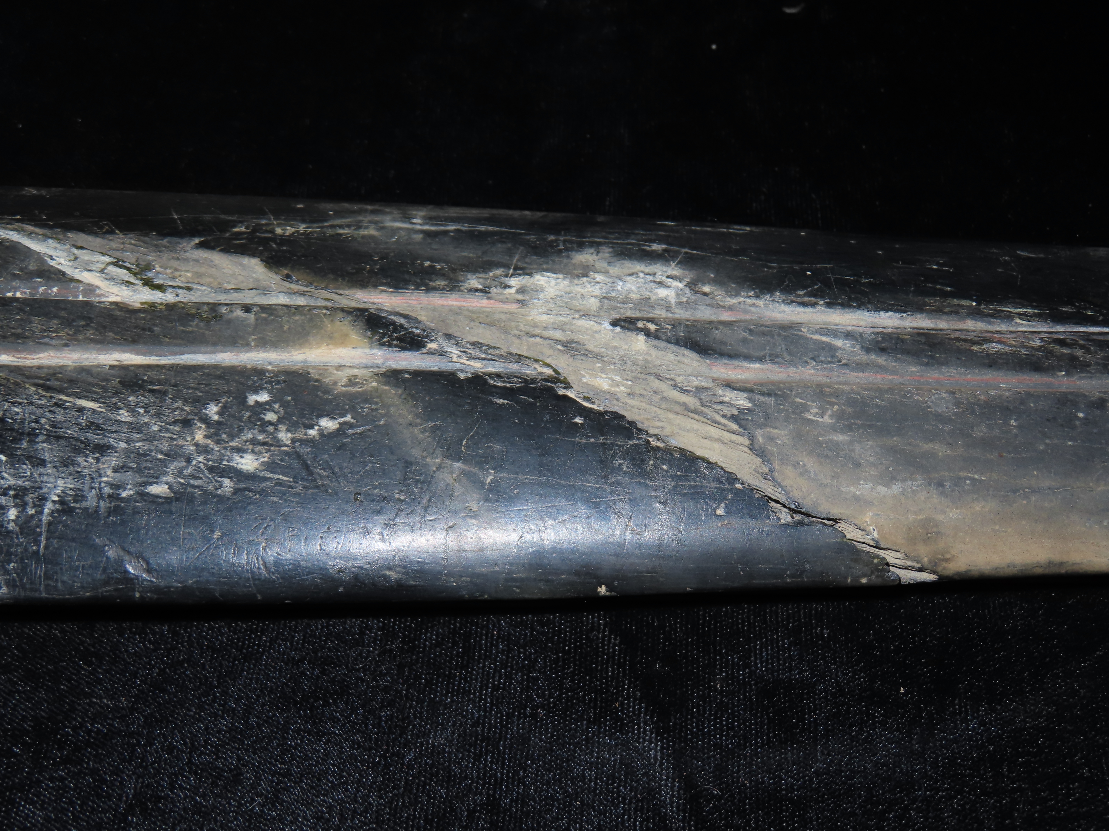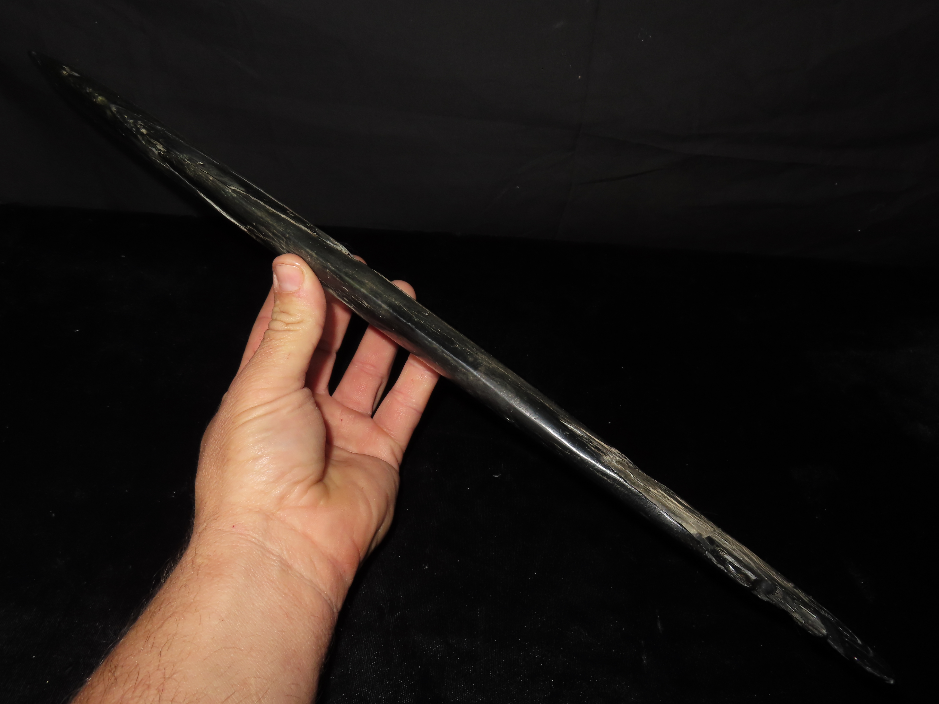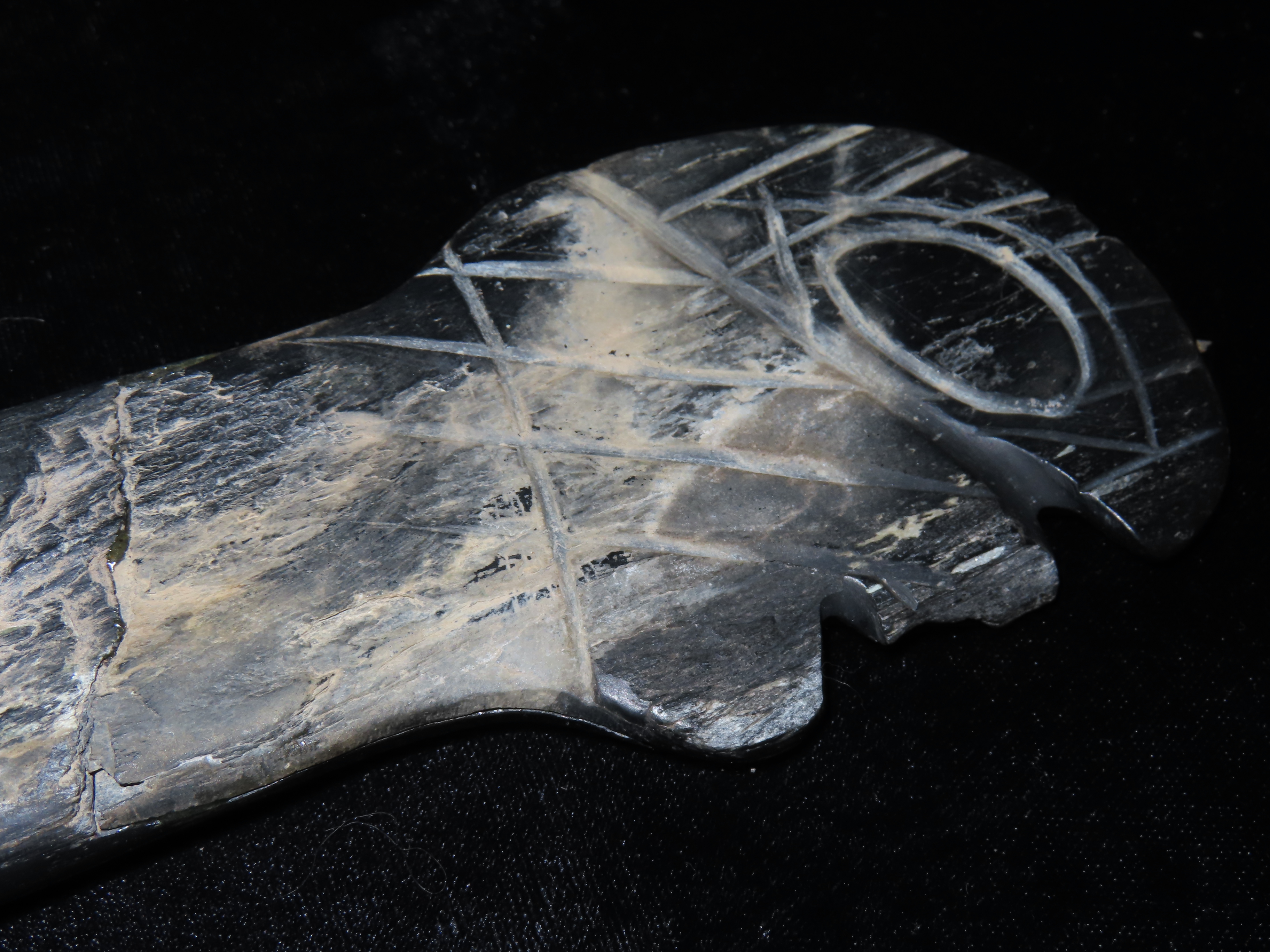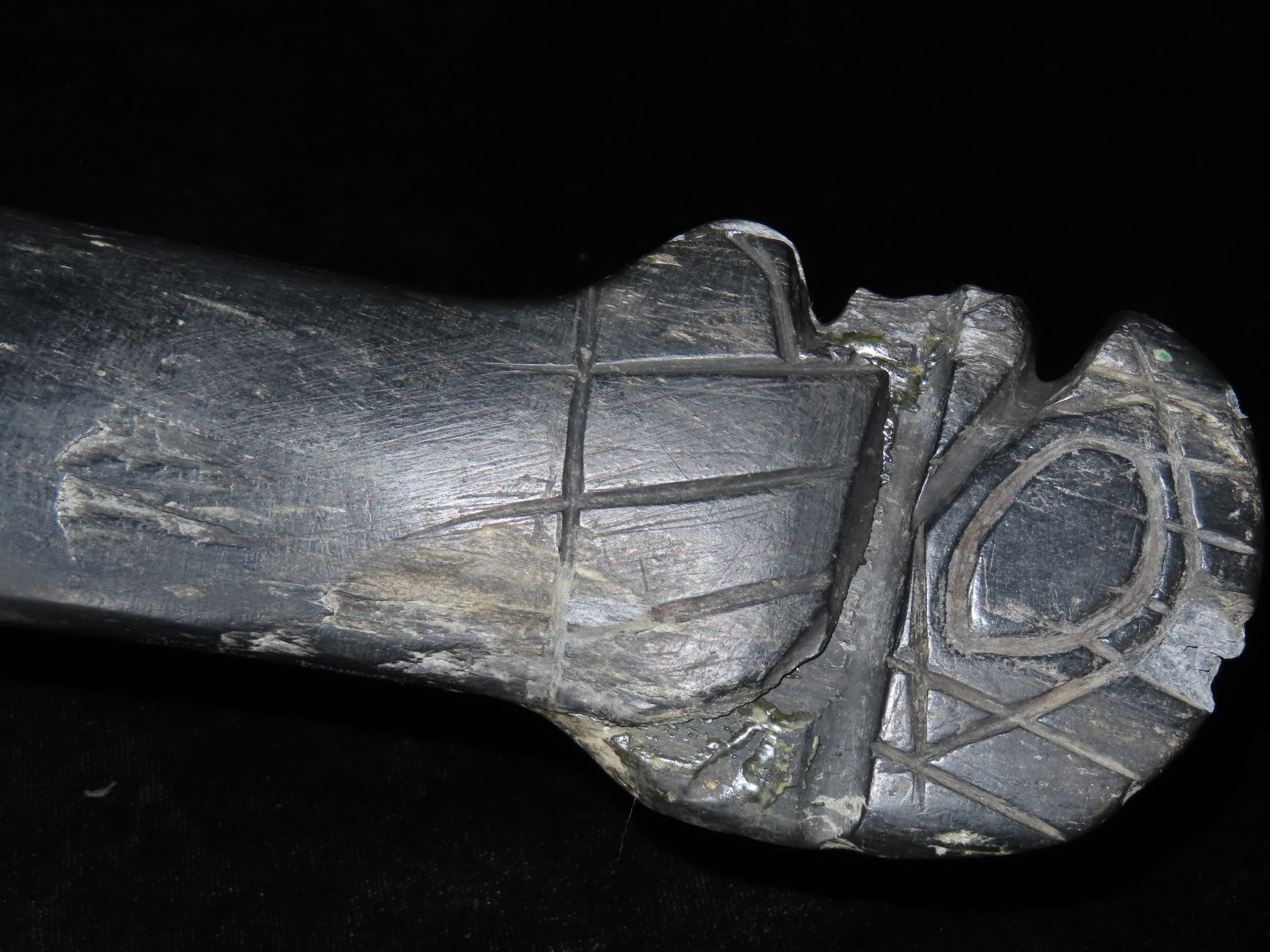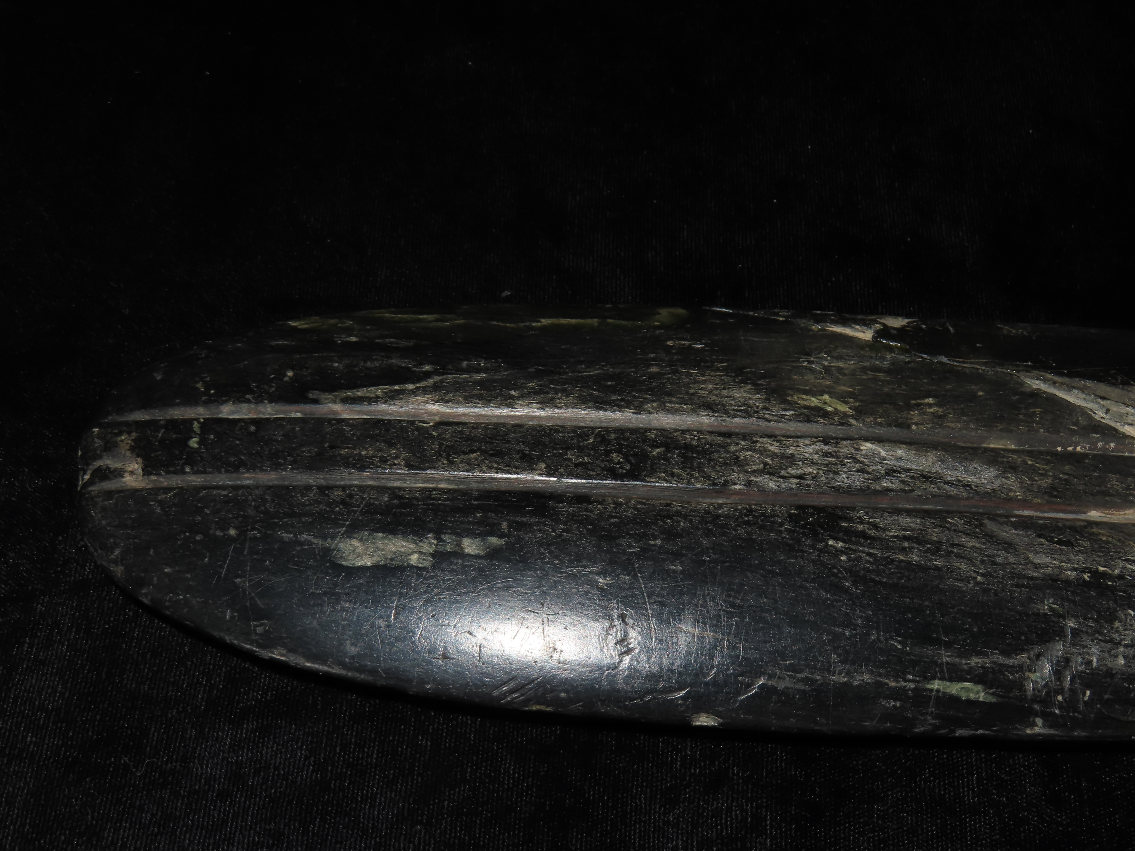 19 1/4″ Nephrite Human Effigy War Club, found in Washington State in the 1930’s, Ex Payne Collection, Ex Mitch Lewis Collection- NOTE:This piece has been ceremoniously “killed” and reassembled.