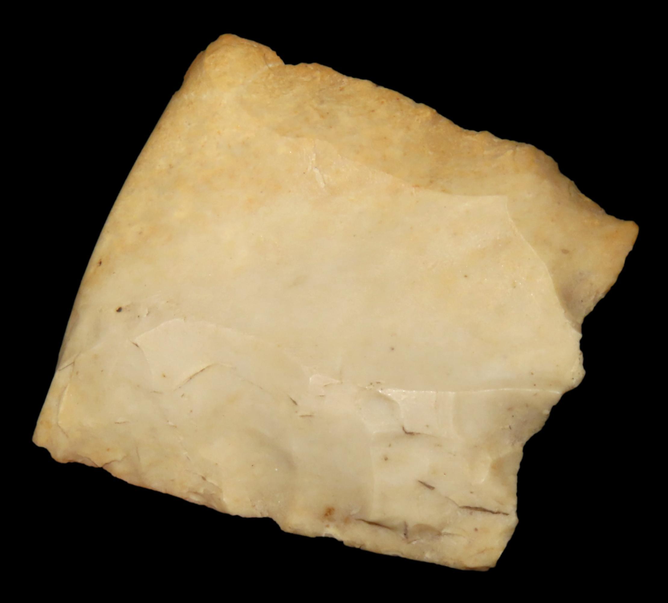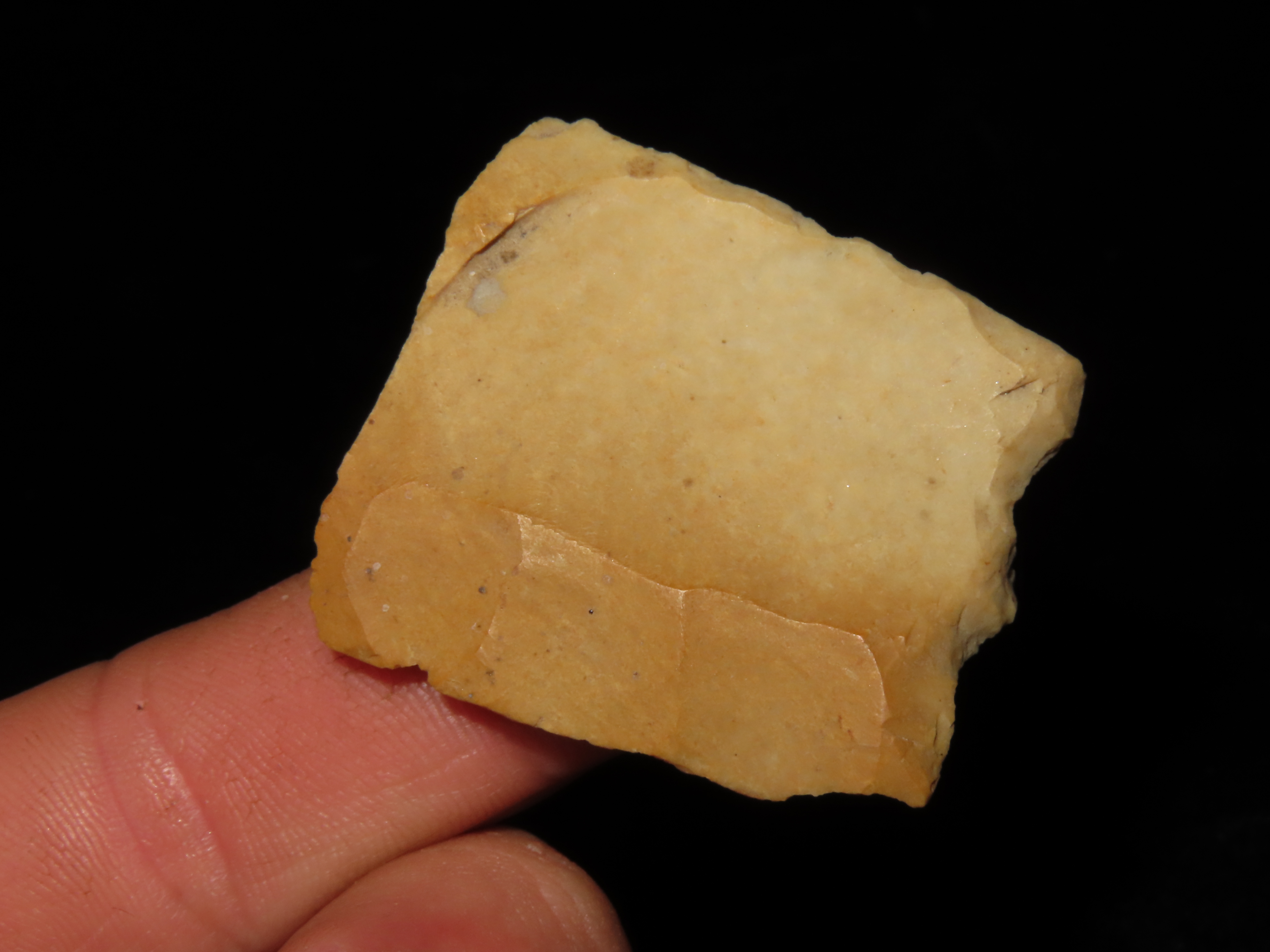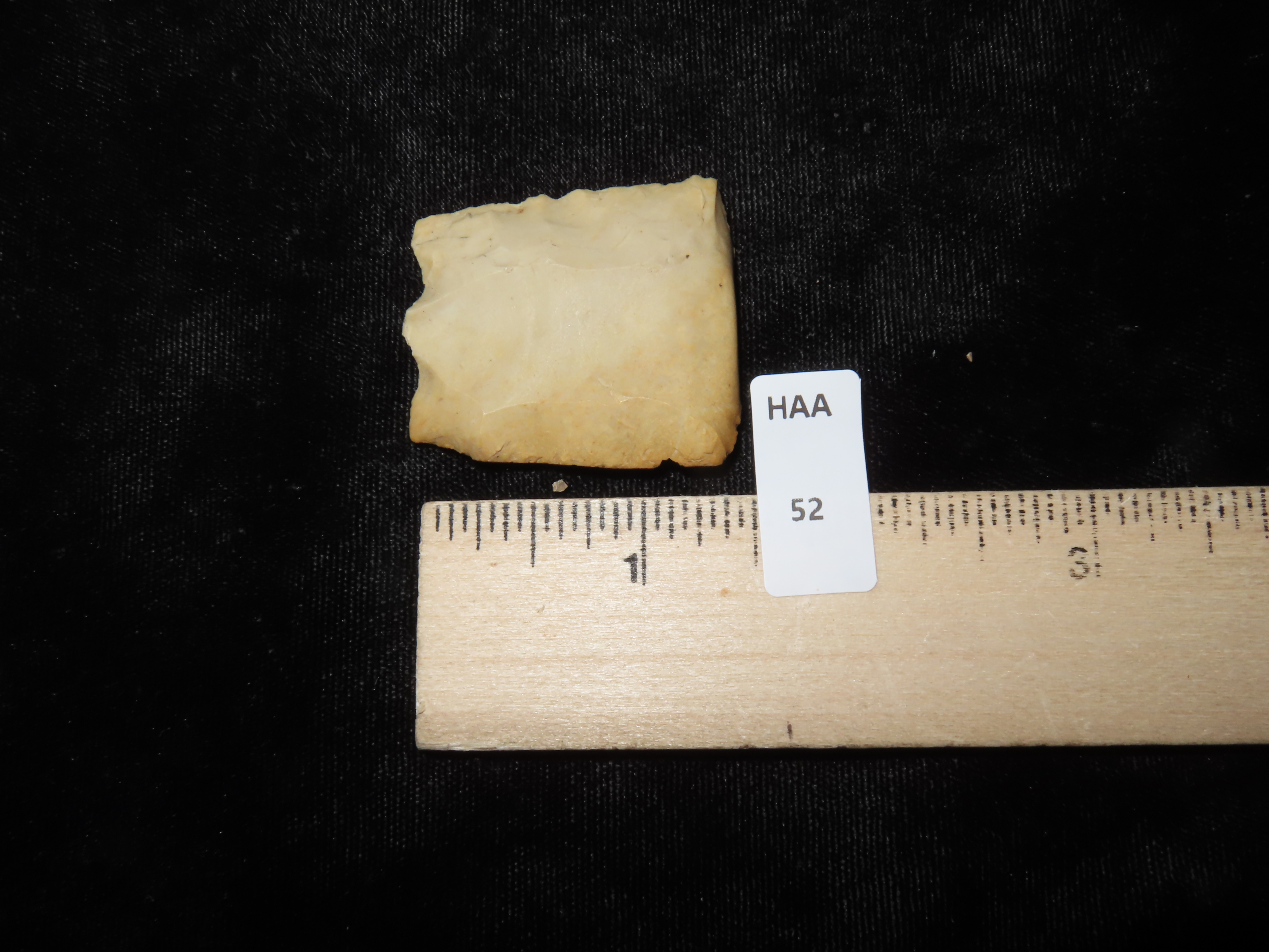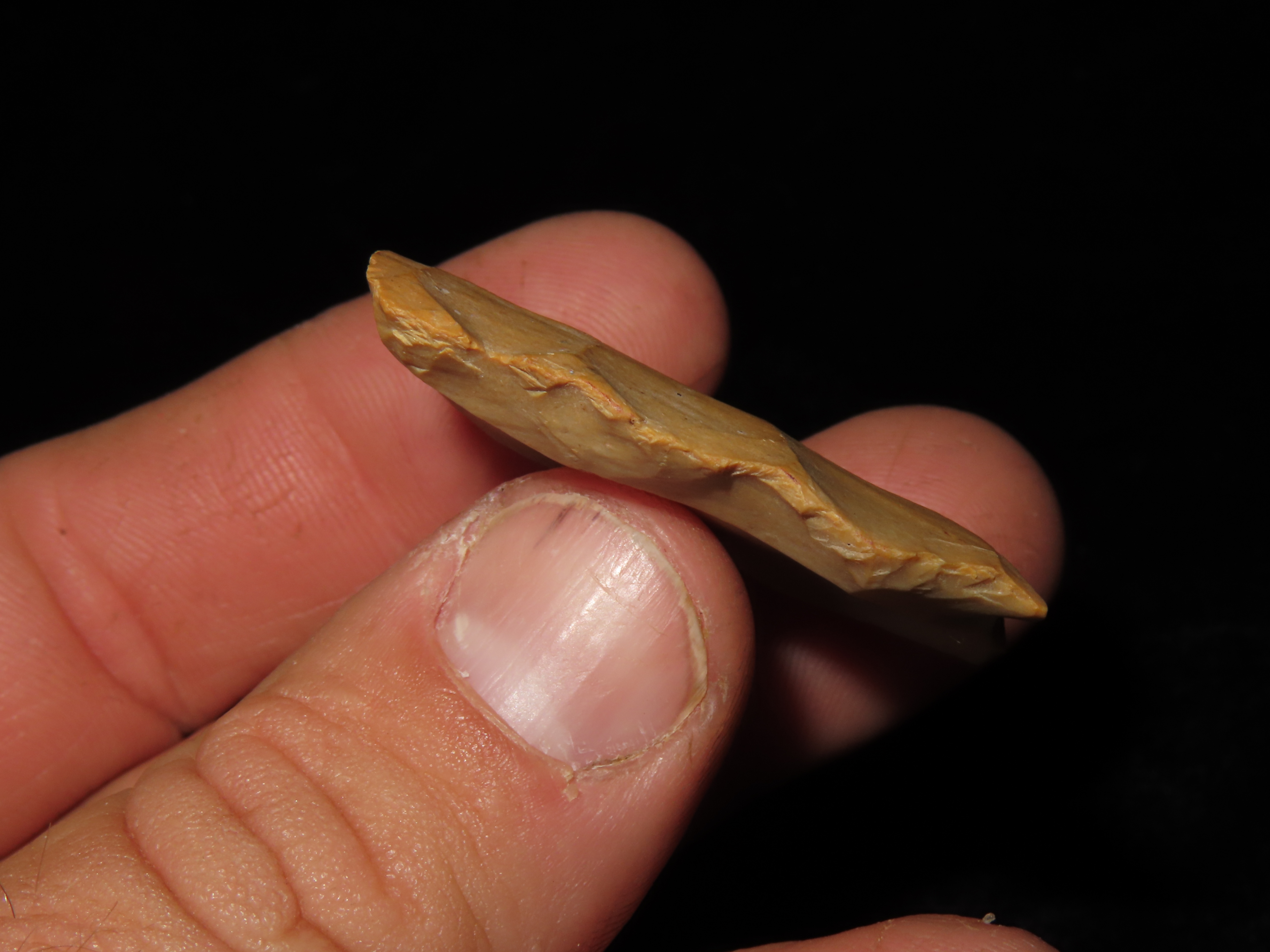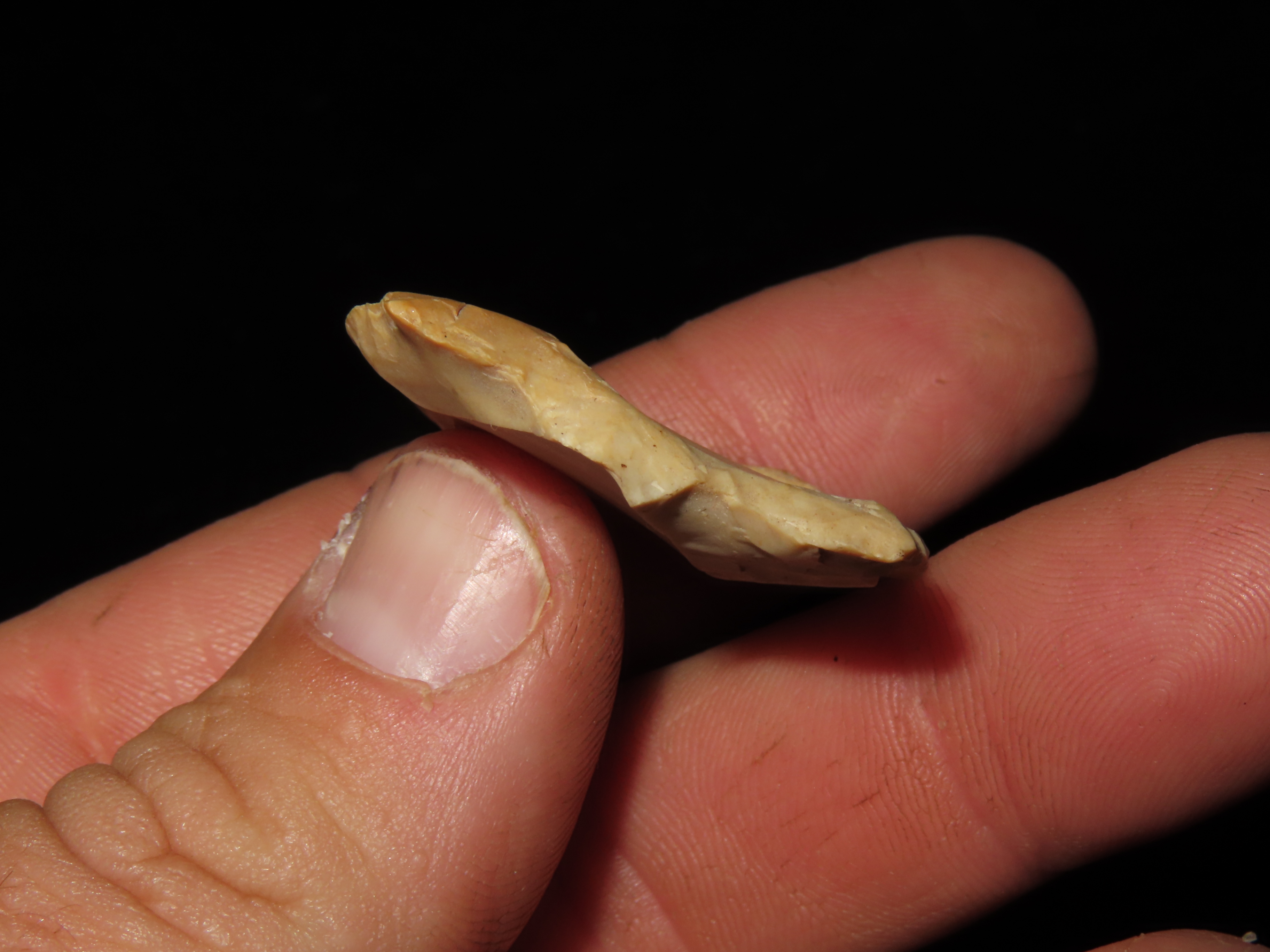 2 1/2″ Broken Clovis Base, found by Steve White in Pike Co., Illinois while digging a foundation