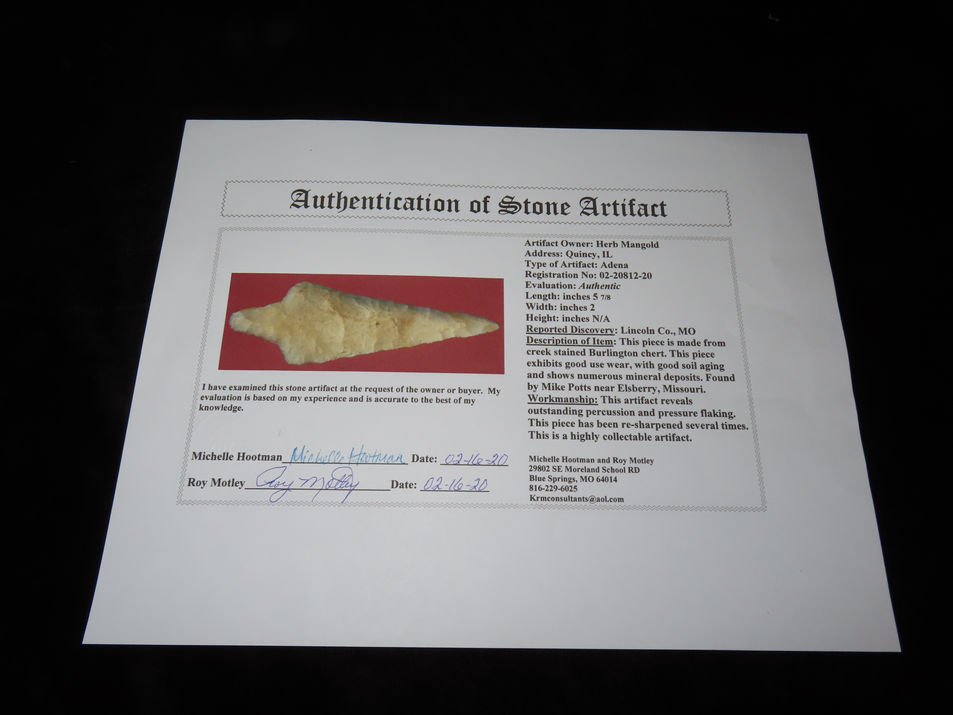 5 7/8″ Adena, Motley COA, found in by Mike Potts in Elsberry Missouri, Lincoln Co., Ex Herb Mangold Collection
