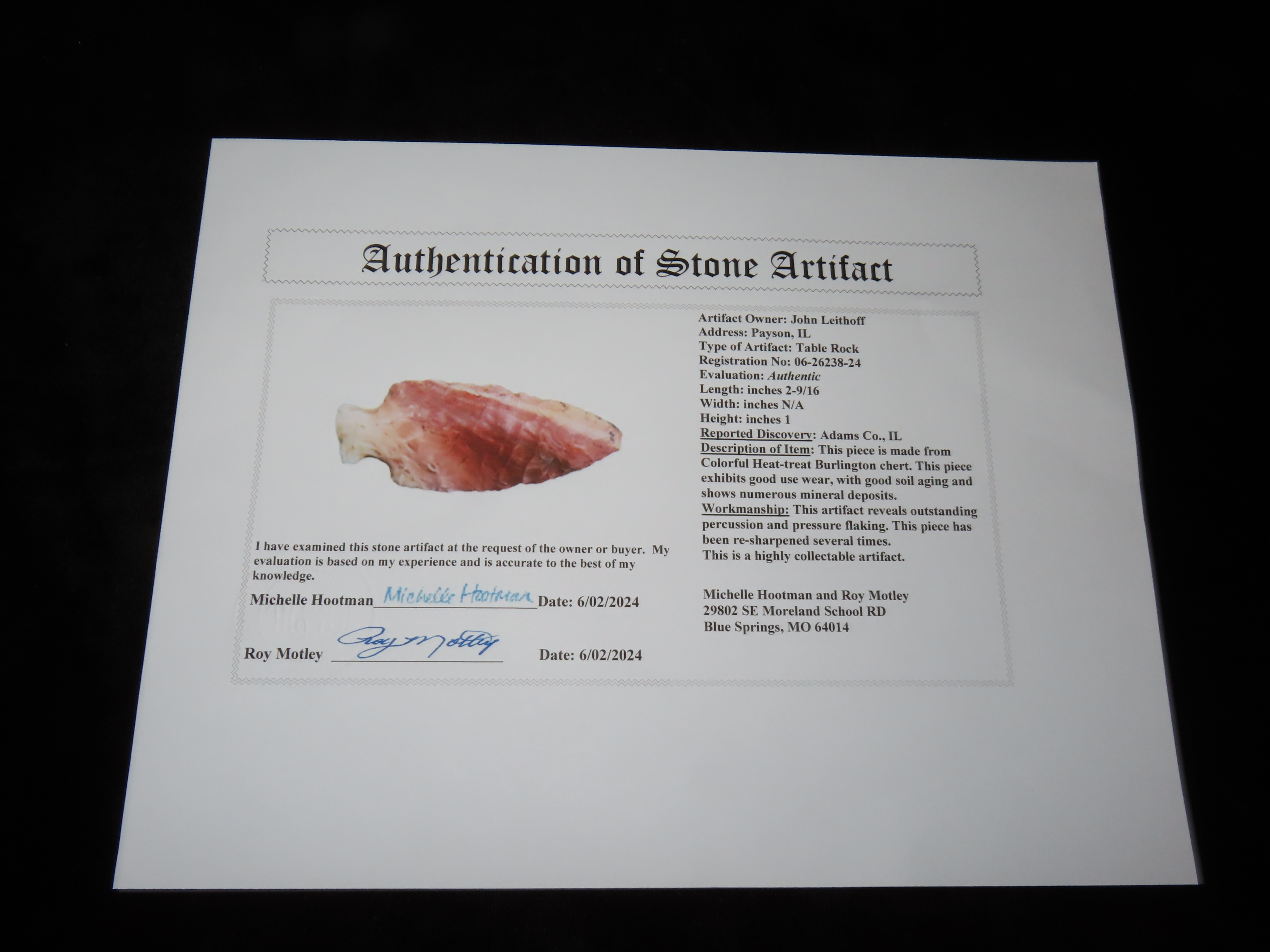 2 9/16″ Table Rock, Motley COA, Extreme Color, found in Adams Co., Illinois, Ex John Leithoff Collection