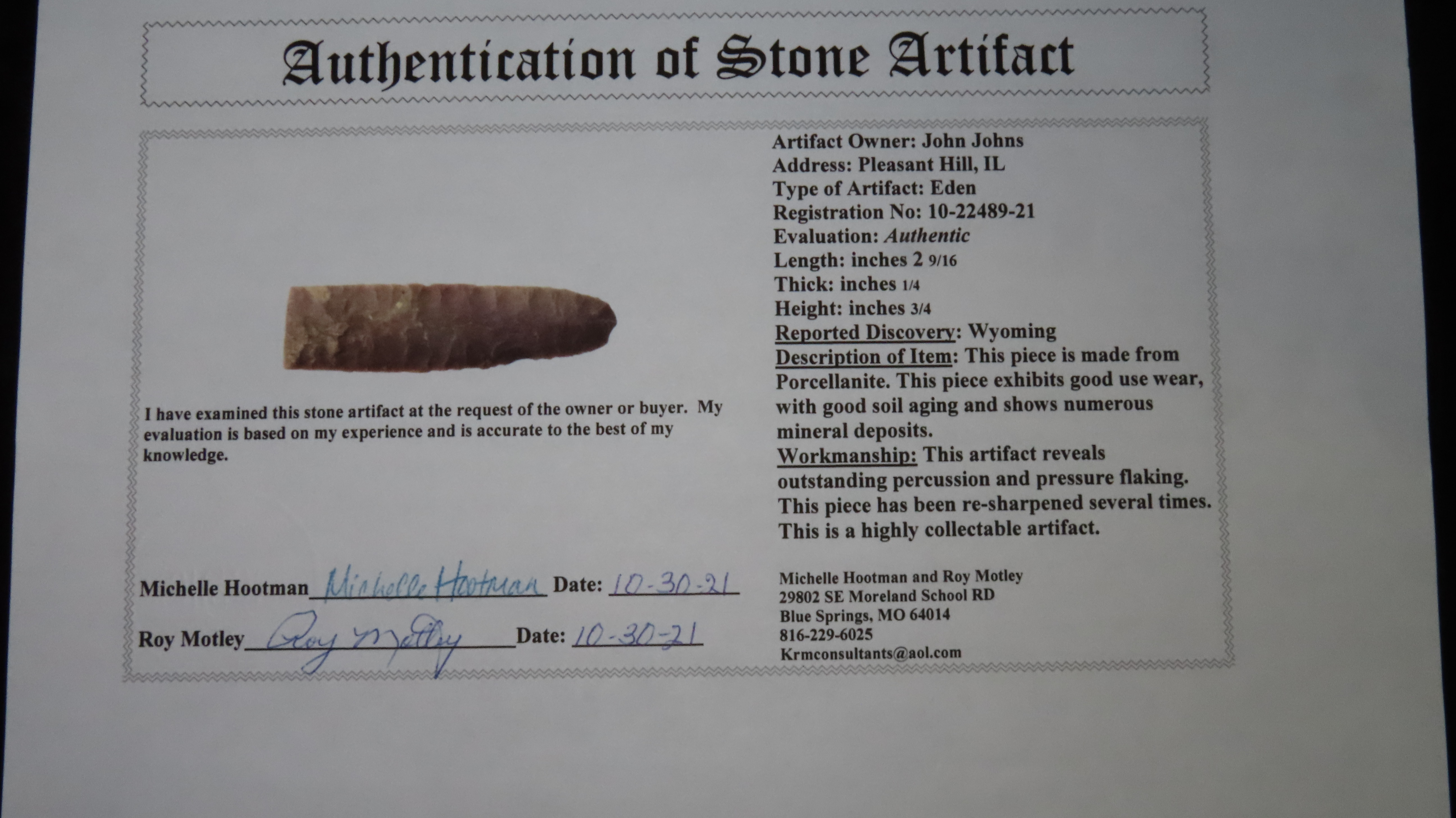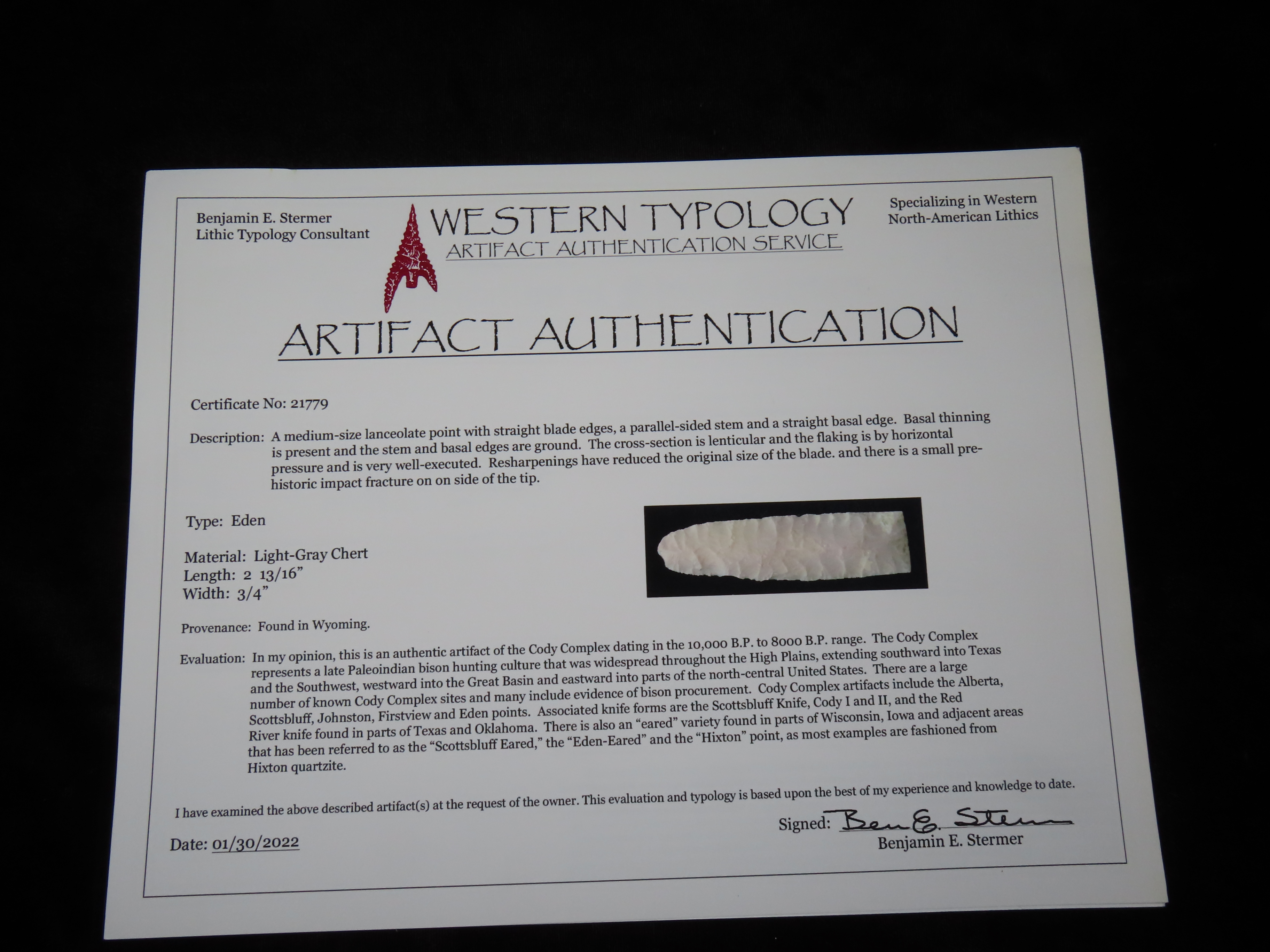 2 13/16″ Eden, Stermer COA, found in Wyoming, Ex John Johns, Ex Jerry Bolin Collection