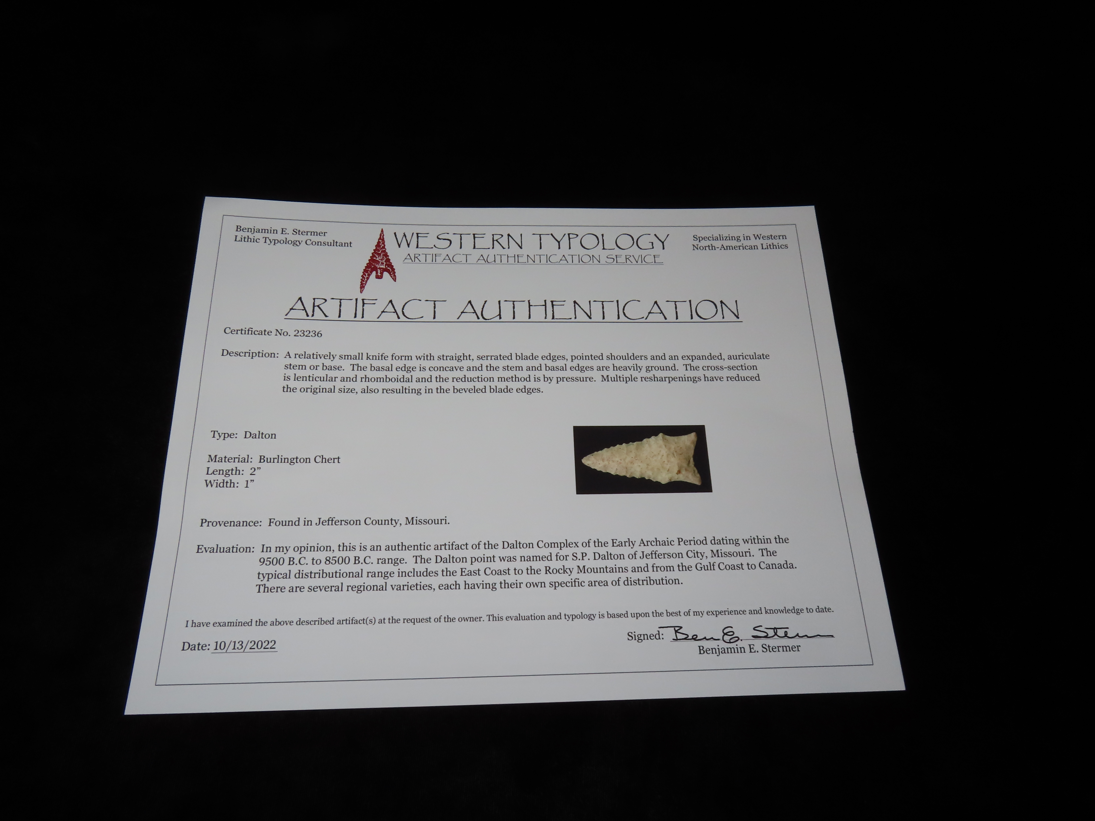 2″ Dalton, Stermer COA, Great Coloration, found in Jefferson Co., Missouri