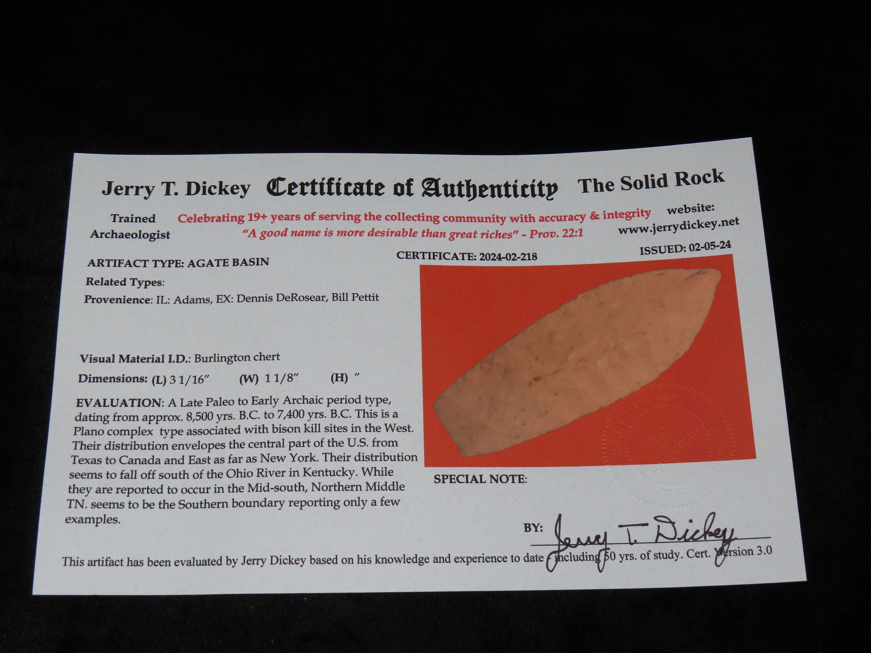 3 1/16″ Agate Basin, Dickey COA, found in Adams Co., Illinois, Ex Dennis DeRosear, Ex Bill Pettit Collections
