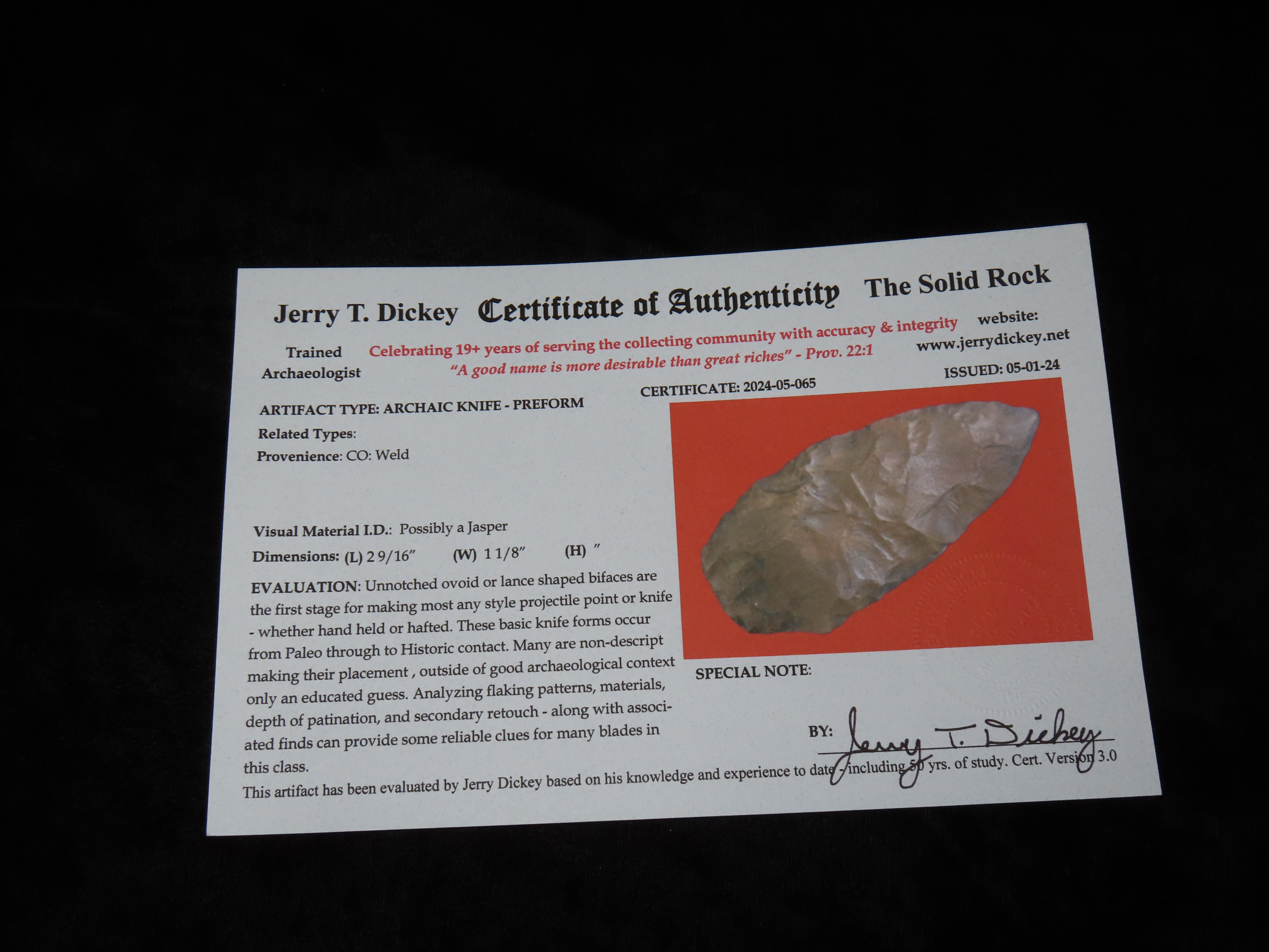 2 9/16″ Archaic Knife Pre-form, Dickey COA, found in Weld Co., Colorado