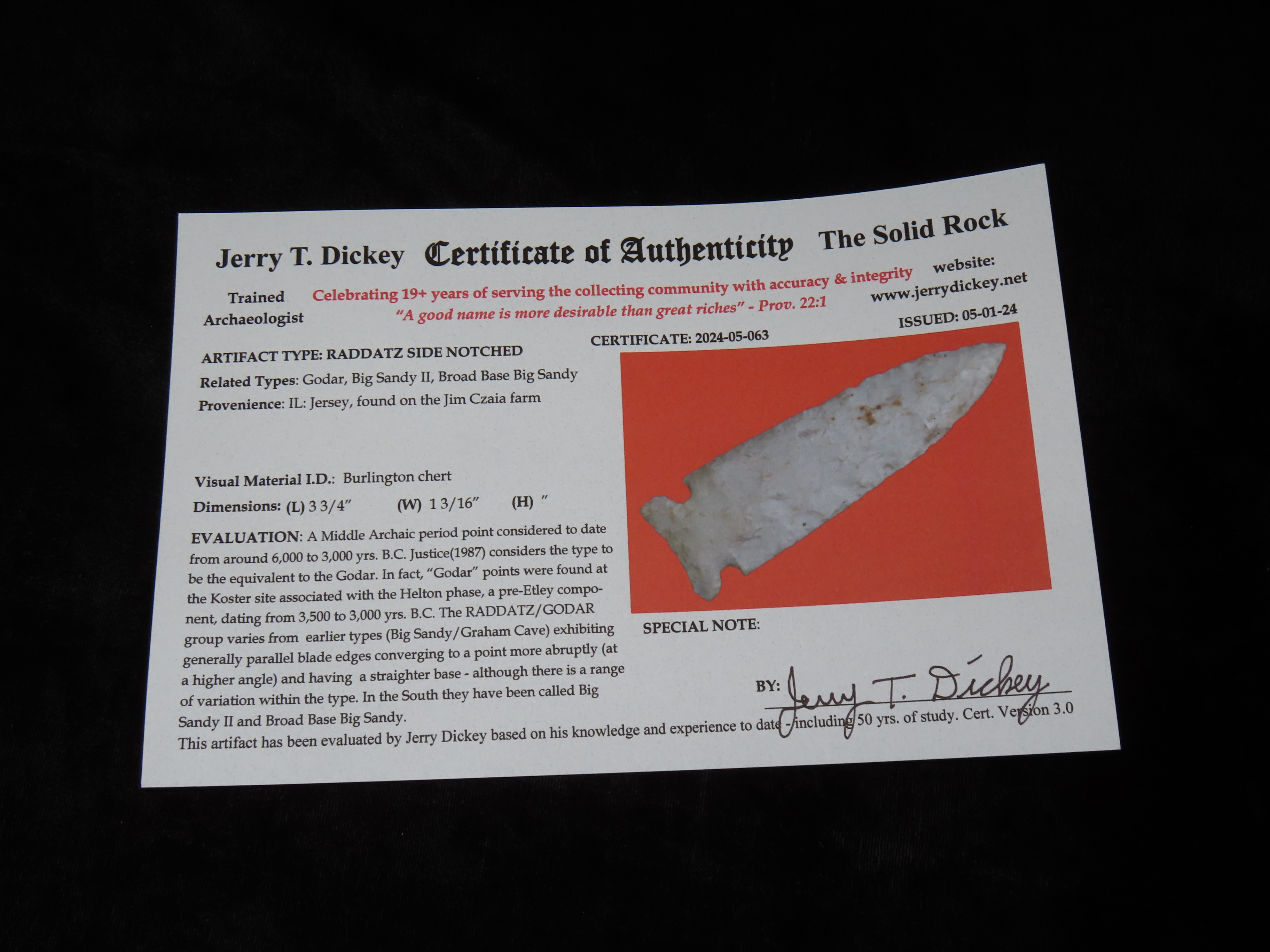 3 3/4" Raddatz Side Notch, Dickey COA, found by Joe Czaia on his farm in Jersey Co., Illinois