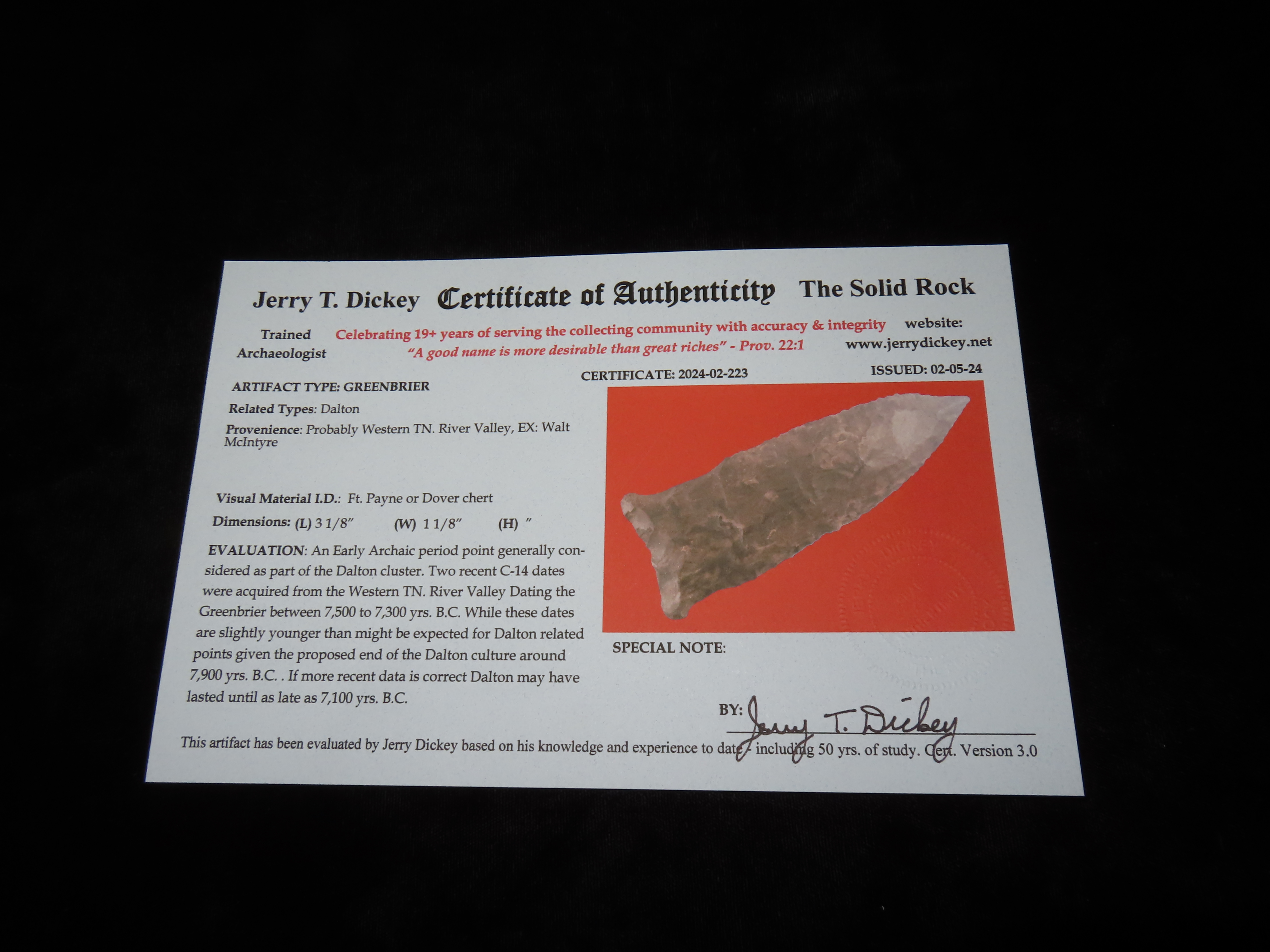 3 1/8″ Greenbrier, Dickey COA, found in Western Tennessee River Valley, Ex Walt McIntyre Collection