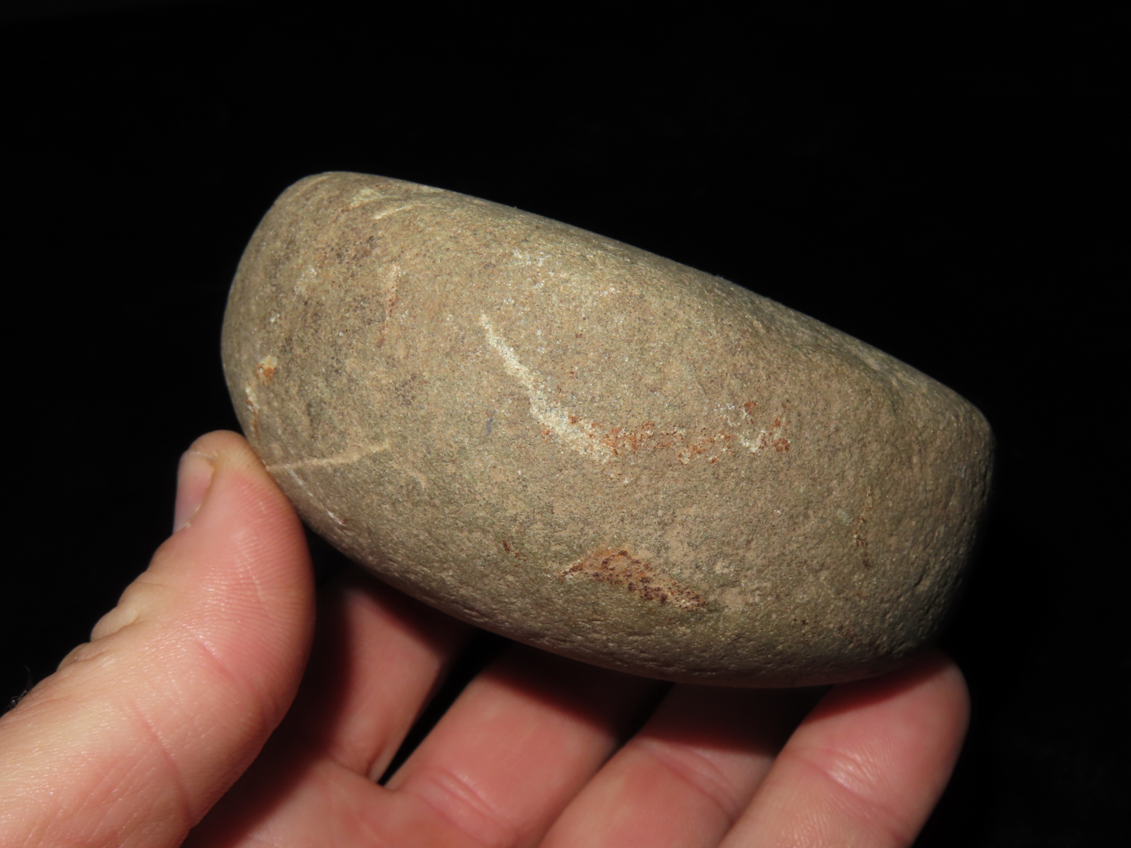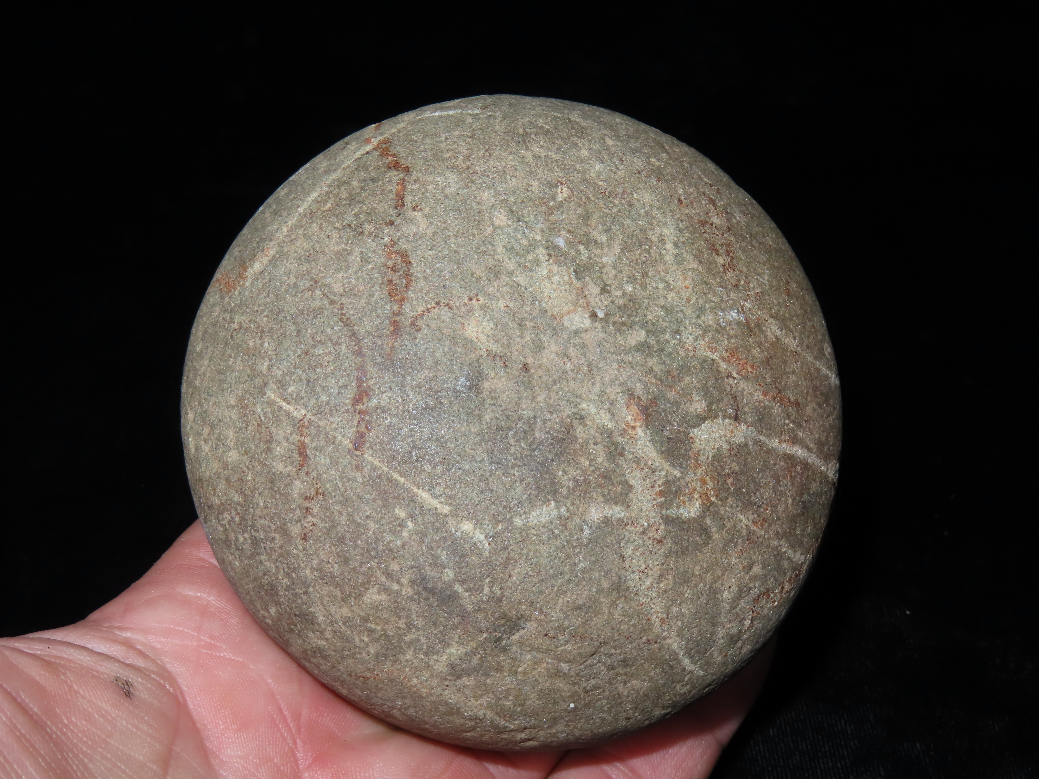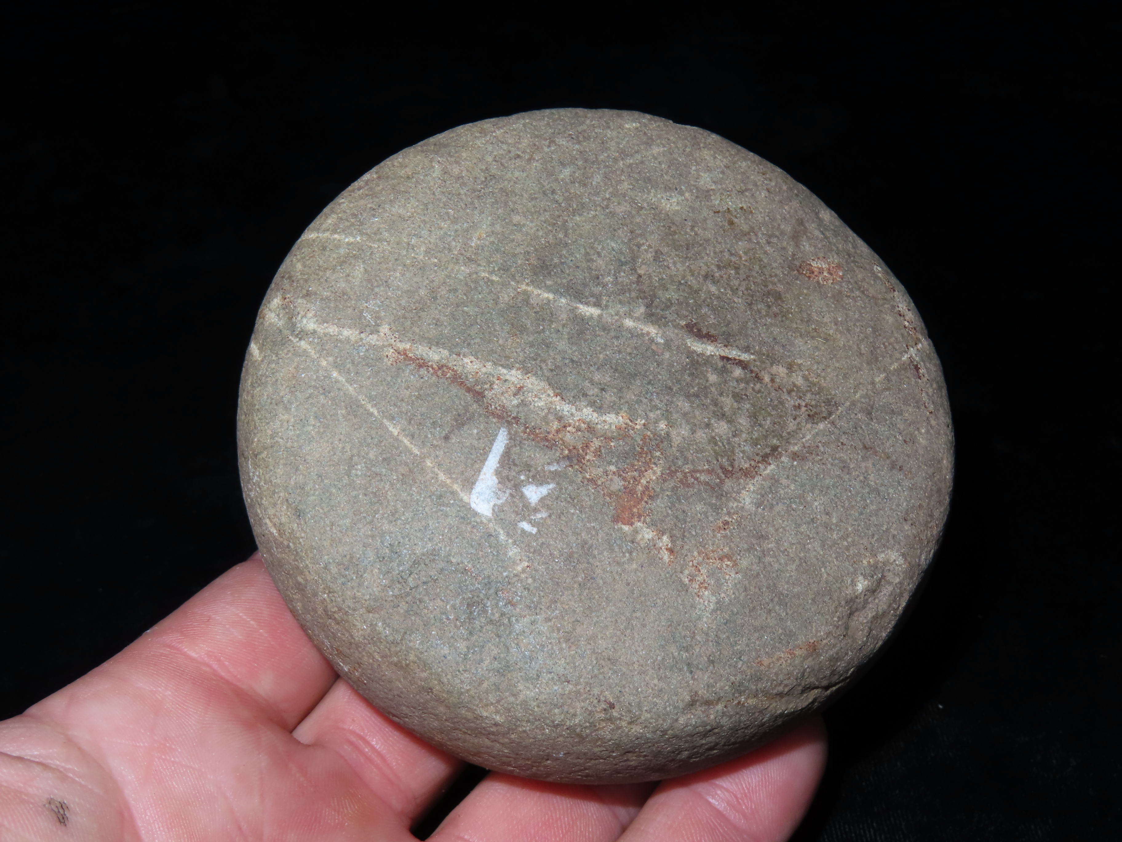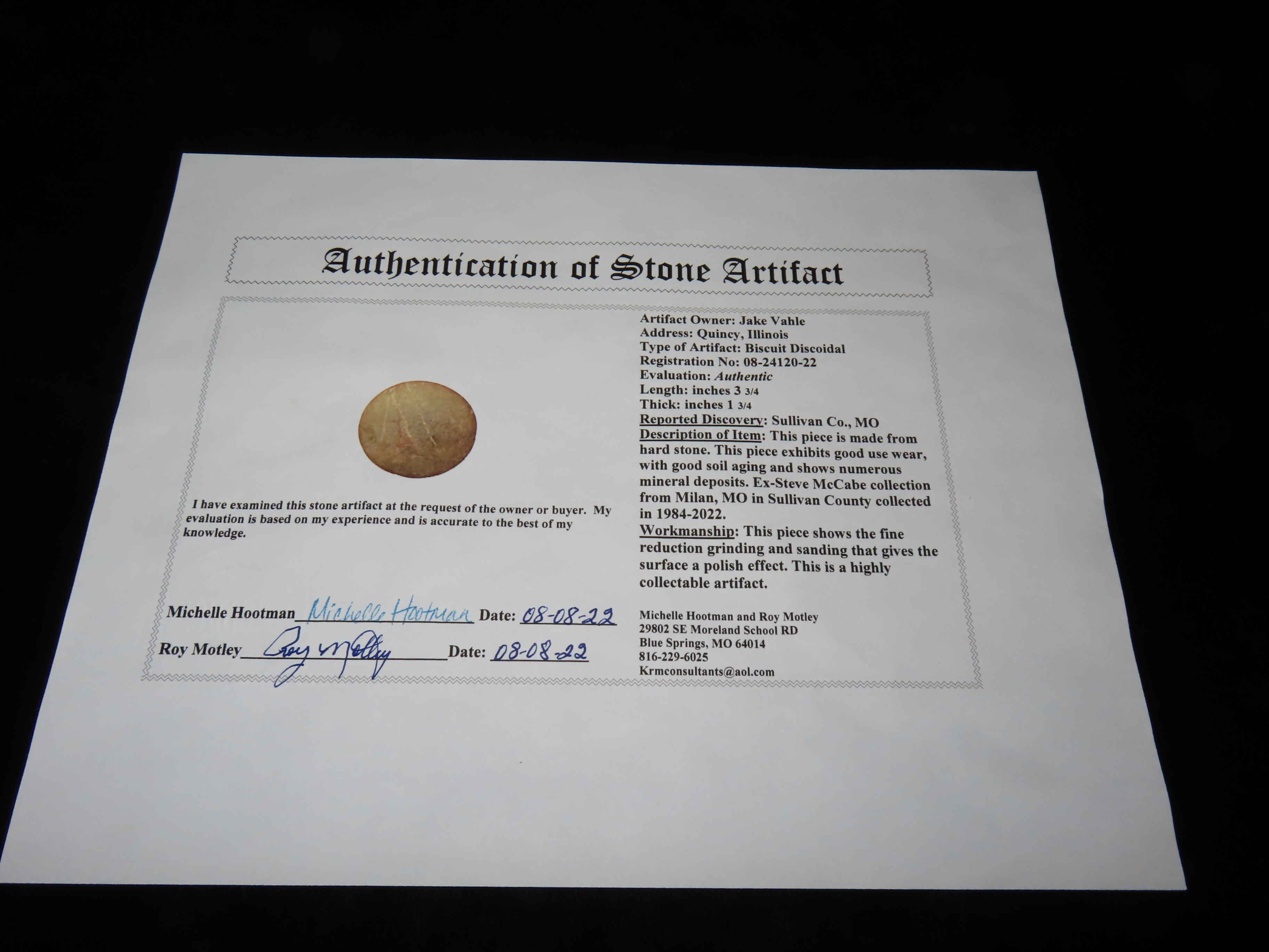 3 3/4″ Biscuit Discoidal, Motley COA, found in Sullivan Co., Missouri, Ex Steve McCabe Collection