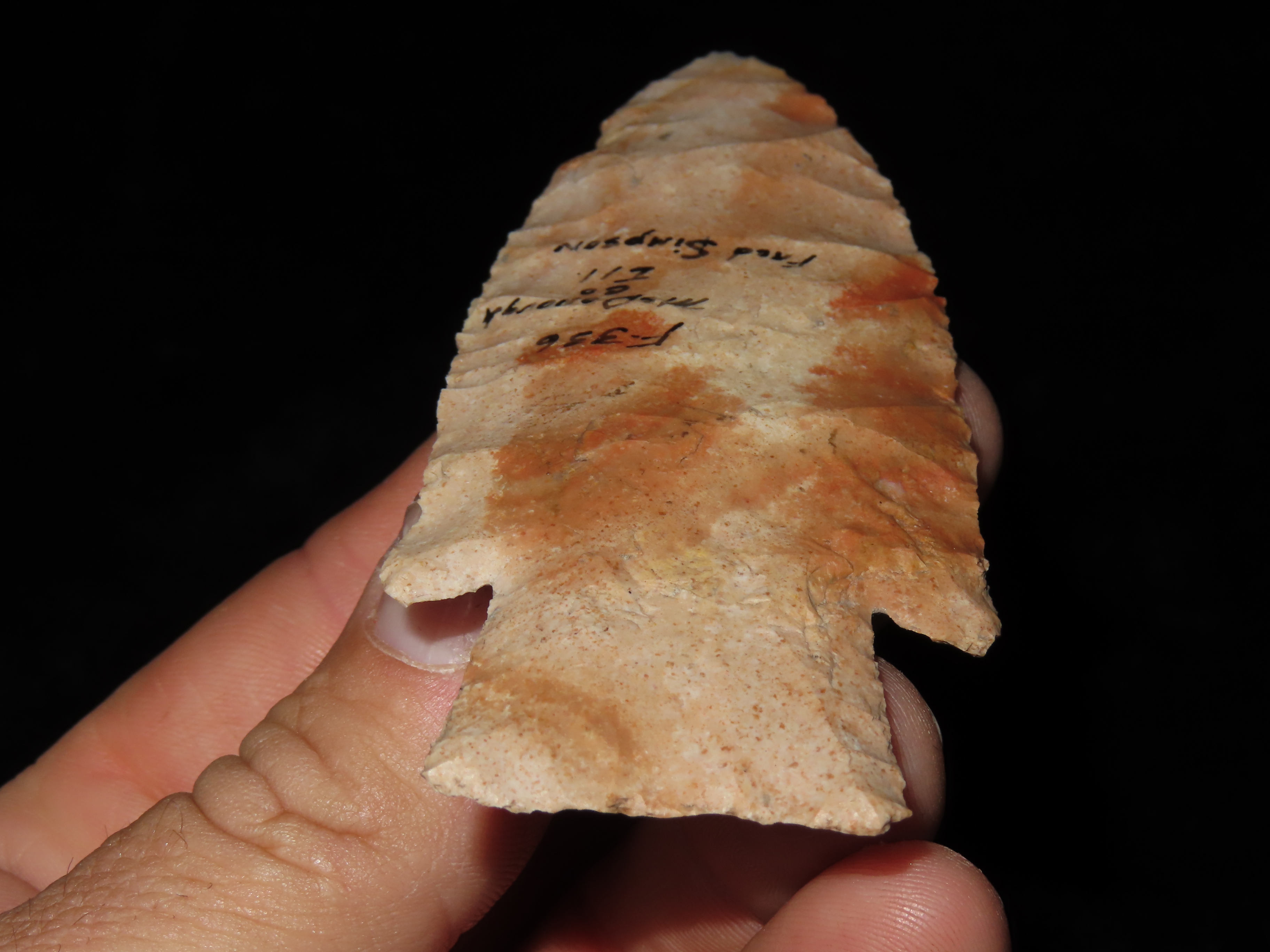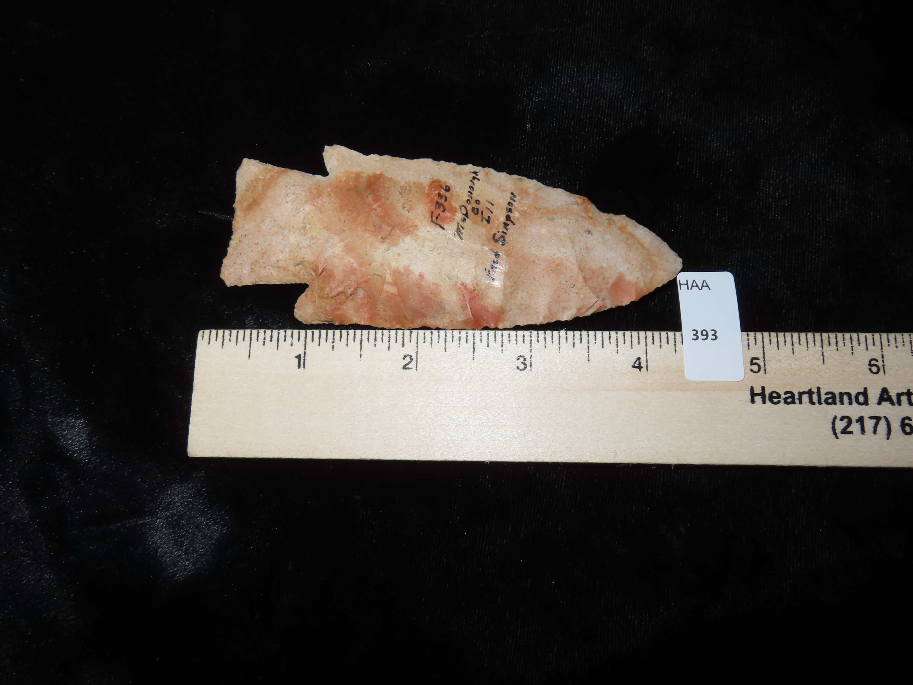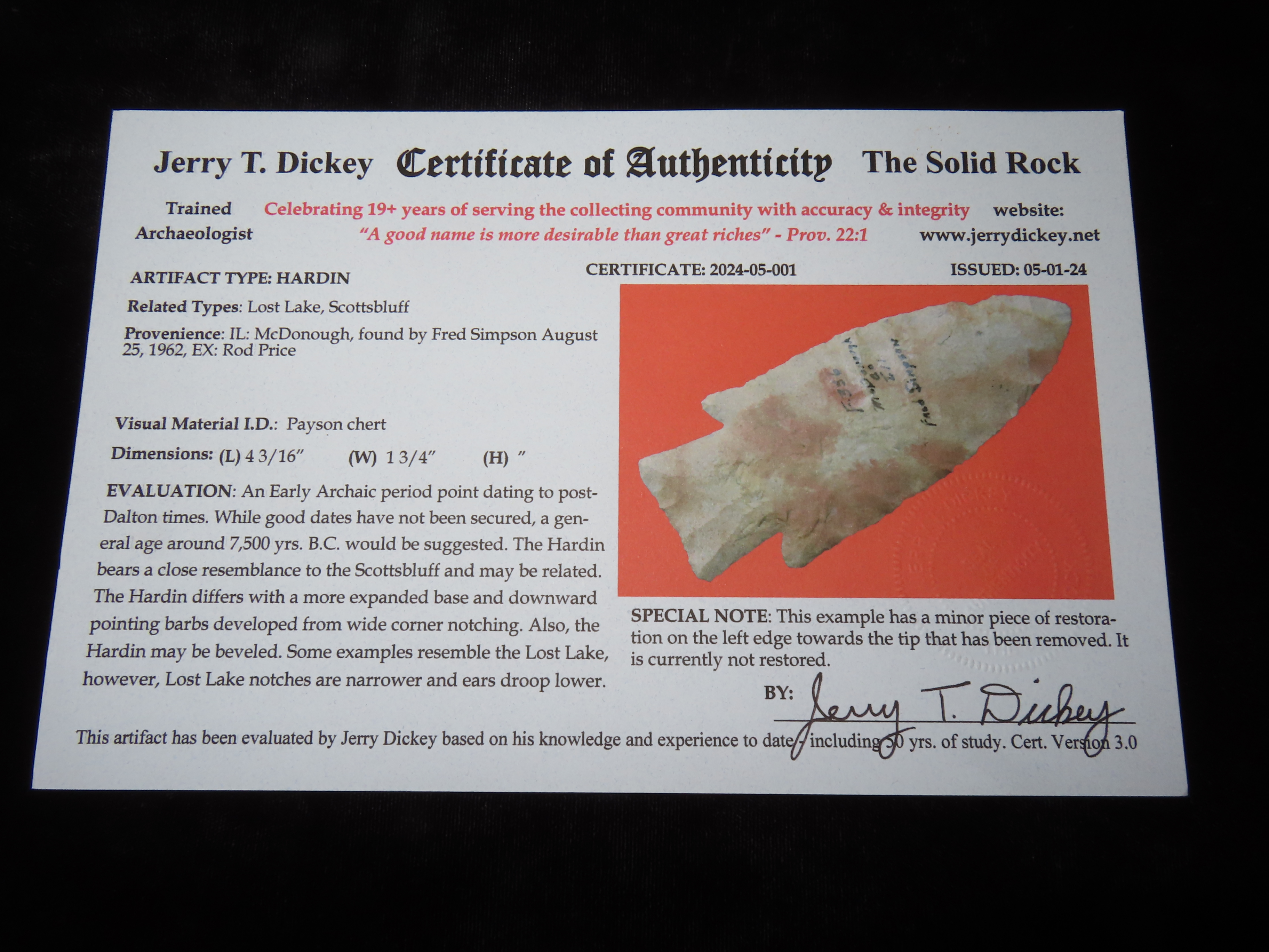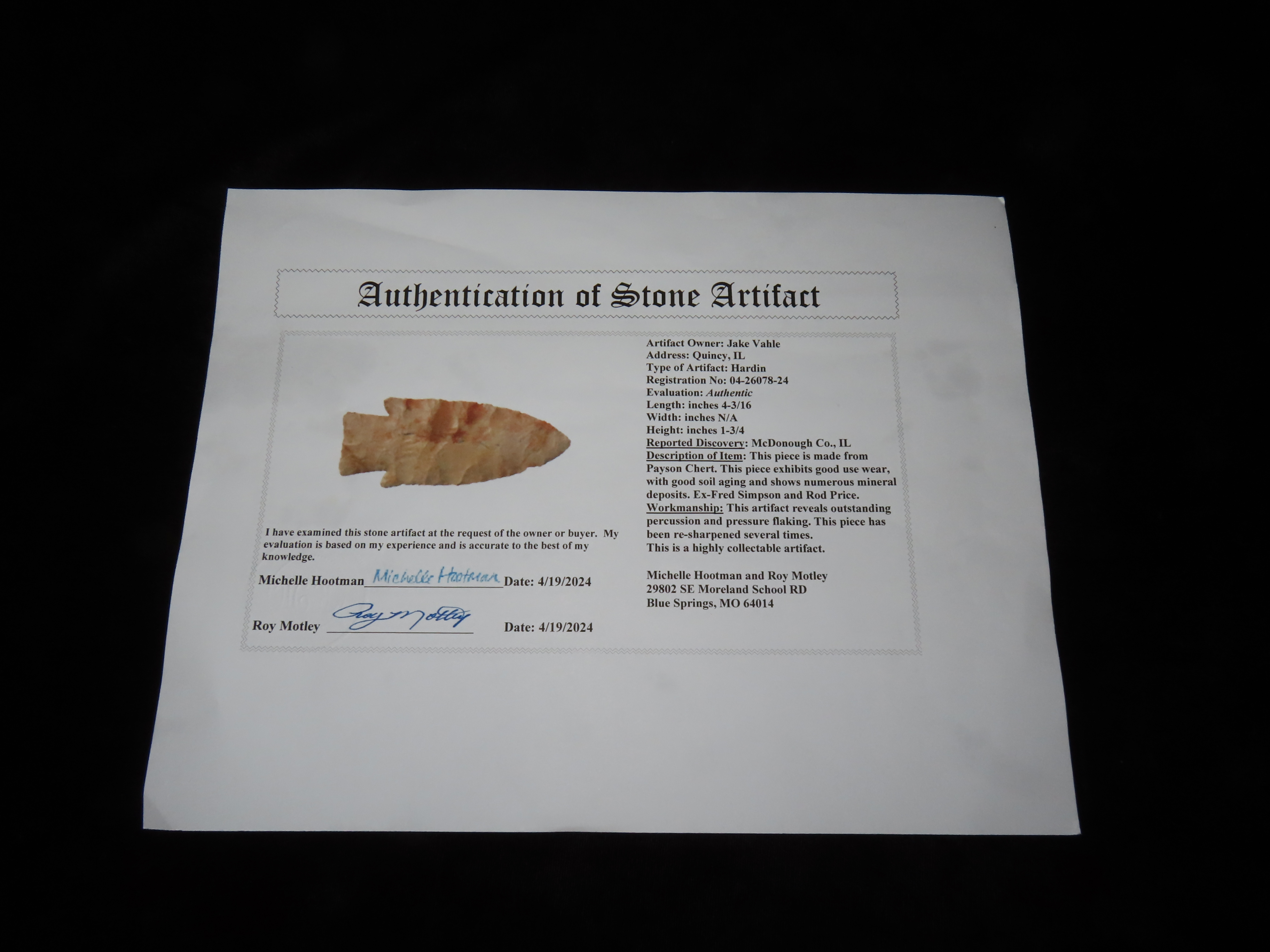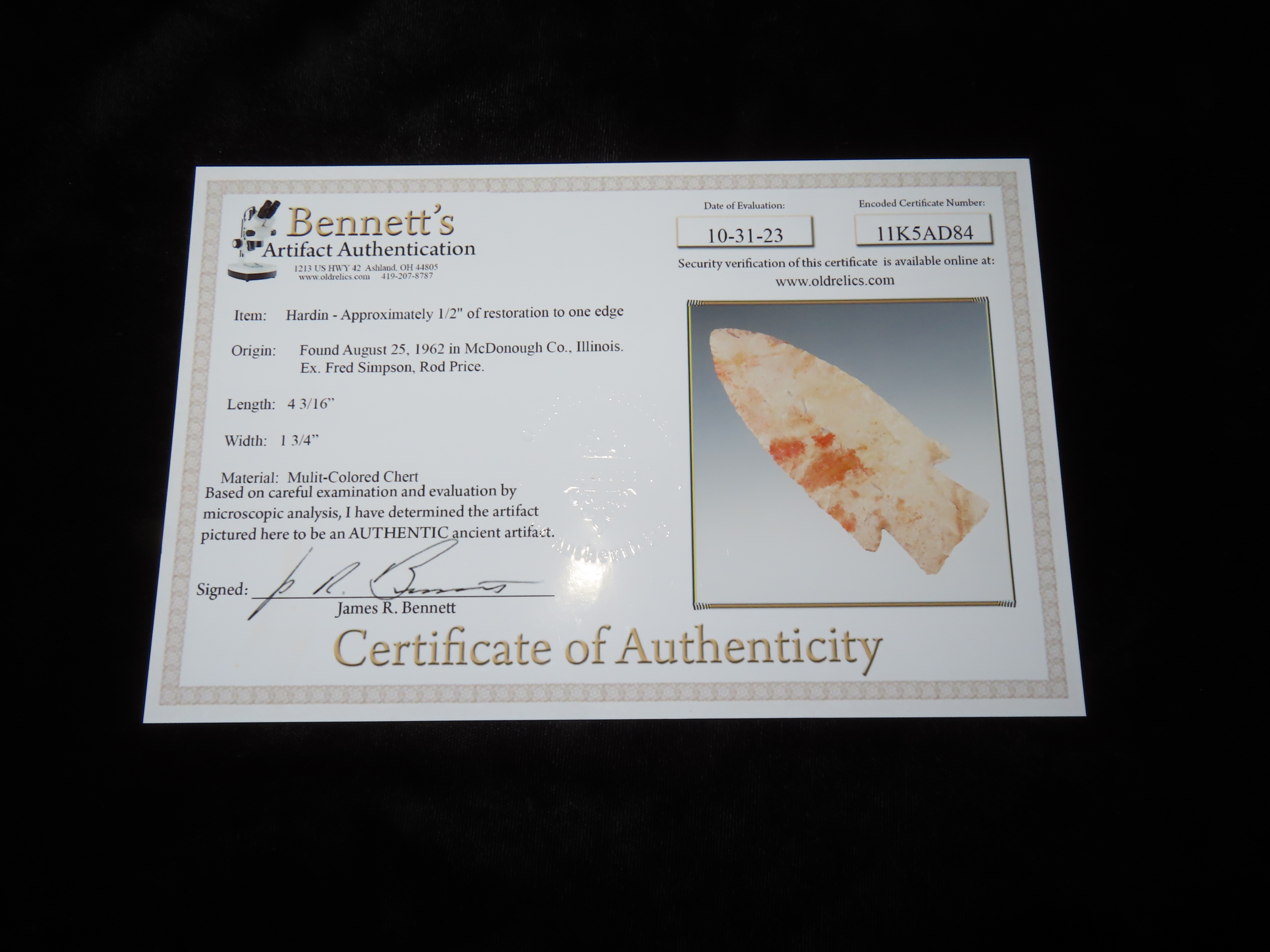 4 3/16″ Hardin, 3xCOA-Dickey/Bennett/Motley, found 8/25/1962 in McDonough Co., Illinois and made of colorful Payson Chert, this point is featured in Who’s Who #4, Pg 258 as part of the Evan W. Price Collection from Astoria Illinois, Ex Fred Simpson, Ex Rod Price Collections