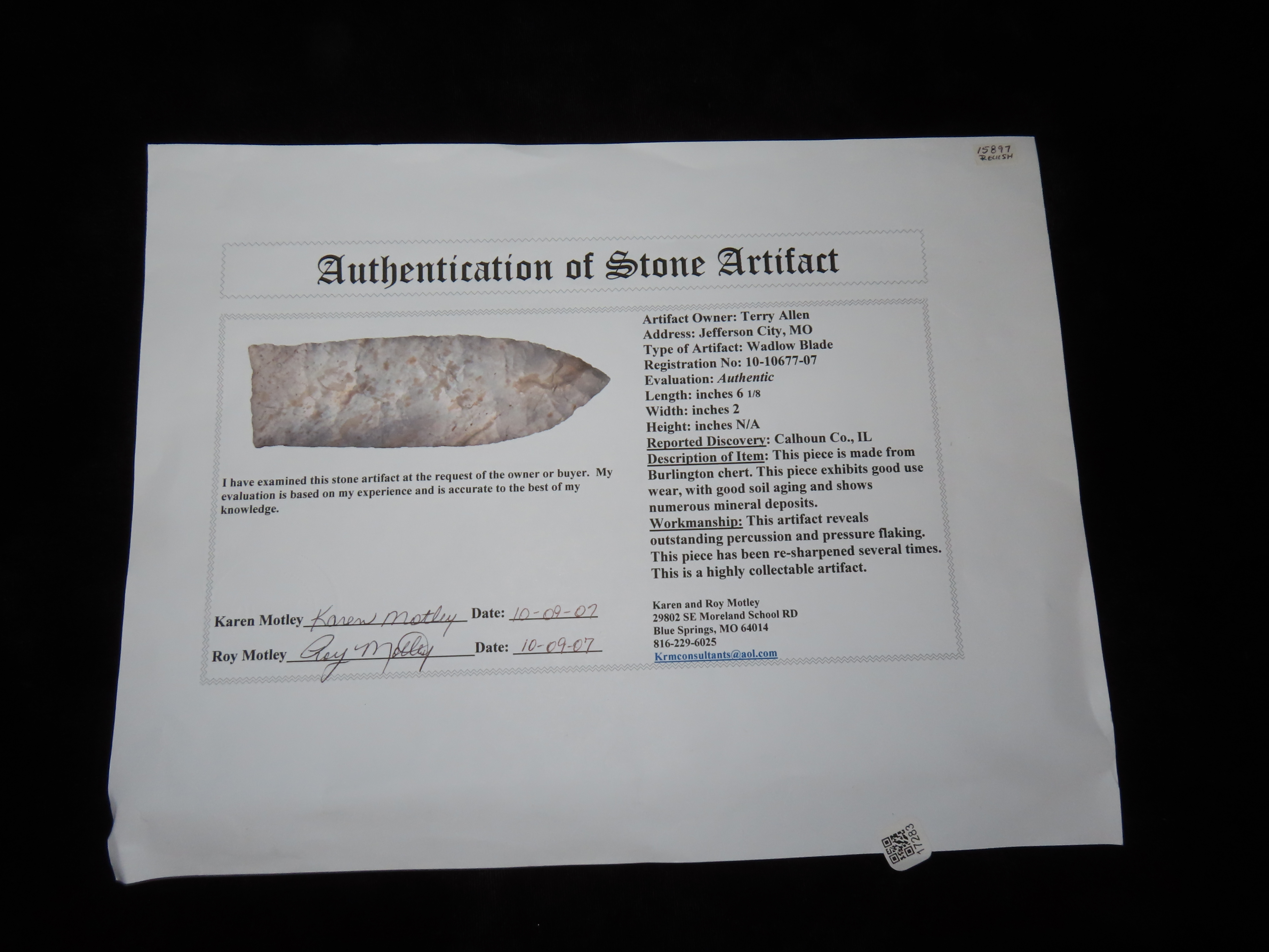 6 1/8″ Wadlow, Motley COA, found in Calhoun Co., Illinois, Ex Terry Allen Collection