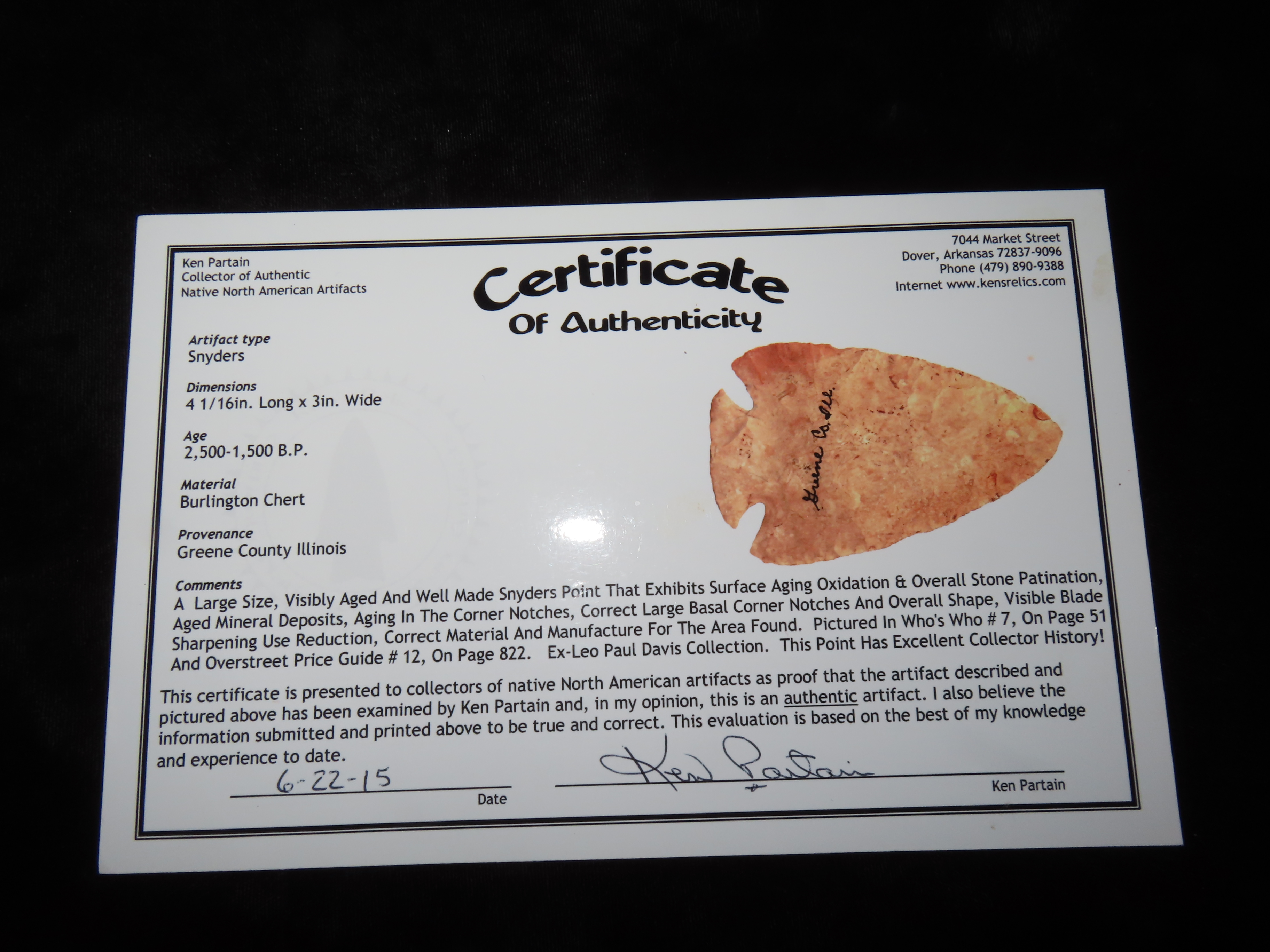 4 1/16″ Snyders, Partain COA, found in Greene Co., Illinois, this outstanding beauty is featured in Who’s Who #7, pg 51, and Overstreet Price Guide #12, pg 822! Ex Leo Paul Davis, Ex Terry Allen Collection