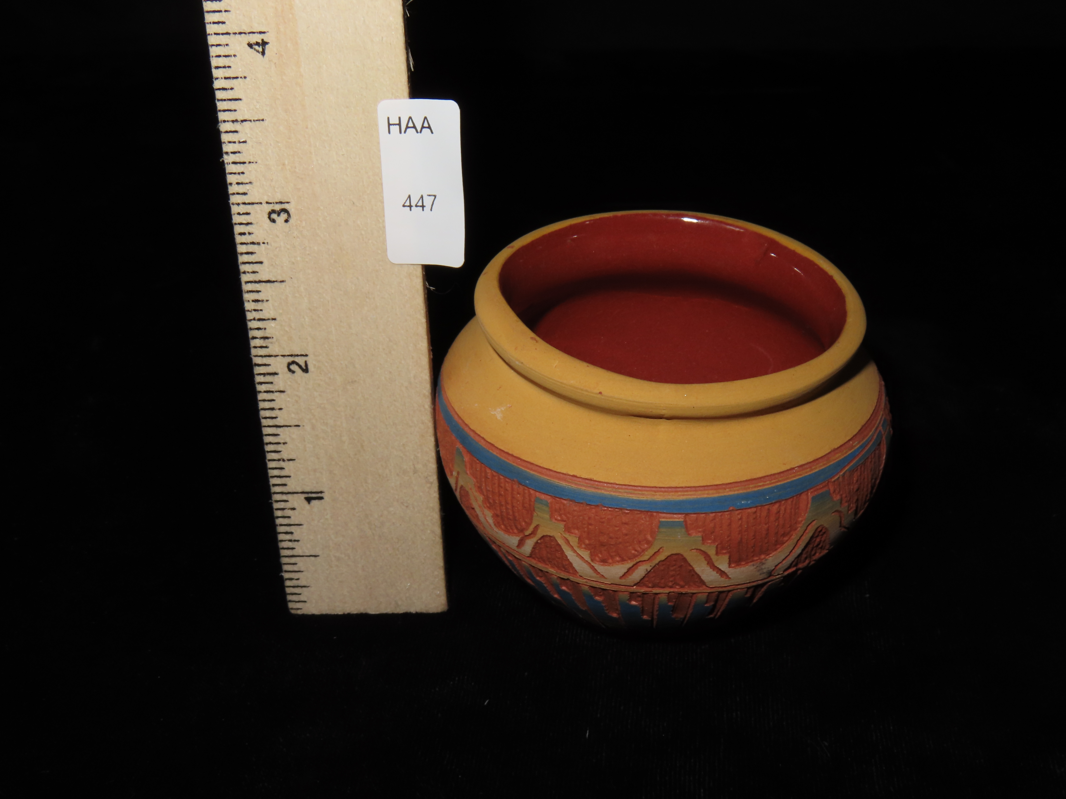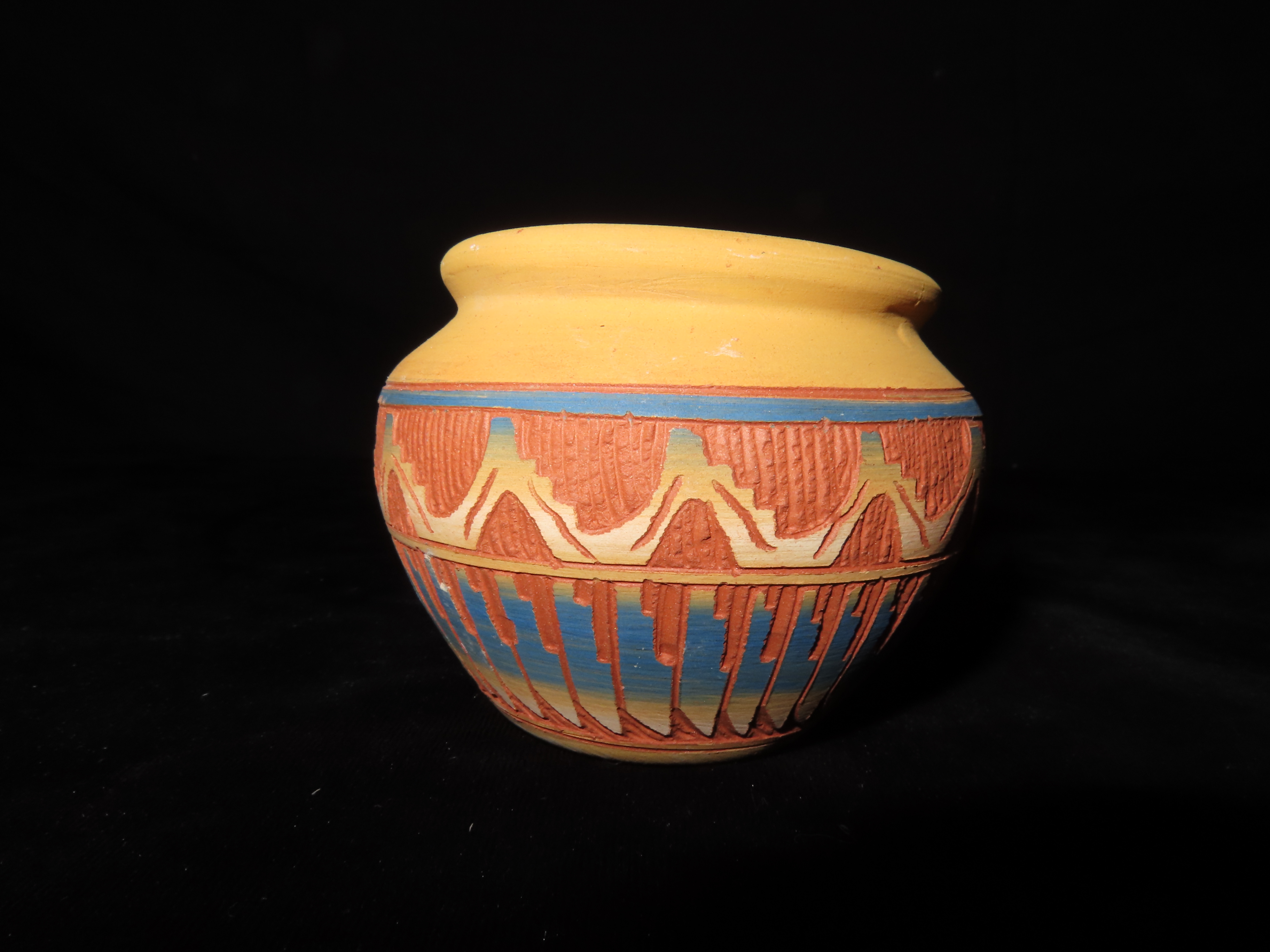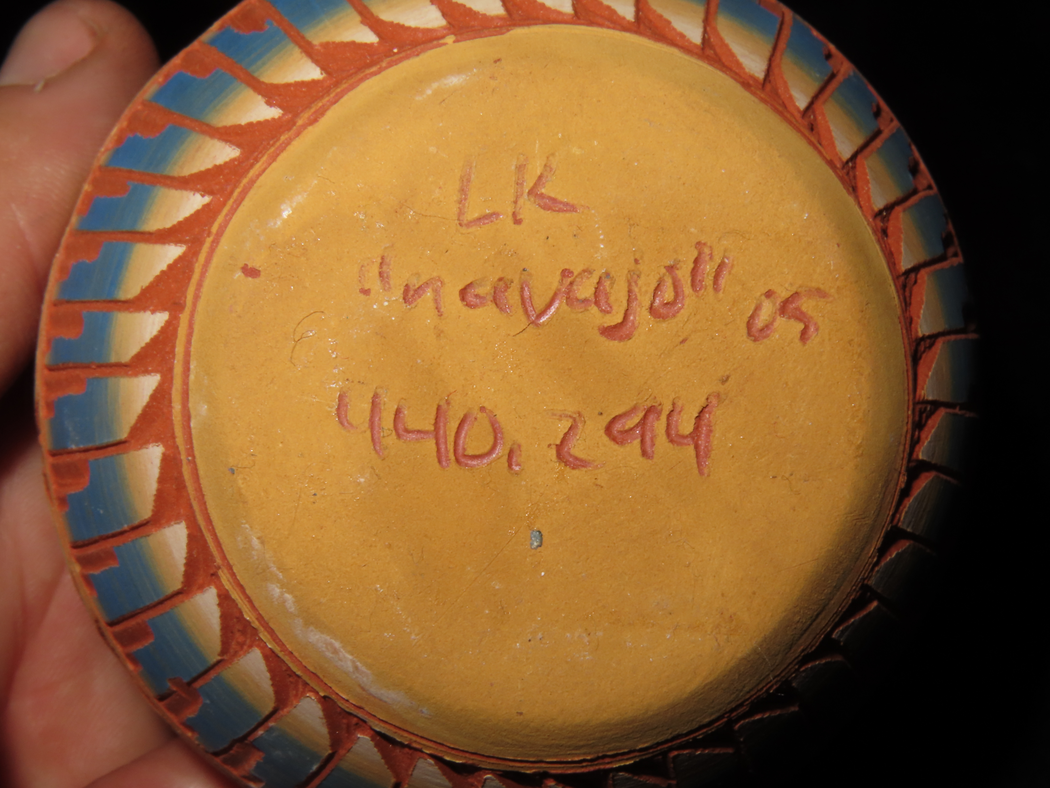 Authentic Native American Hand-crafted Pottery from the American Southwest, signed LK Navajo ’05; see photos for artist signature(if available) and approx. sizes. Key words: Native American, Indian, Signed, Navajo, Southwest, Pottery, Kokopelli, Fetish, Animal, Effigy, Anthropomorphic, Horse Hair, Terra Cotta, Hand-crafted, Fired, Glazed, Painted, Vintage, Santa Clara, Redware, Hopi, Acoma, Wedding Vase, Bowl, Vessel, Signed, Clay, Bear, Turtle, Canoe, Totem Pole, Totem, Anasazi, Cliff Dwelling, Vase, Urn, Dish, Red Clay, Black-on-black ware, Mud Hut, Incense, Lidded Box, Lidded bowl, University, Art, Project, Souvenir, Trade, Tourist, Tourism, Reservation, Hand made, New Mexico, Arizona, Red, Green, Blue, Yellow, Orange, Purple,Black