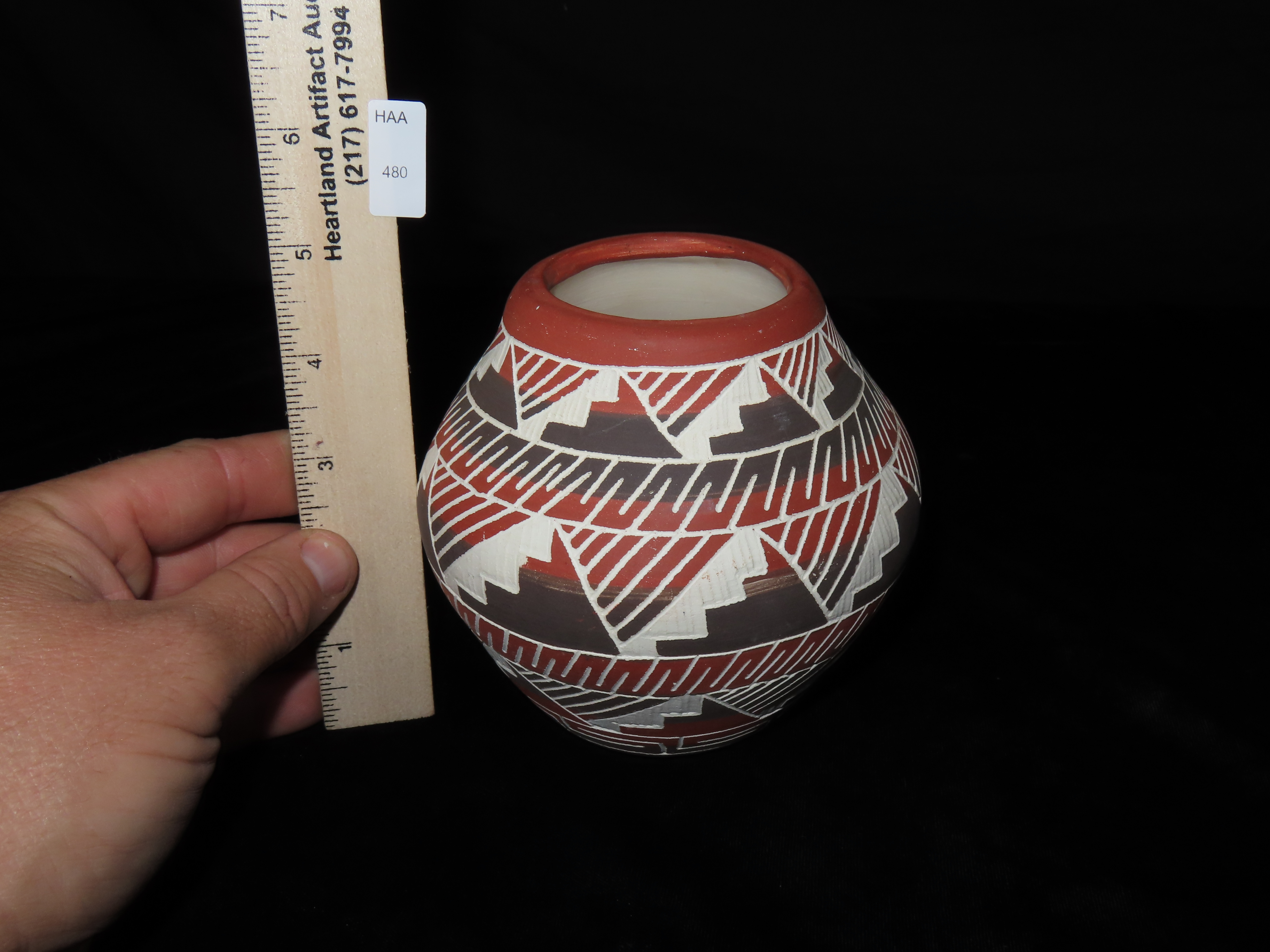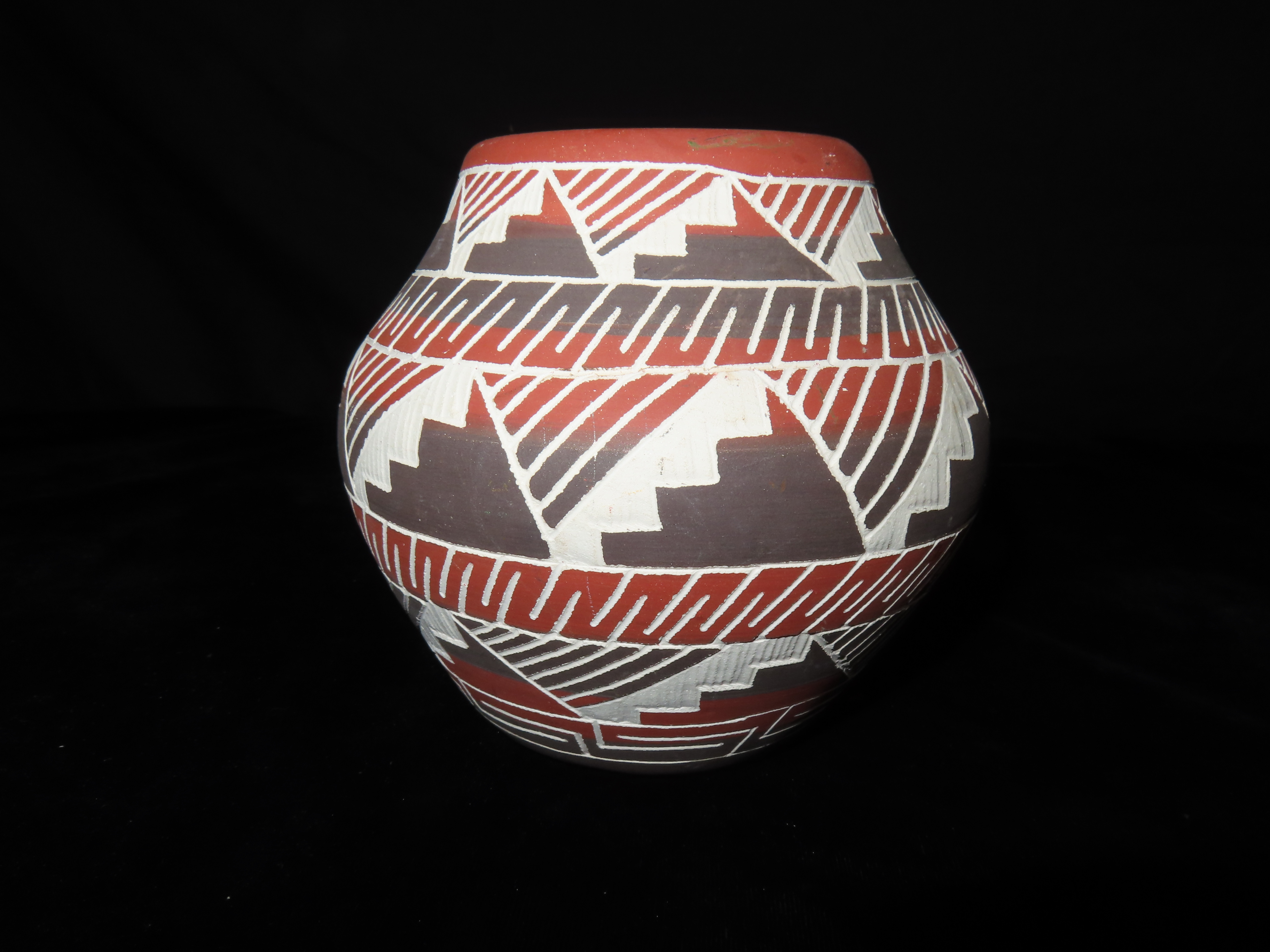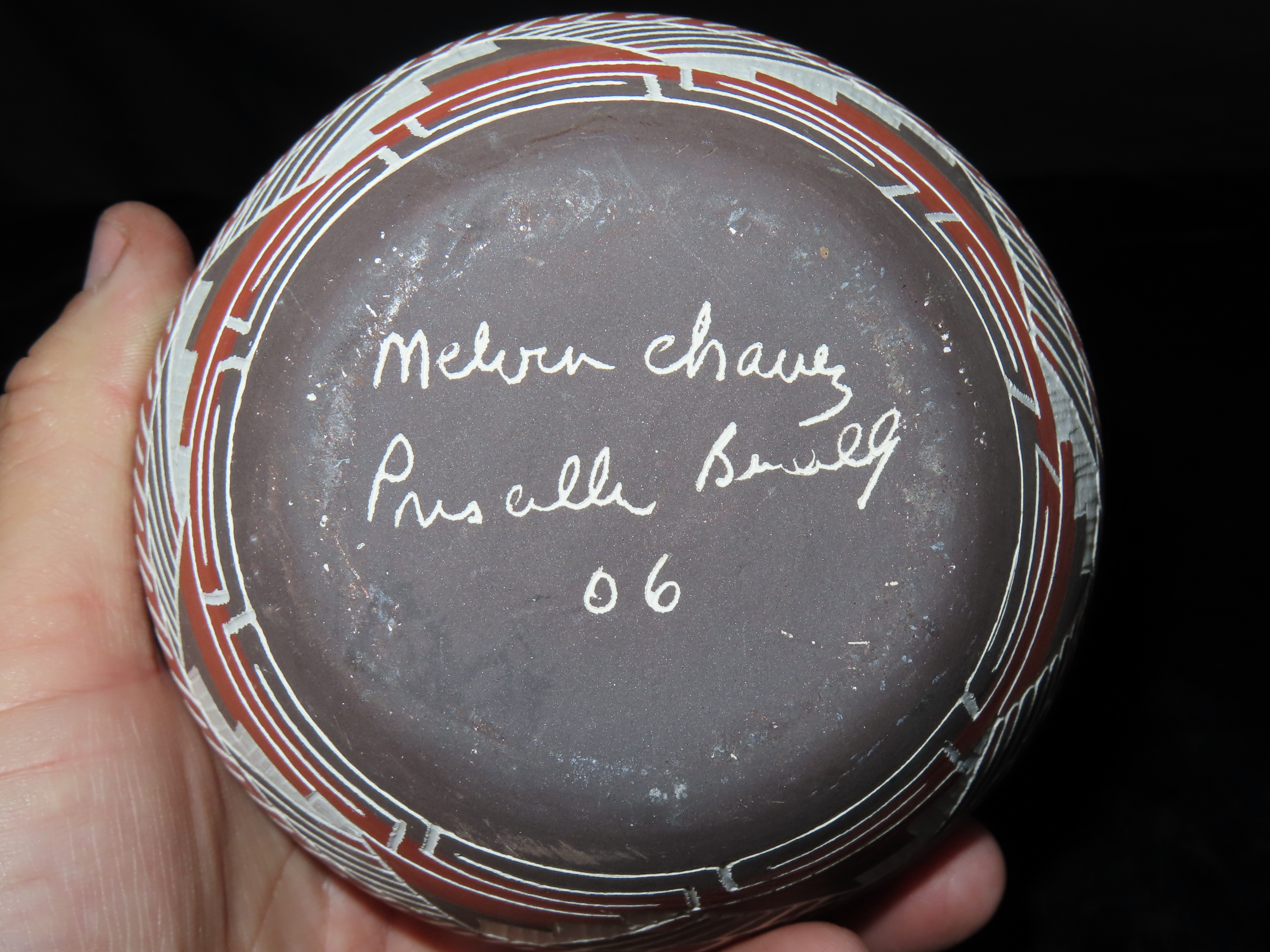 Authentic Native American Hand-crafted Pottery from the American Southwest, signed Melvin Chavez & Prisella ? ’06; see photos for artist signature(if available) and approx. sizes. Key words: Native American, Indian, Signed, Navajo, Southwest, Pottery, Kokopelli, Fetish, Animal, Effigy, Anthropomorphic, Horse Hair, Terra Cotta, Hand-crafted, Fired, Glazed, Painted, Vintage, Santa Clara, Redware, Hopi, Acoma, Wedding Vase, Bowl, Vessel, Signed, Clay, Bear, Turtle, Canoe, Totem Pole, Totem, Anasazi, Cliff Dwelling, Vase, Urn, Dish, Red Clay, Black-on-black ware, Mud Hut, Incense, Lidded Box, Lidded bowl, University, Art, Project, Souvenir, Trade, Tourist, Tourism, Reservation, Hand made, New Mexico, Arizona, Red, Green, Blue, Yellow, Orange, Purple,Black