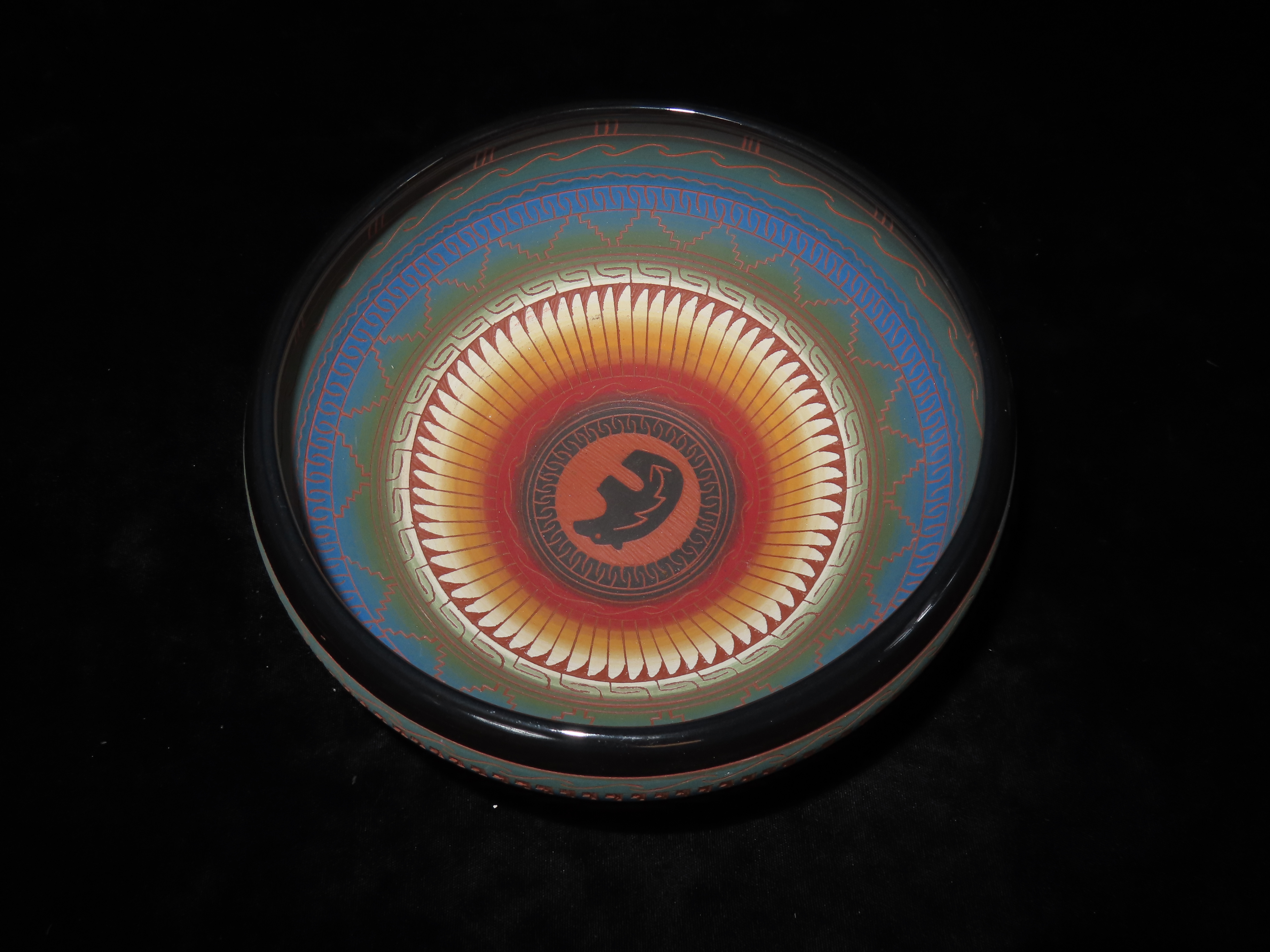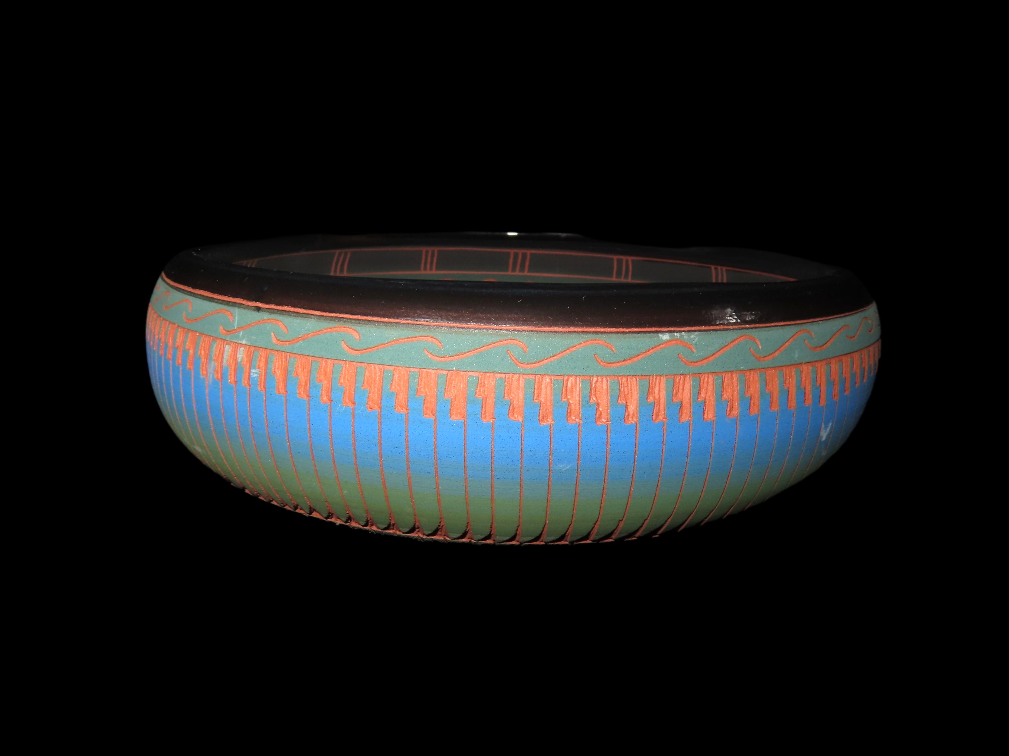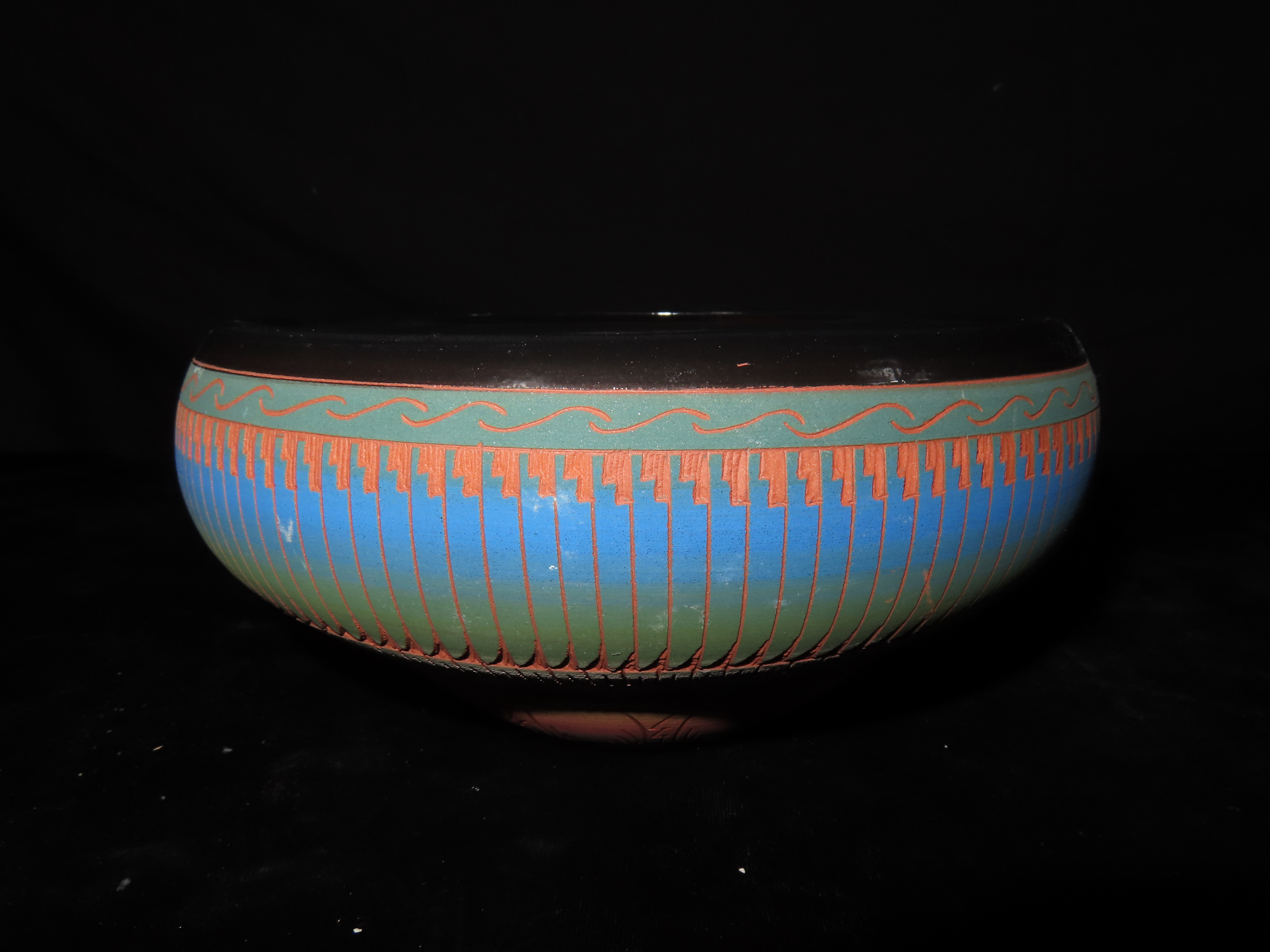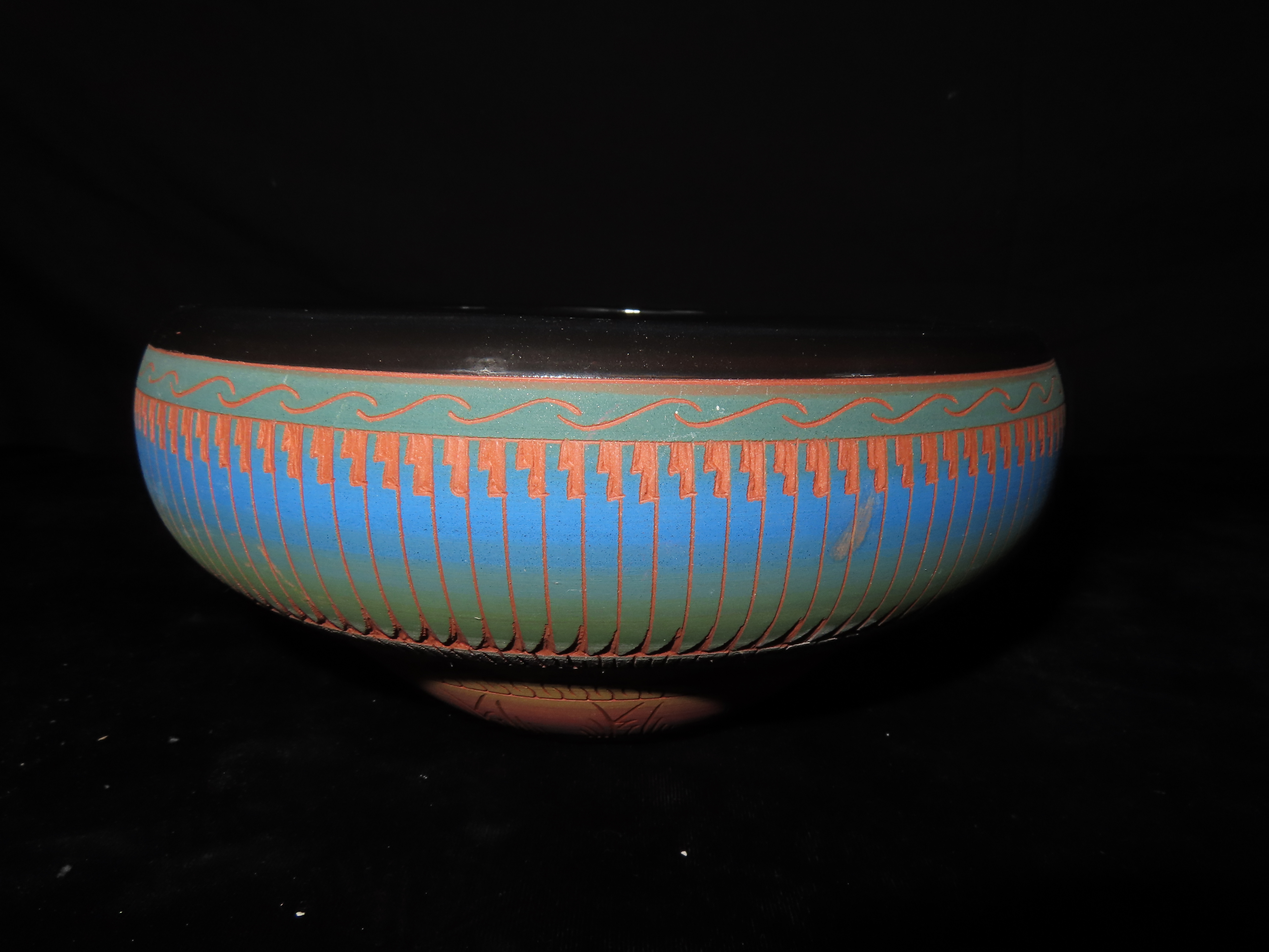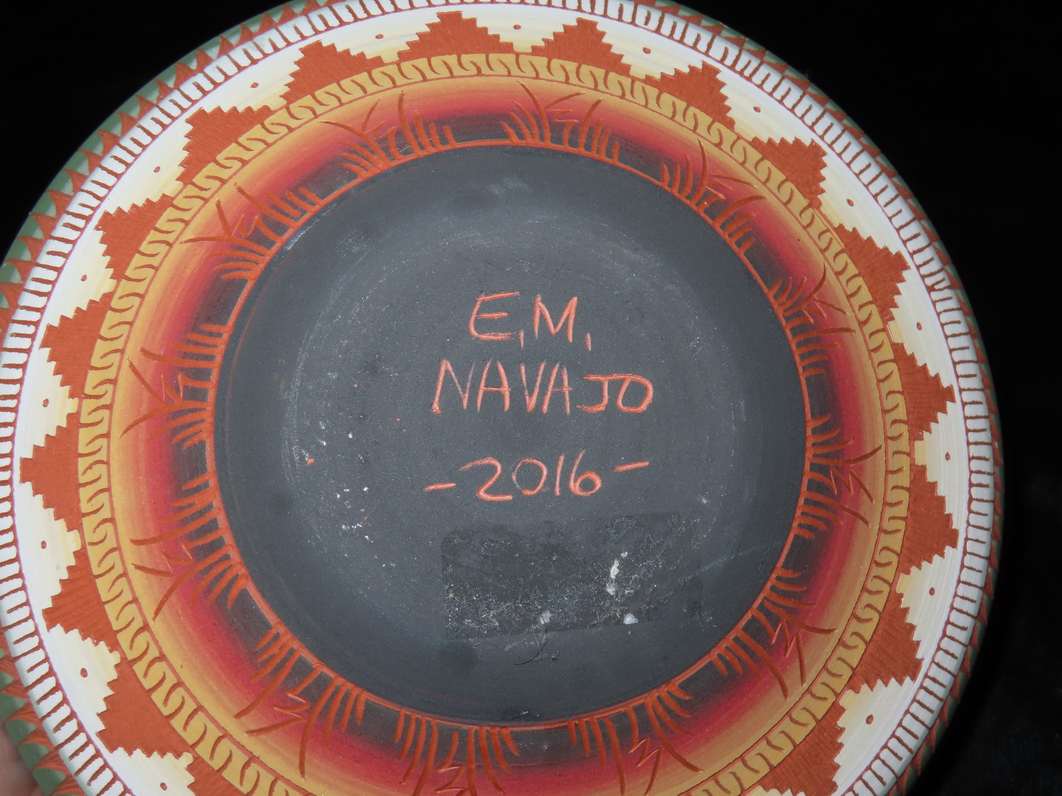 Authentic Native American Hand-crafted Pottery from the American Southwest, signed EM Navajo 2016; see photos for artist signature(if available) and approx. sizes. Key words: Native American, Indian, Signed, Navajo, Southwest, Pottery, Kokopelli, Fetish, Animal, Effigy, Anthropomorphic, Horse Hair, Terra Cotta, Hand-crafted, Fired, Glazed, Painted, Vintage, Santa Clara, Redware, Hopi, Acoma, Wedding Vase, Bowl, Vessel, Signed, Clay, Bear, Turtle, Canoe, Totem Pole, Totem, Anasazi, Cliff Dwelling, Vase, Urn, Dish, Red Clay, Black-on-black ware, Mud Hut, Incense, Lidded Box, Lidded bowl, University, Art, Project, Souvenir, Trade, Tourist, Tourism, Reservation, Hand made, New Mexico, Arizona, Red, Green, Blue, Yellow, Orange, Purple,Black