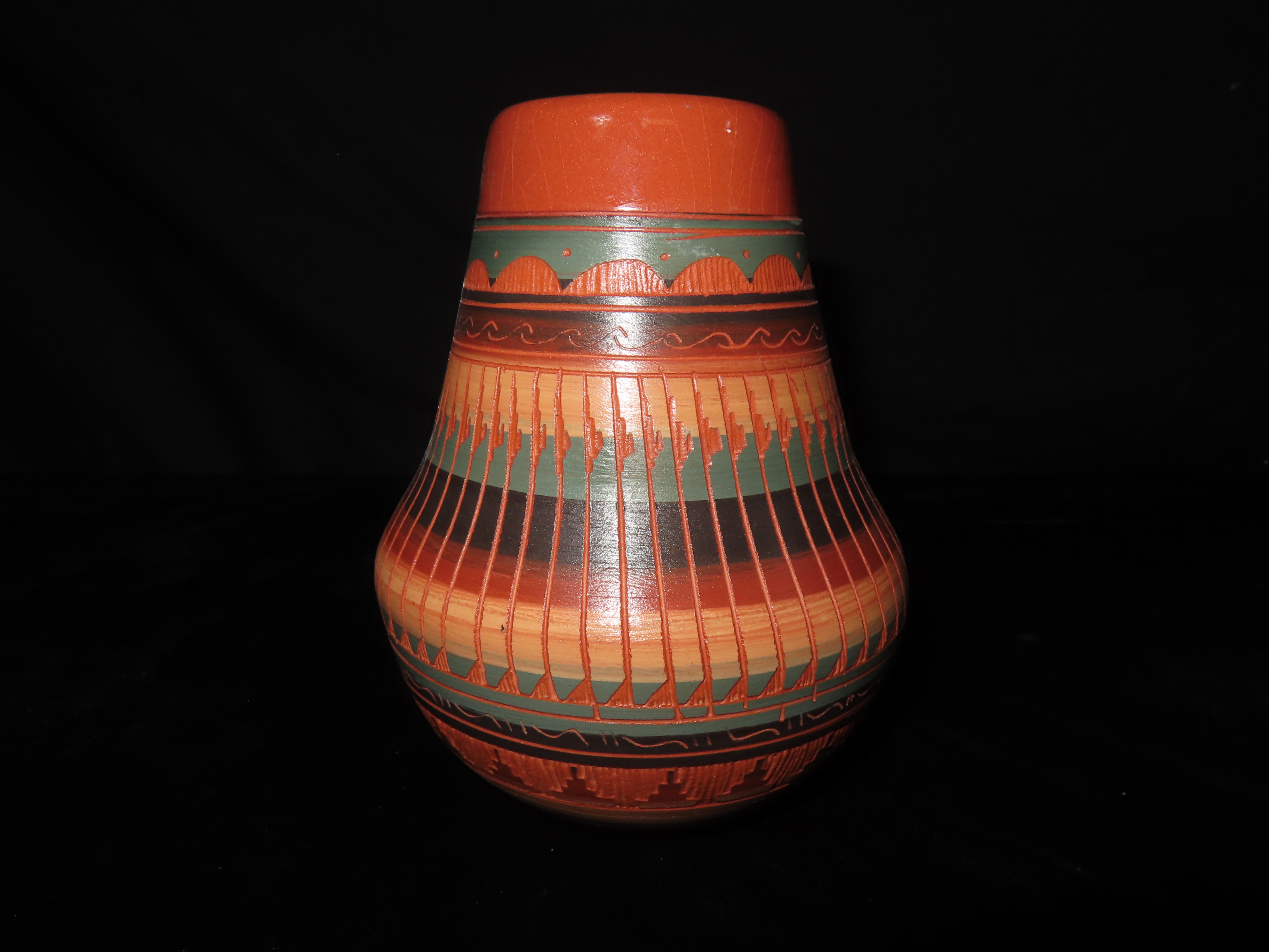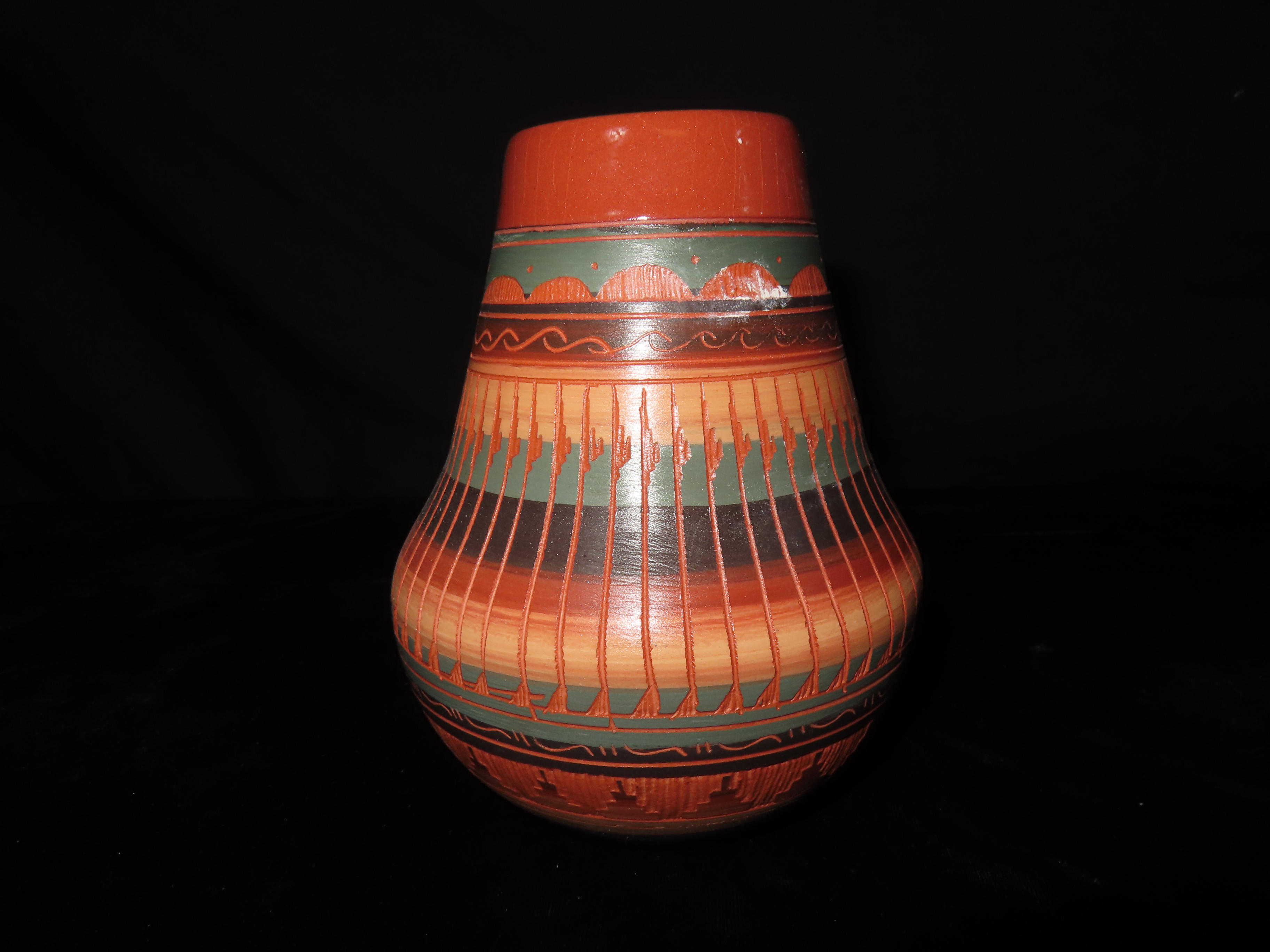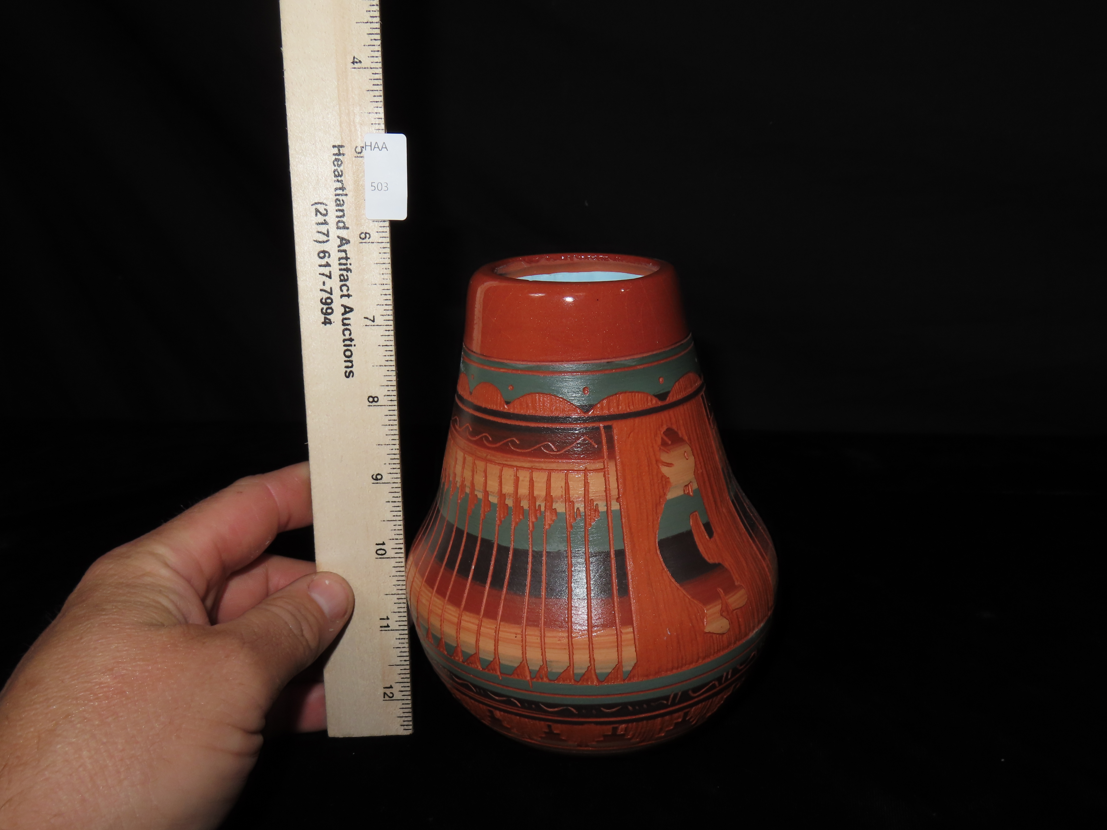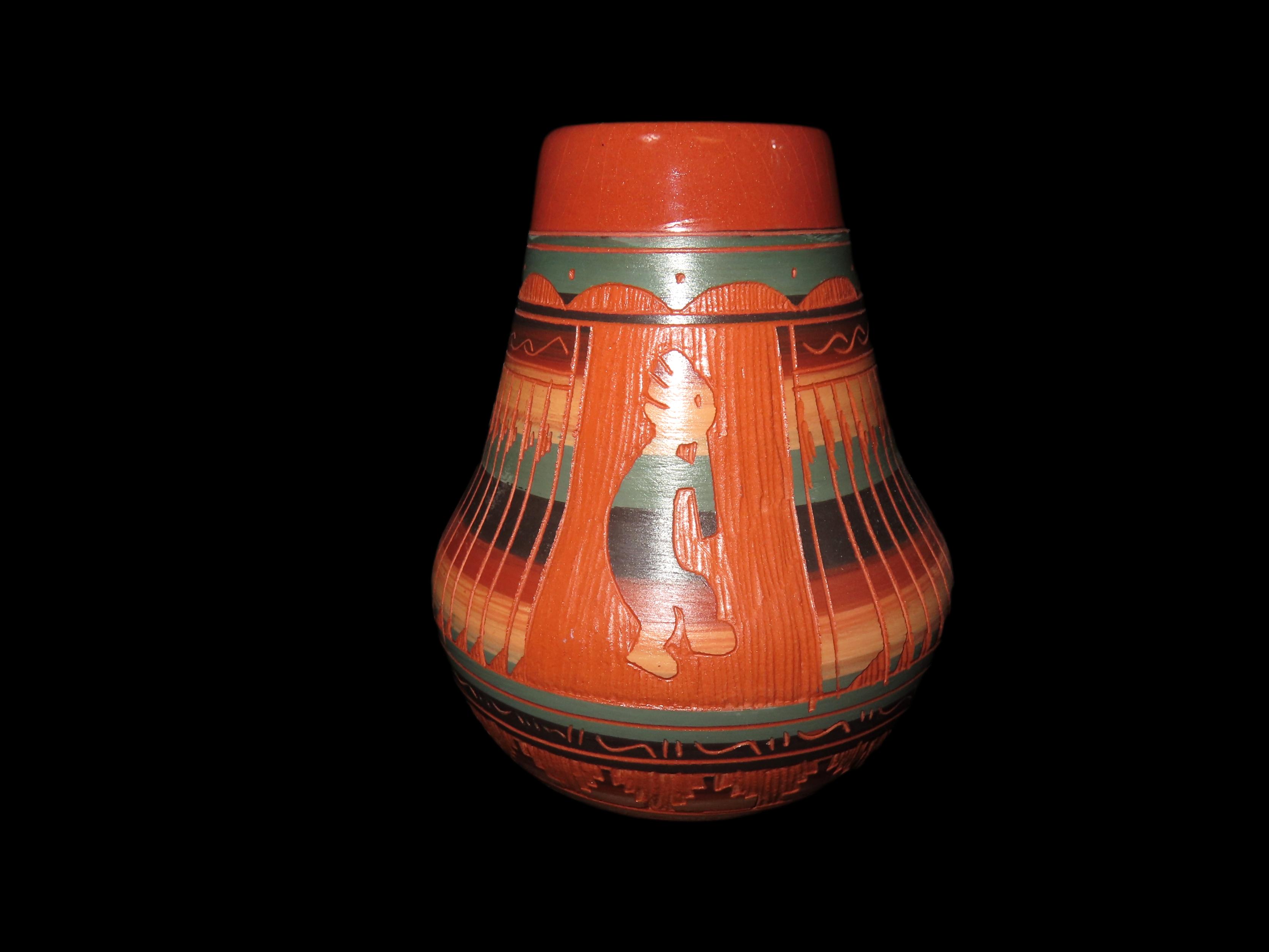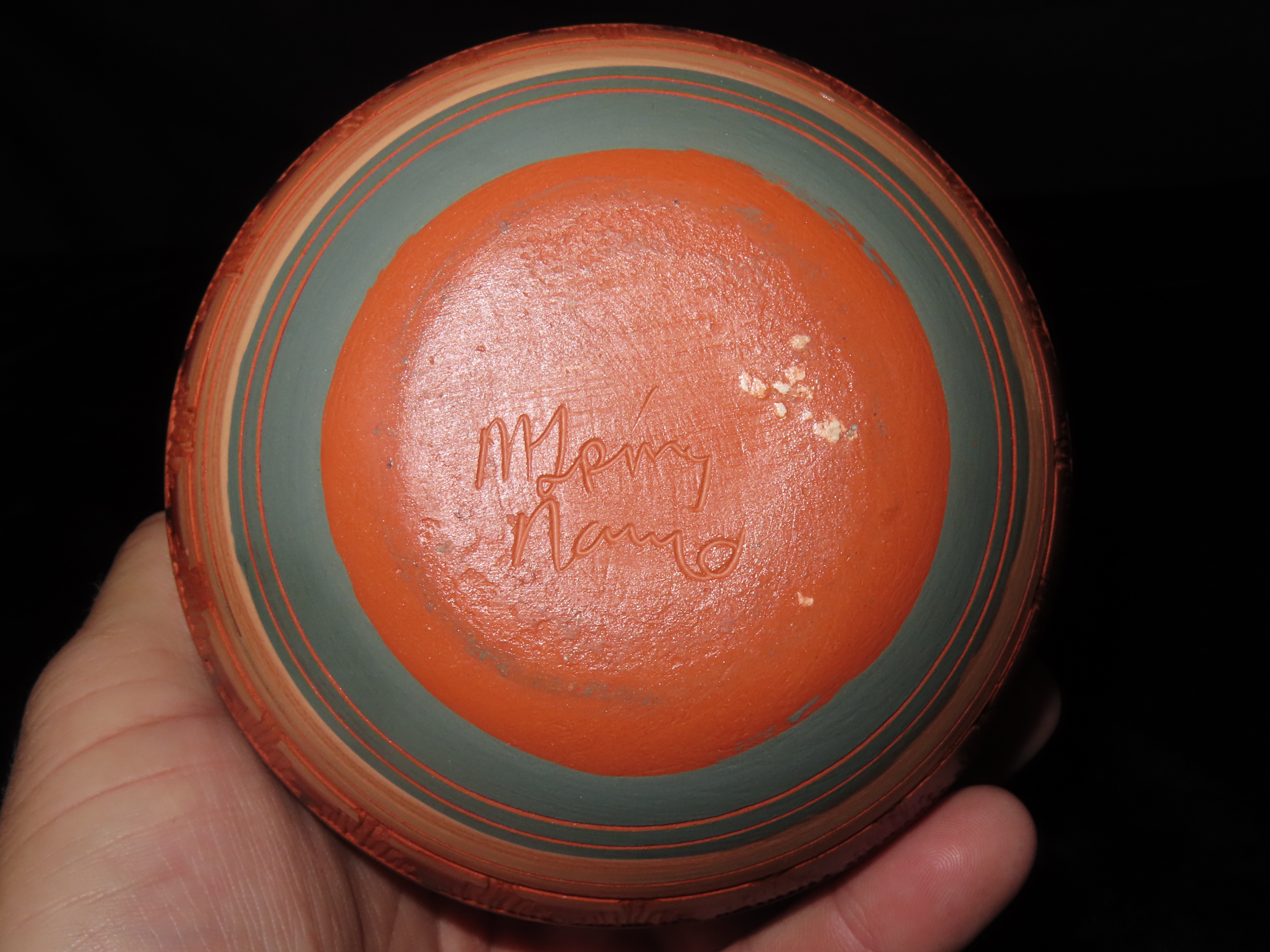 Authentic Native American Hand-crafted Pottery from the American Southwest, signed M ? Navajo; see photos for artist signature(if available) and approx. sizes. Key words: Native American, Indian, Signed, Navajo, Southwest, Pottery, Kokopelli, Fetish, Animal, Effigy, Anthropomorphic, Horse Hair, Terra Cotta, Hand-crafted, Fired, Glazed, Painted, Vintage, Santa Clara, Redware, Hopi, Acoma, Wedding Vase, Bowl, Vessel, Signed, Clay, Bear, Turtle, Canoe, Totem Pole, Totem, Anasazi, Cliff Dwelling, Vase, Urn, Dish, Red Clay, Black-on-black ware, Mud Hut, Incense, Lidded Box, Lidded bowl, University, Art, Project, Souvenir, Trade, Tourist, Tourism, Reservation, Hand made, New Mexico, Arizona, Red, Green, Blue, Yellow, Orange, Purple,Black