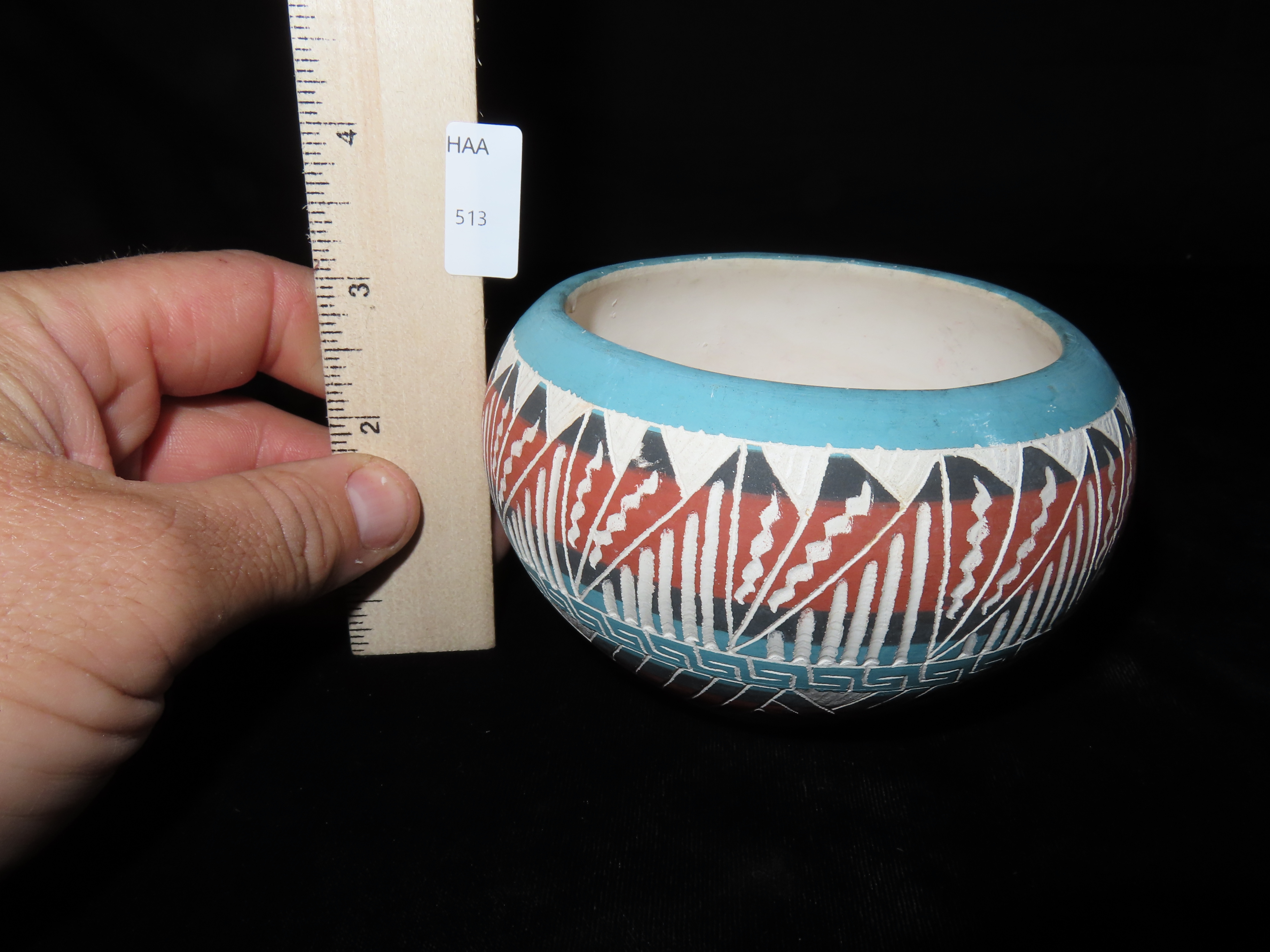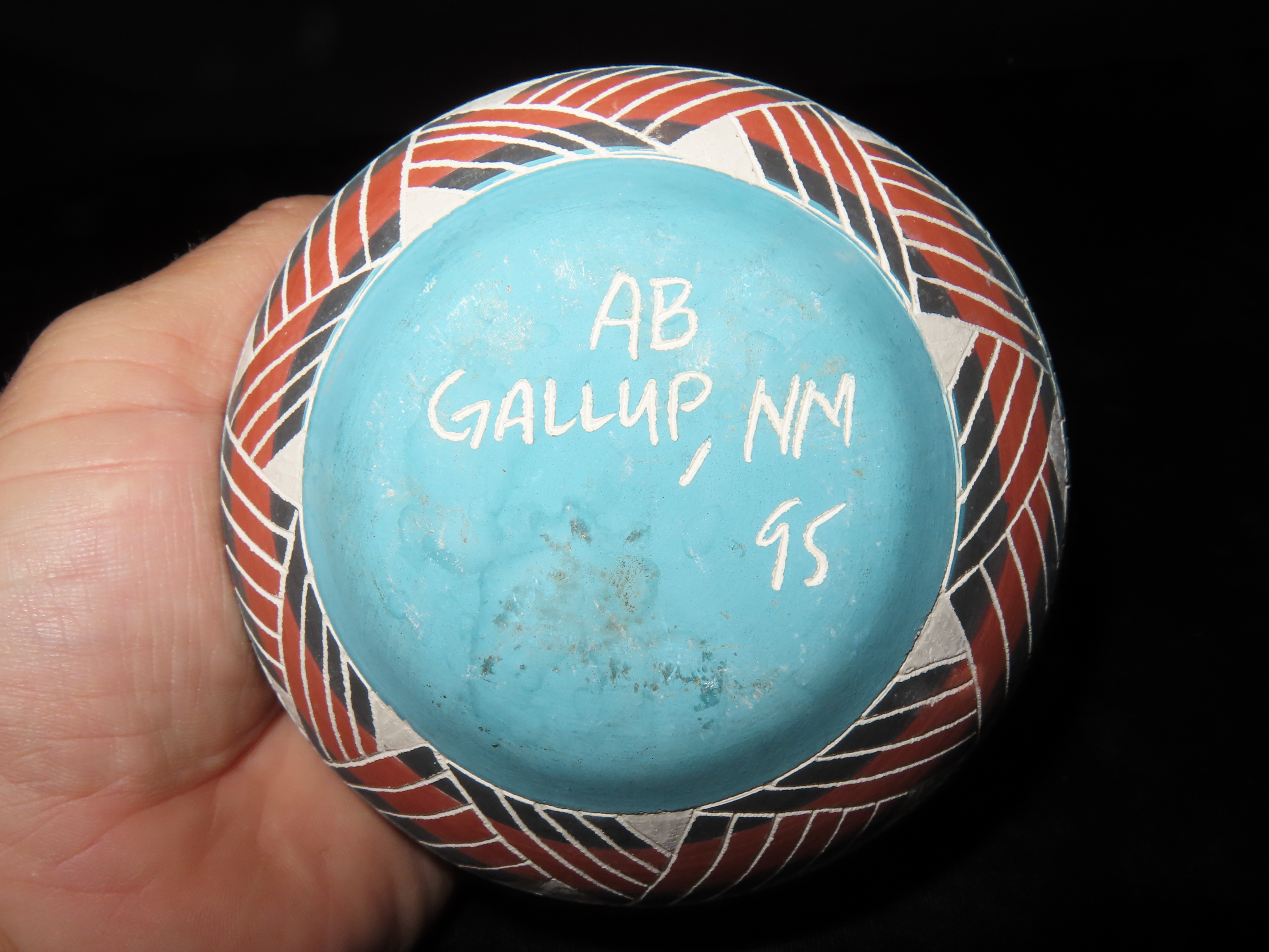 Authentic Native American Hand-crafted Pottery from the American Southwest, signed A.P. Gallup NM ’95; see photos for artist signature(if available) and approx. sizes. Key words: Native American, Indian, Signed, Navajo, Southwest, Pottery, Kokopelli, Fetish, Animal, Effigy, Anthropomorphic, Horse Hair, Terra Cotta, Hand-crafted, Fired, Glazed, Painted, Vintage, Santa Clara, Redware, Hopi, Acoma, Wedding Vase, Bowl, Vessel, Signed, Clay, Bear, Turtle, Canoe, Totem Pole, Totem, Anasazi, Cliff Dwelling, Vase, Urn, Dish, Red Clay, Black-on-black ware, Mud Hut, Incense, Lidded Box, Lidded bowl, University, Art, Project, Souvenir, Trade, Tourist, Tourism, Reservation, Hand made, New Mexico, Arizona, Red, Green, Blue, Yellow, Orange, Purple,Black