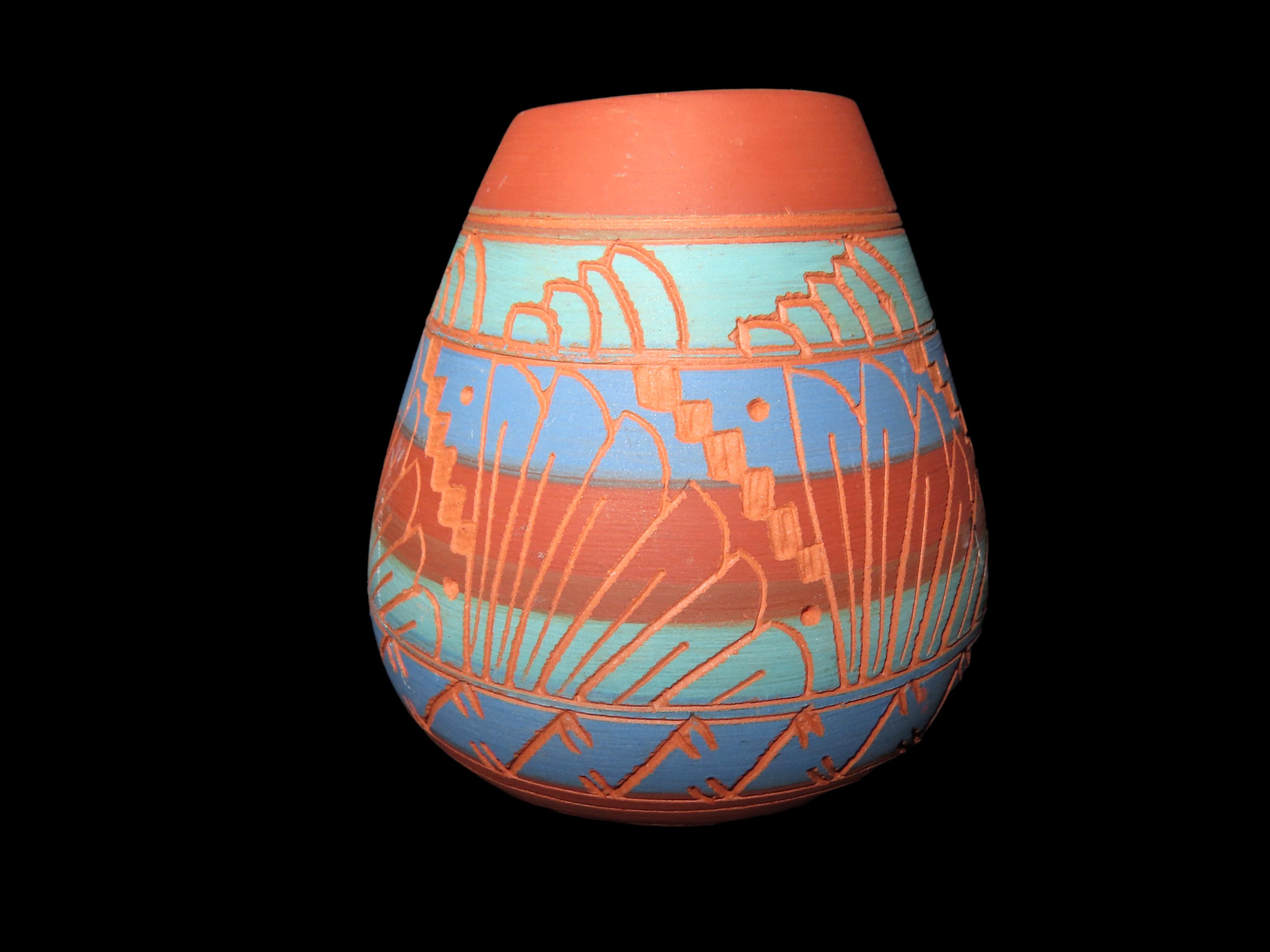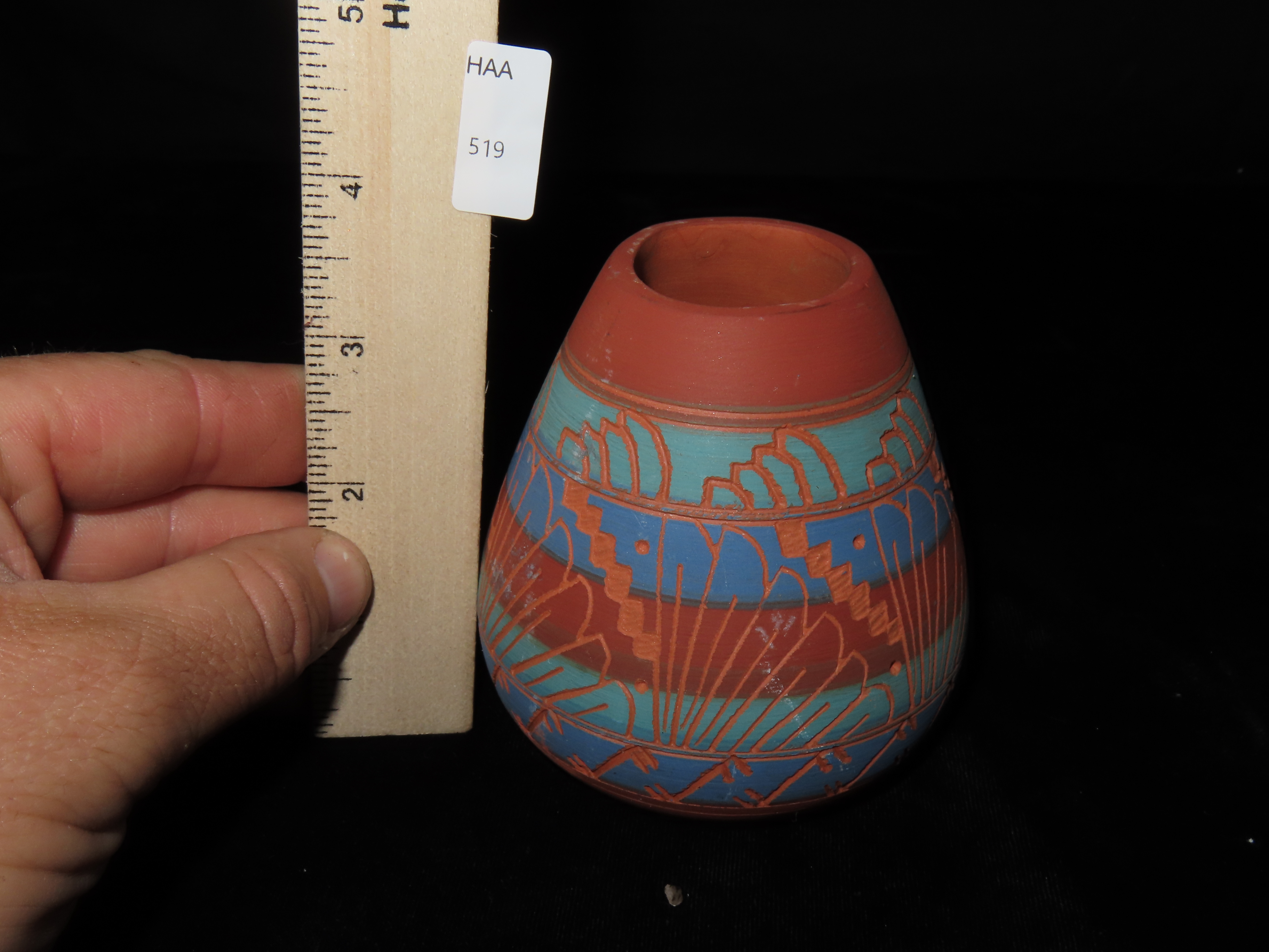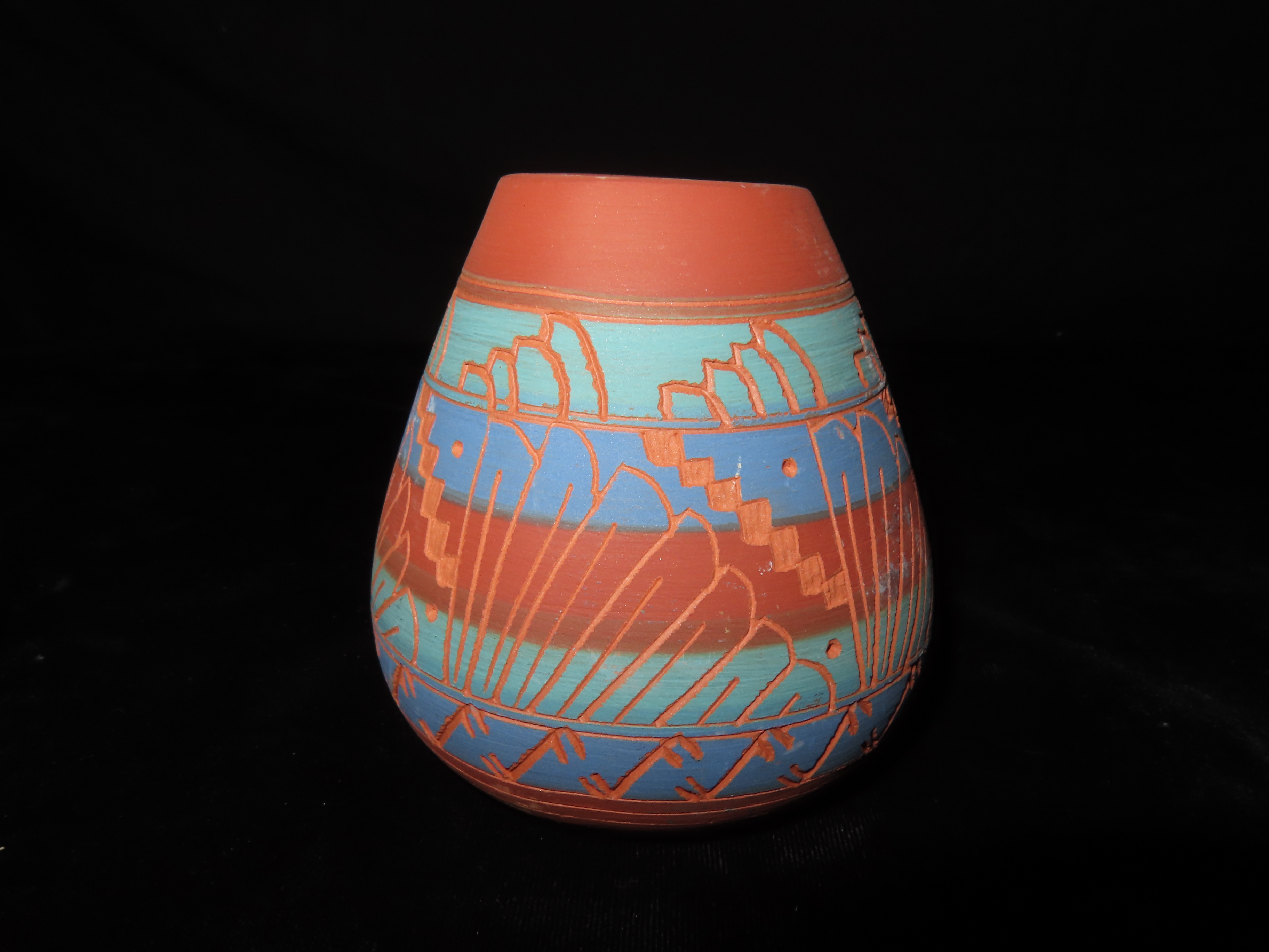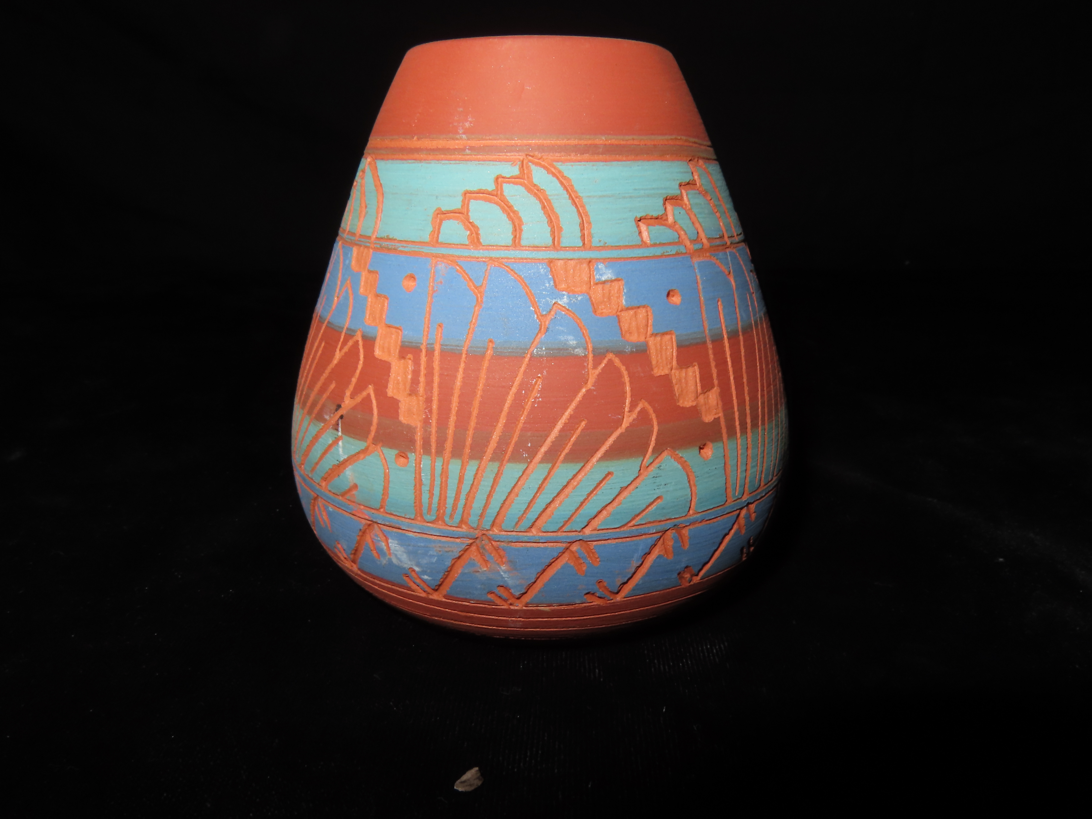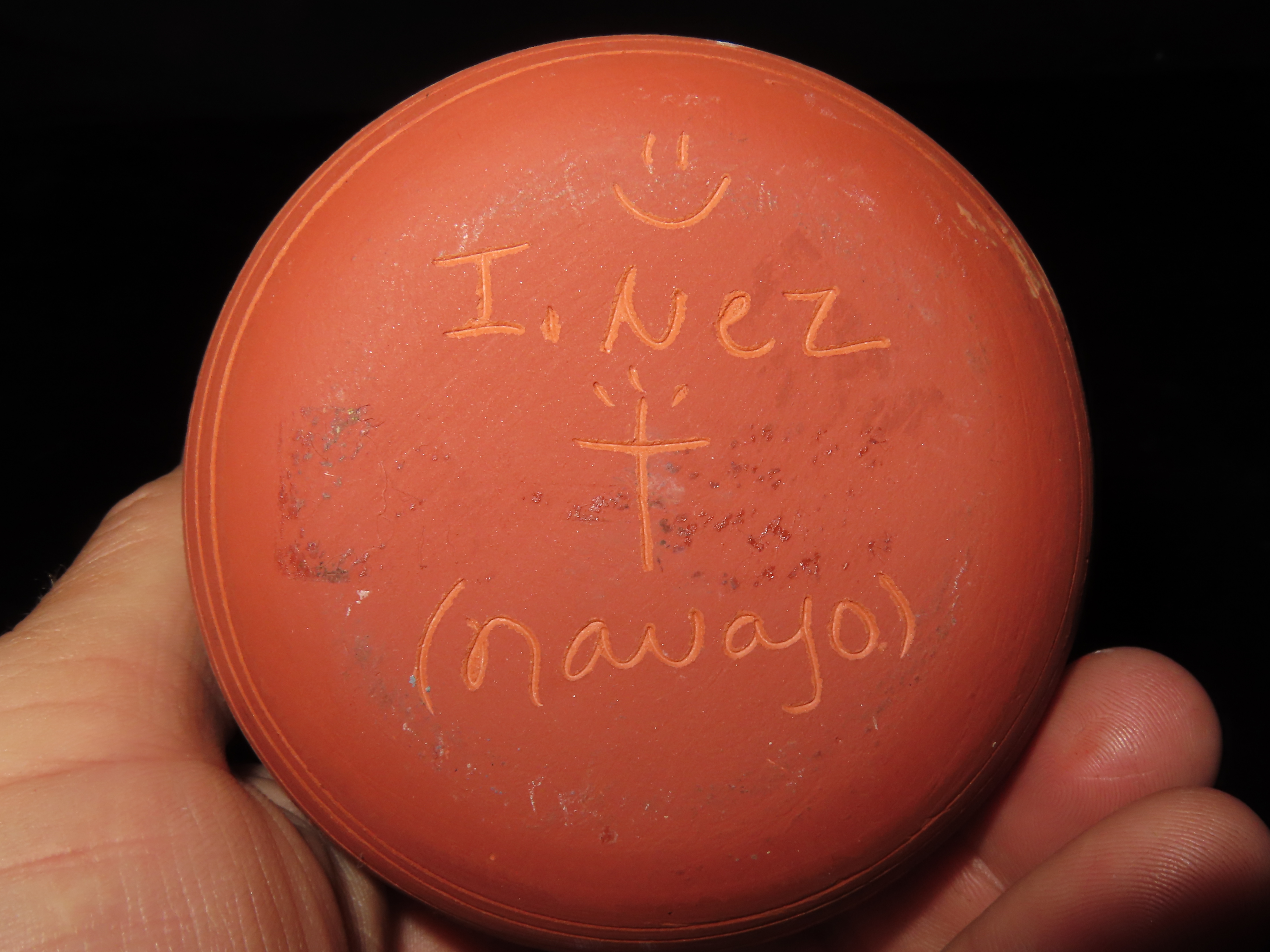 Authentic Native American Hand-crafted Pottery from the American Southwest, signed I.Nez Navajo; see photos for artist signature(if available) and approx. sizes. Key words: Native American, Indian, Signed, Navajo, Southwest, Pottery, Kokopelli, Fetish, Animal, Effigy, Anthropomorphic, Horse Hair, Terra Cotta, Hand-crafted, Fired, Glazed, Painted, Vintage, Santa Clara, Redware, Hopi, Acoma, Wedding Vase, Bowl, Vessel, Signed, Clay, Bear, Turtle, Canoe, Totem Pole, Totem, Anasazi, Cliff Dwelling, Vase, Urn, Dish, Red Clay, Black-on-black ware, Mud Hut, Incense, Lidded Box, Lidded bowl, University, Art, Project, Souvenir, Trade, Tourist, Tourism, Reservation, Hand made, New Mexico, Arizona, Red, Green, Blue, Yellow, Orange, Purple,Black