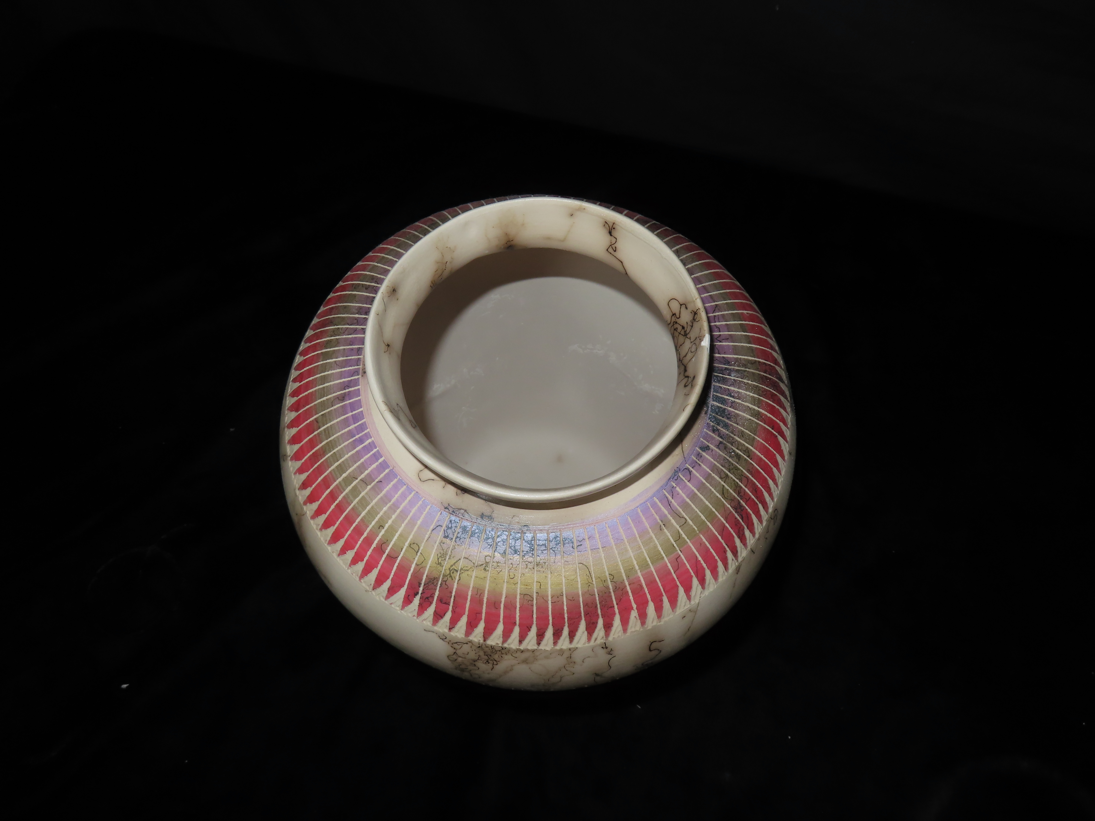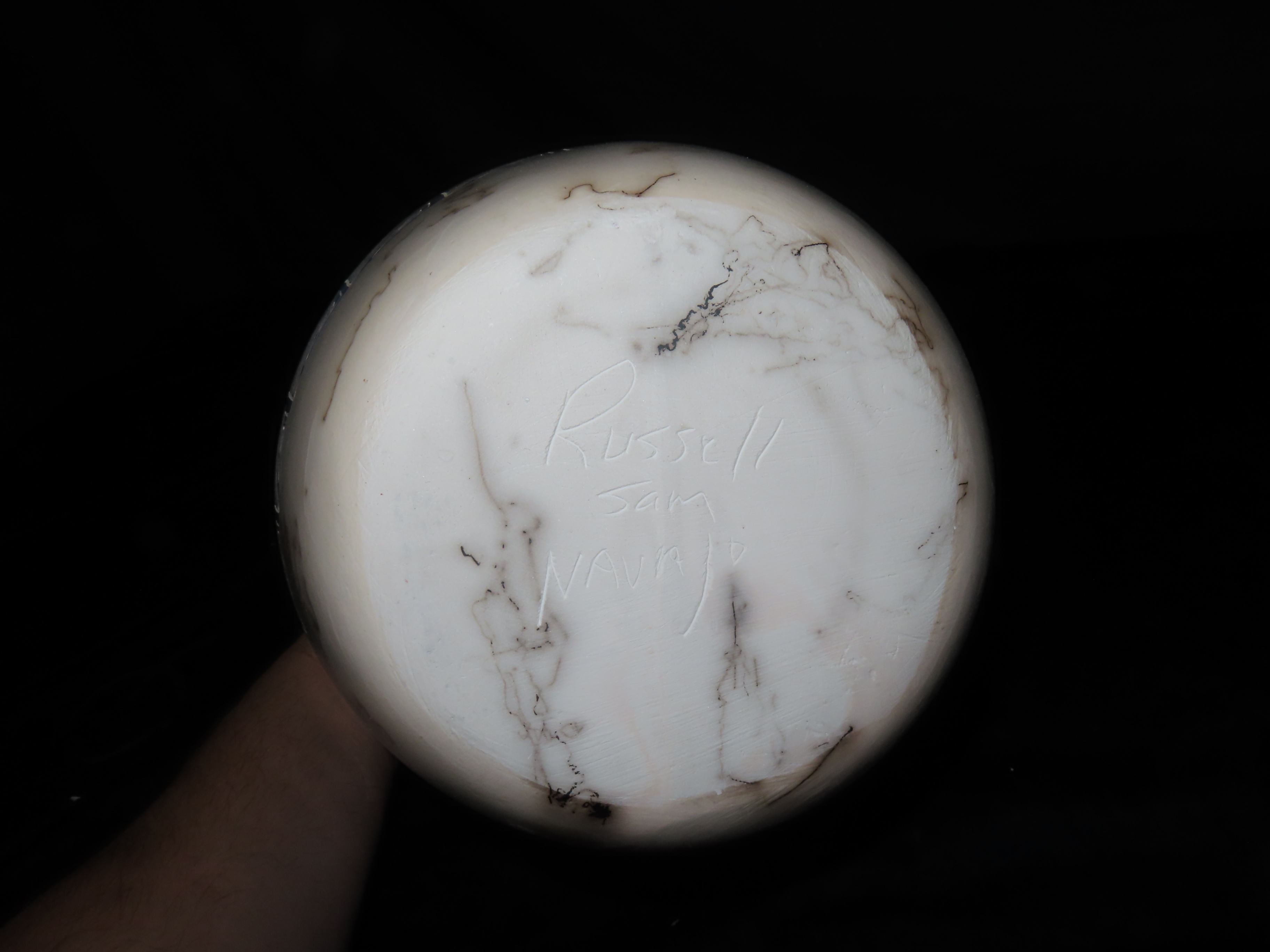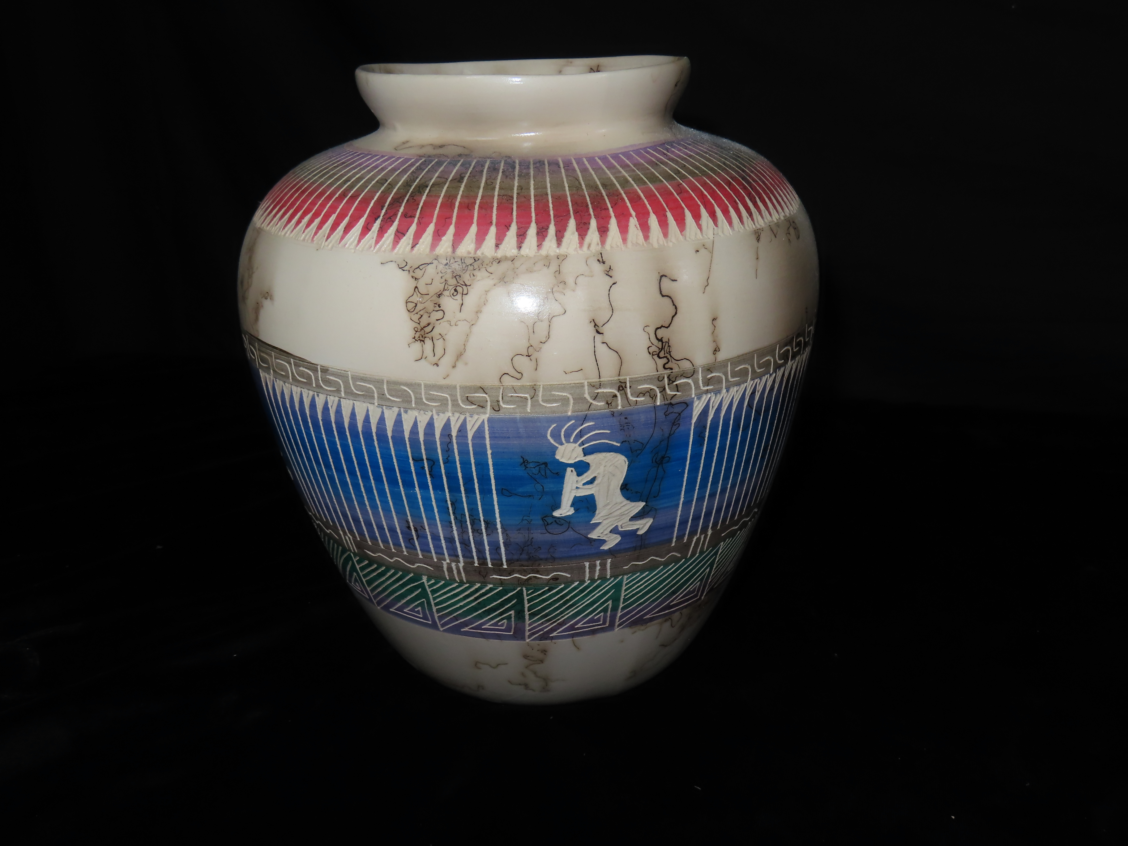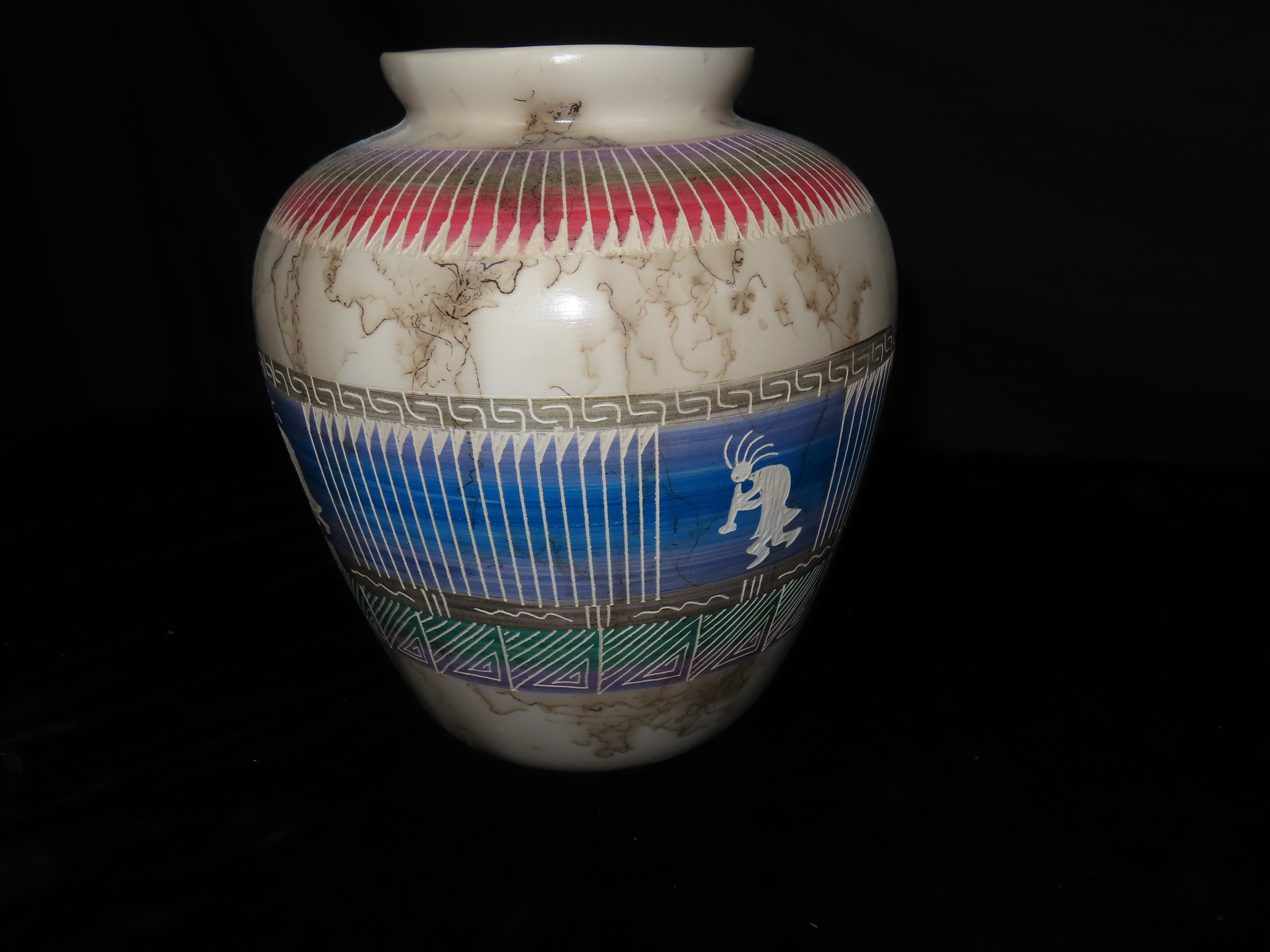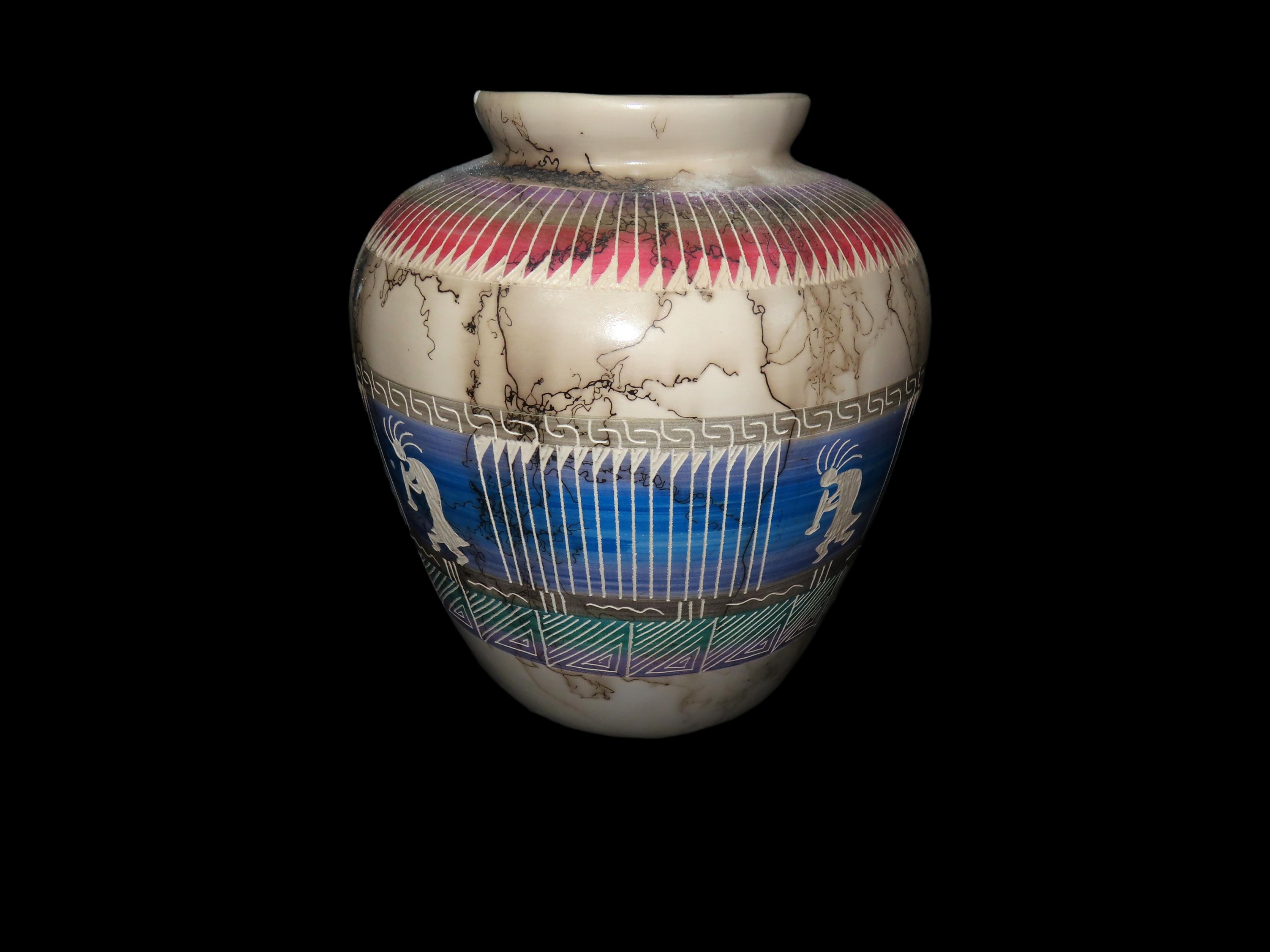 Authentic Native American Hand-crafted Pottery from the American Southwest, signed Russell Jam Navajo; see photos for artist signature(if available) and approx. sizes. Key words: Native American, Indian, Signed, Navajo, Southwest, Pottery, Kokopelli, Fetish, Animal, Effigy, Anthropomorphic, Horse Hair, Terra Cotta, Hand-crafted, Fired, Glazed, Painted, Vintage, Santa Clara, Redware, Hopi, Acoma, Wedding Vase, Bowl, Vessel, Signed, Clay, Bear, Turtle, Canoe, Totem Pole, Totem, Anasazi, Cliff Dwelling, Vase, Urn, Dish, Red Clay, Black-on-black ware, Mud Hut, Incense, Lidded Box, Lidded bowl, University, Art, Project, Souvenir, Trade, Tourist, Tourism, Reservation, Hand made, New Mexico, Arizona, Red, Green, Blue, Yellow, Orange, Purple,Black