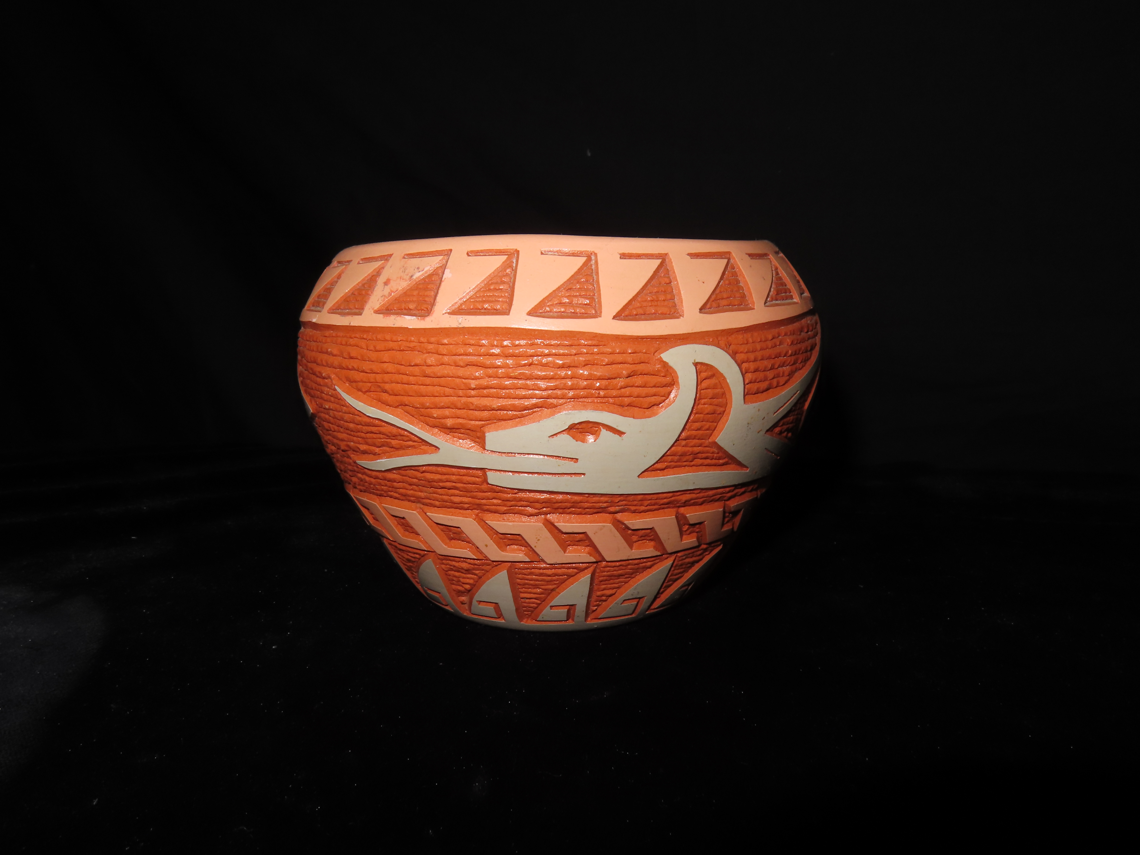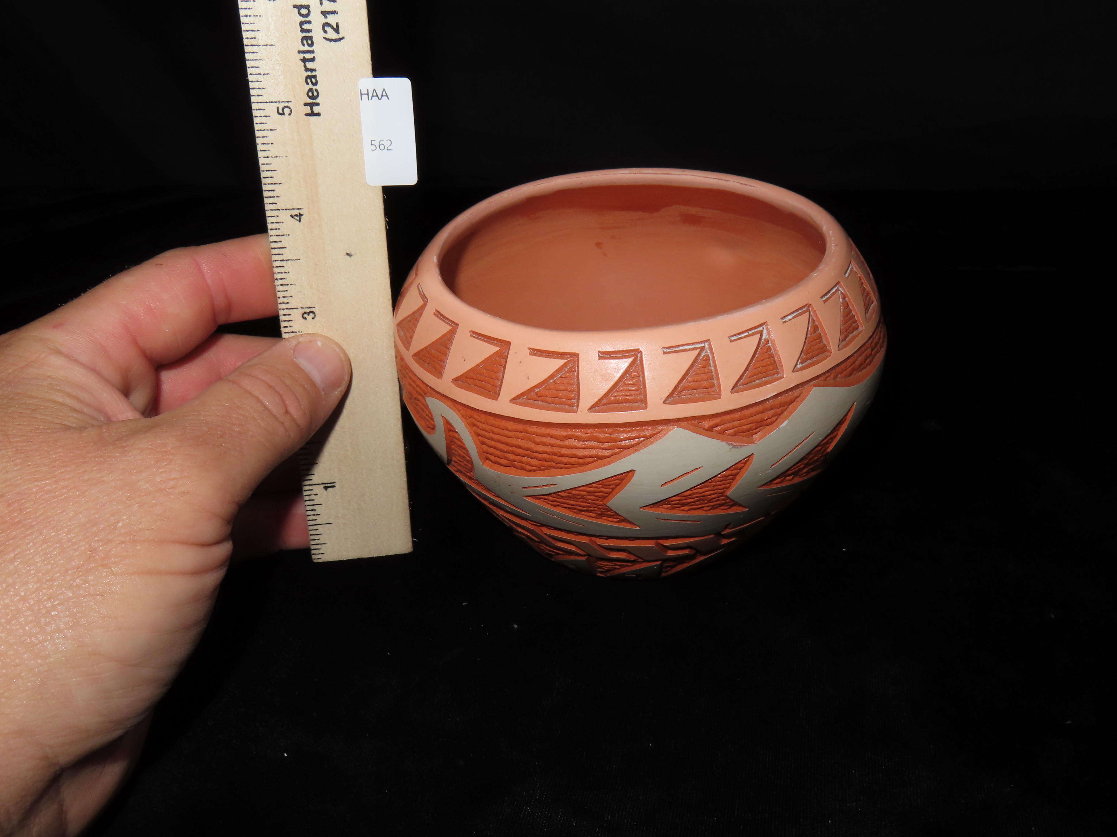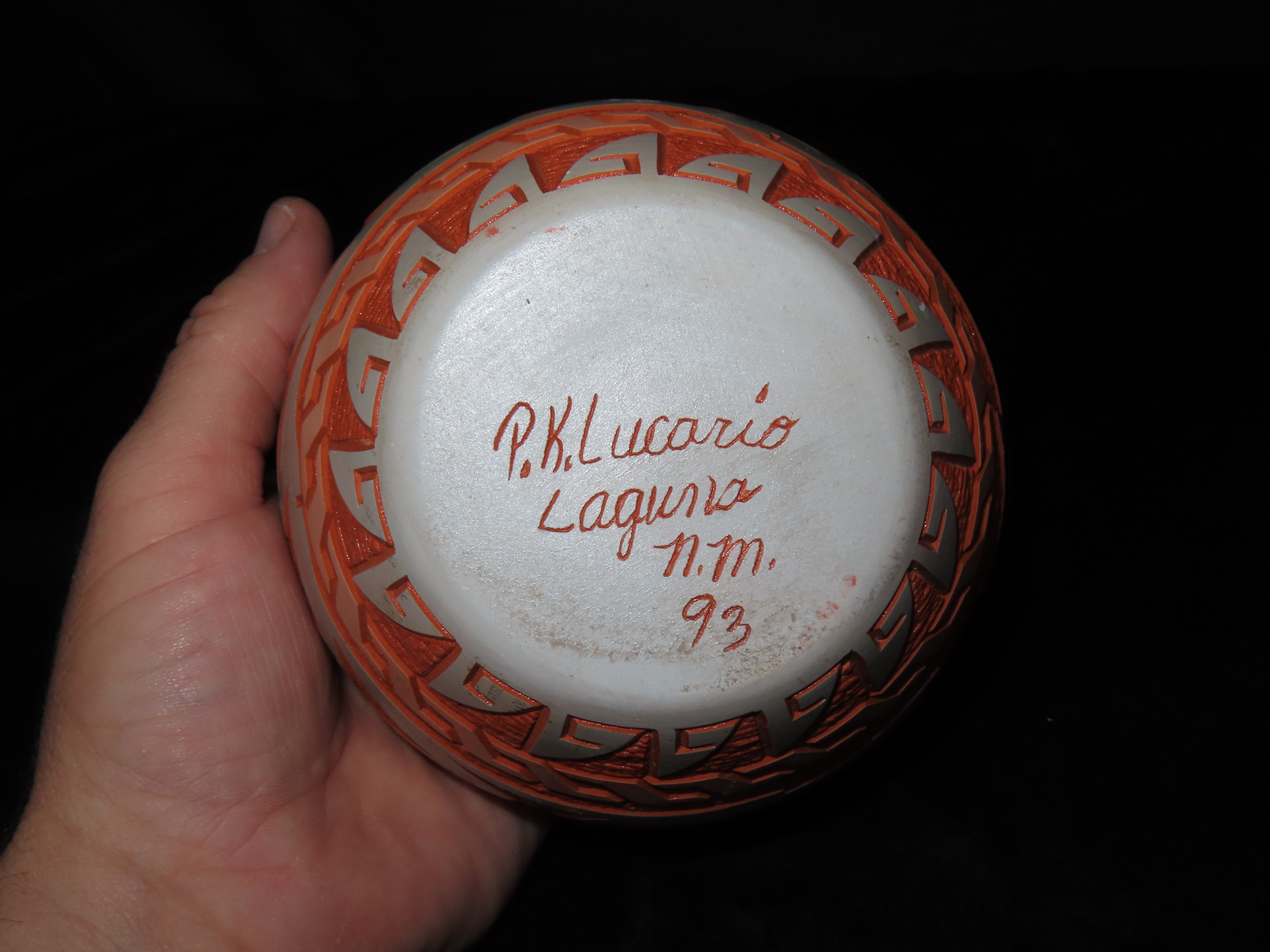 Authentic Native American Hand-crafted Pottery from the American Southwest, signed P.K. Lucario Laguna NM ’93; see photos for artist signature(if available) and approx. sizes. Key words: Native American, Indian, Signed, Navajo, Southwest, Pottery, Kokopelli, Fetish, Animal, Effigy, Anthropomorphic, Horse Hair, Terra Cotta, Hand-crafted, Fired, Glazed, Painted, Vintage, Santa Clara, Redware, Hopi, Acoma, Wedding Vase, Bowl, Vessel, Signed, Clay, Bear, Turtle, Canoe, Totem Pole, Totem, Anasazi, Cliff Dwelling, Vase, Urn, Dish, Red Clay, Black-on-black ware, Mud Hut, Incense, Lidded Box, Lidded bowl, University, Art, Project, Souvenir, Trade, Tourist, Tourism, Reservation, Hand made, New Mexico, Arizona, Red, Green, Blue, Yellow, Orange, Purple,Black