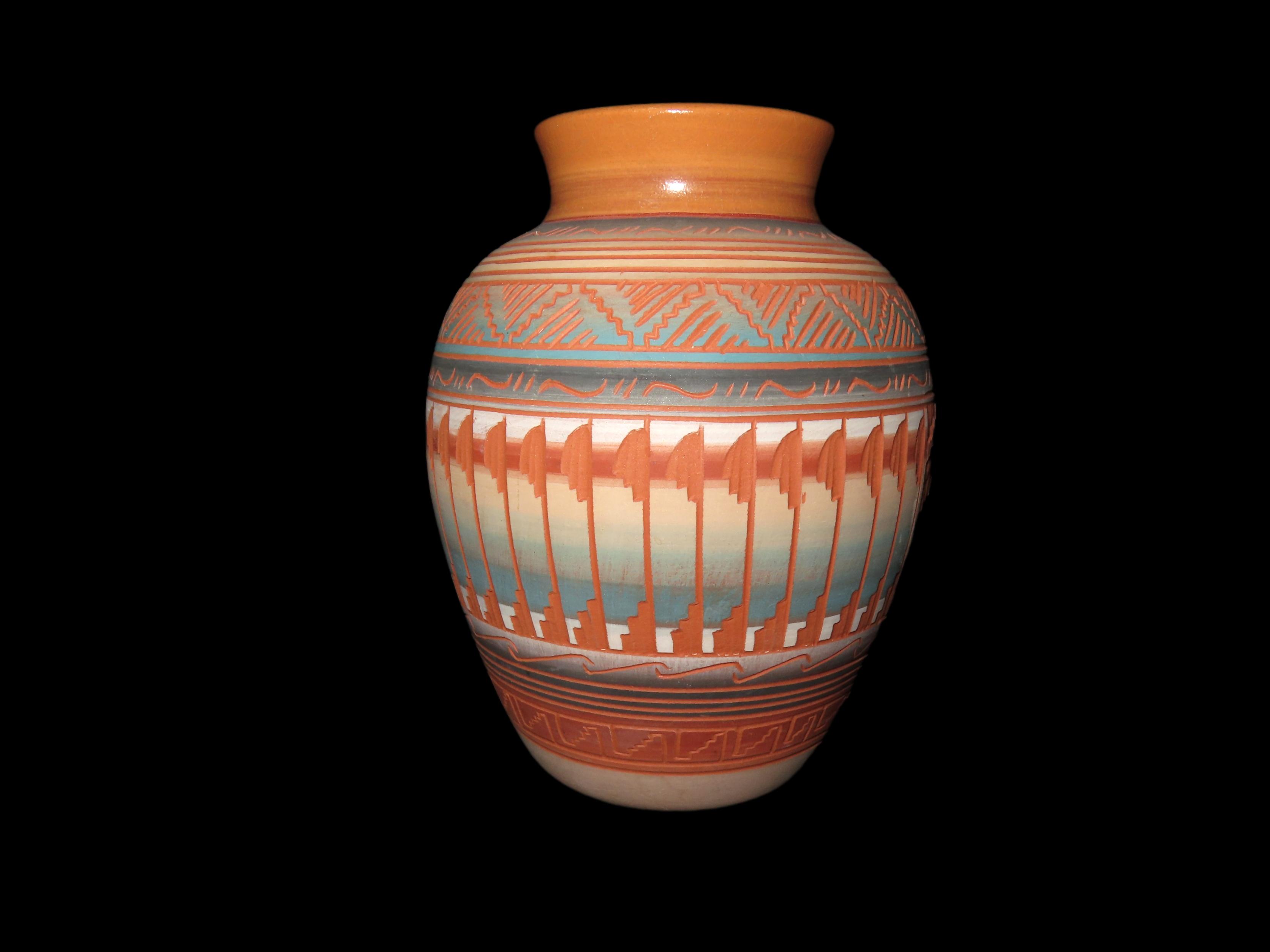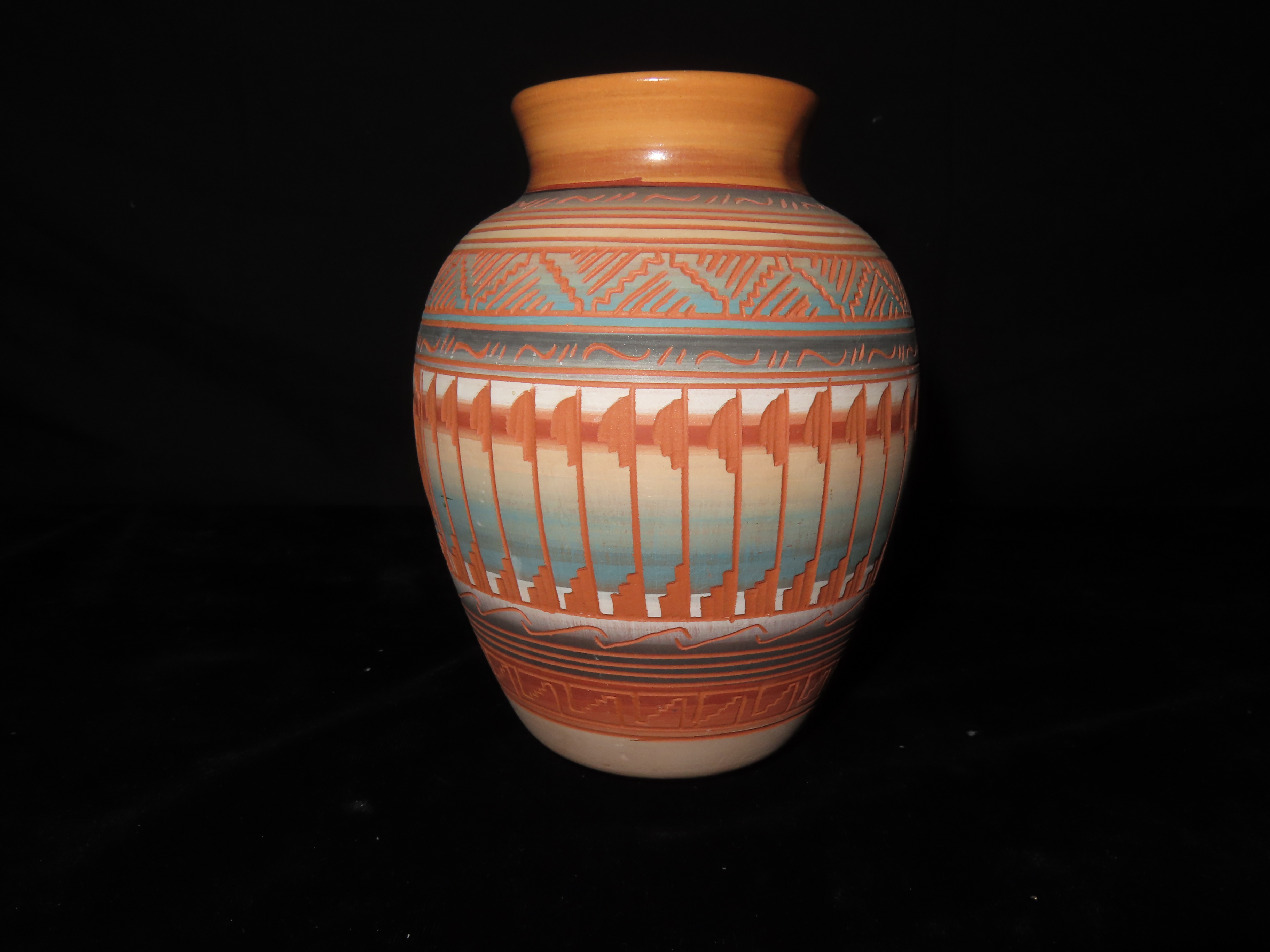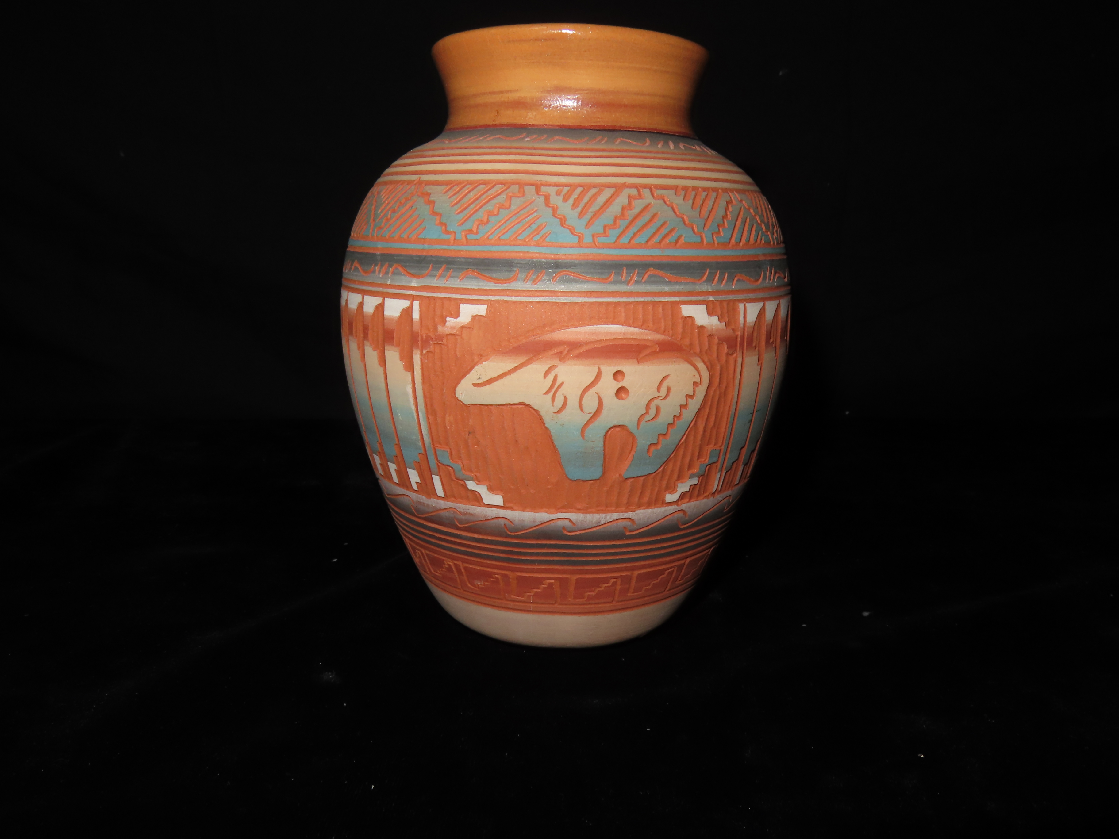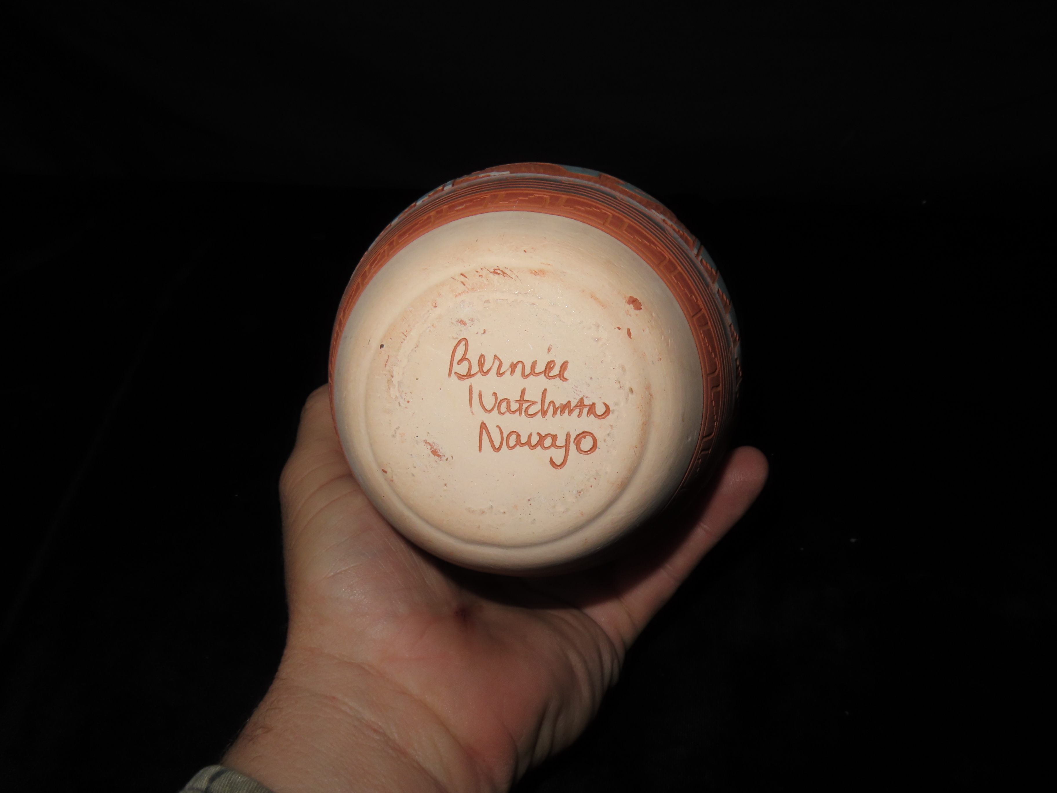 Authentic Native American Hand-crafted Pottery from the American Southwest, signed Bernice Watchman Navajo; see photos for artist signature(if available) and approx. sizes. Key words: Native American, Indian, Signed, Navajo, Southwest, Pottery, Kokopelli, Fetish, Animal, Effigy, Anthropomorphic, Horse Hair, Terra Cotta, Hand-crafted, Fired, Glazed, Painted, Vintage, Santa Clara, Redware, Hopi, Acoma, Wedding Vase, Bowl, Vessel, Signed, Clay, Bear, Turtle, Canoe, Totem Pole, Totem, Anasazi, Cliff Dwelling, Vase, Urn, Dish, Red Clay, Black-on-black ware, Mud Hut, Incense, Lidded Box, Lidded bowl, University, Art, Project, Souvenir, Trade, Tourist, Tourism, Reservation, Hand made, New Mexico, Arizona, Red, Green, Blue, Yellow, Orange, Purple,Black