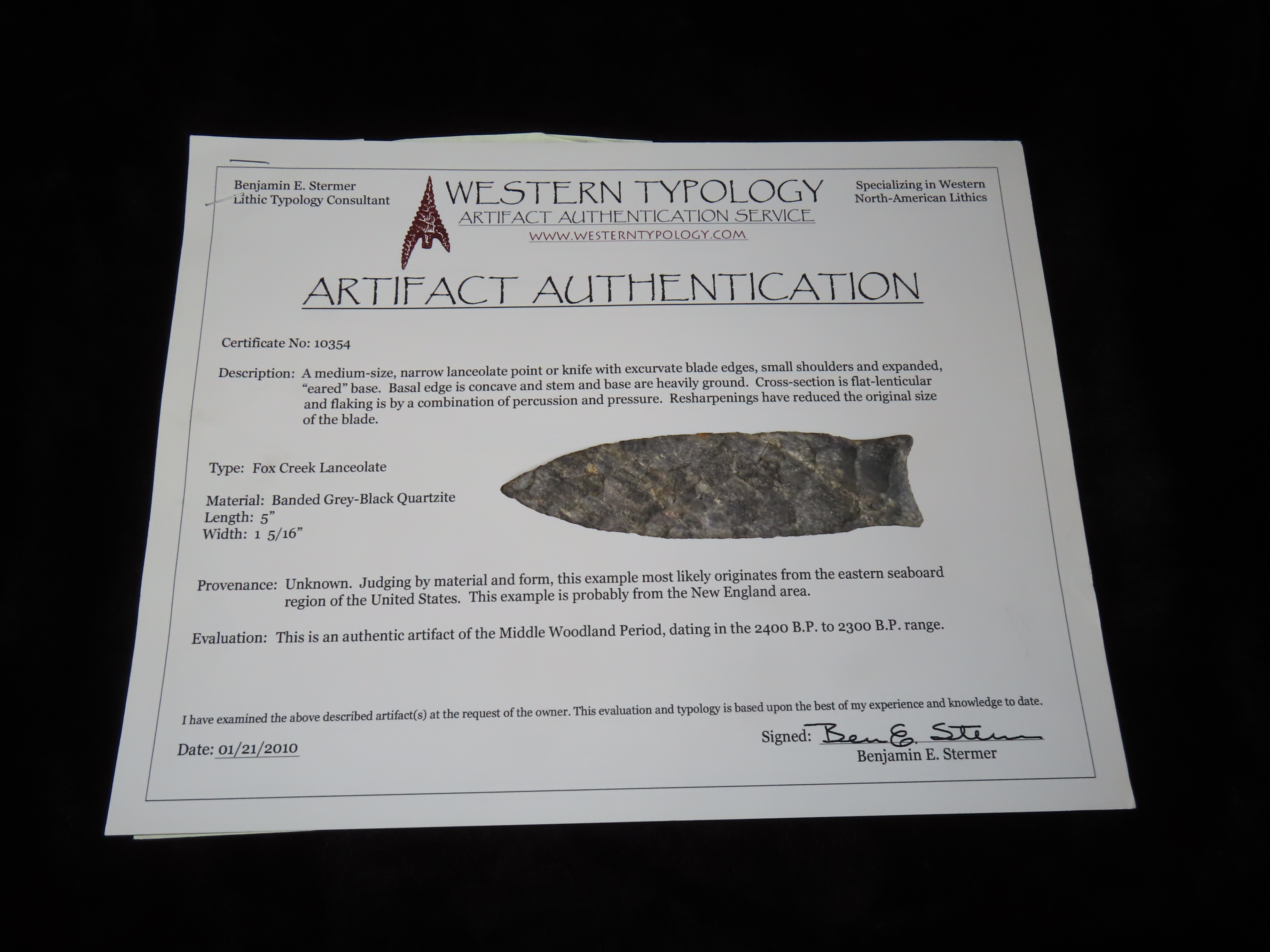 5″ Fox Creek Lanceolate, Stermer COA, found New England area, Ex Duane Schneider Collection