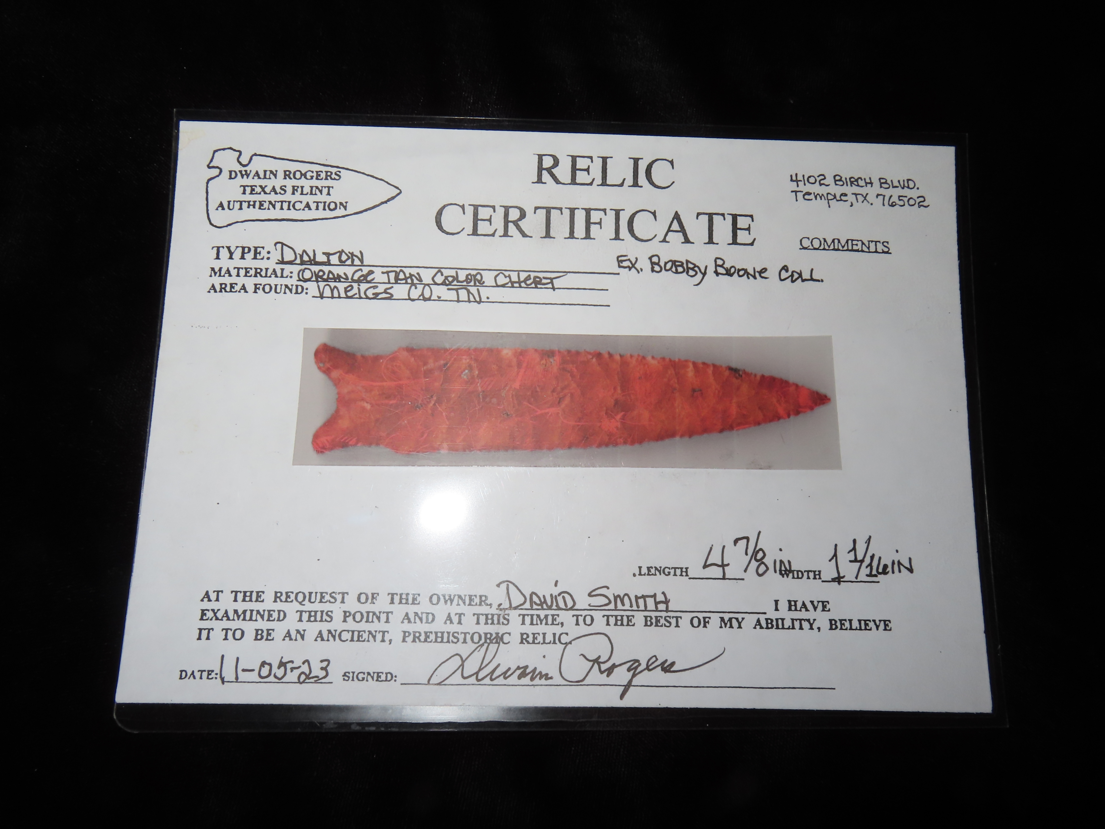 4 7/8" Super Serrated Red Dalton, Rogers COA, found in Meigs Co., Tennessee, Ex David Smith, Ex Duane Schneider Collection